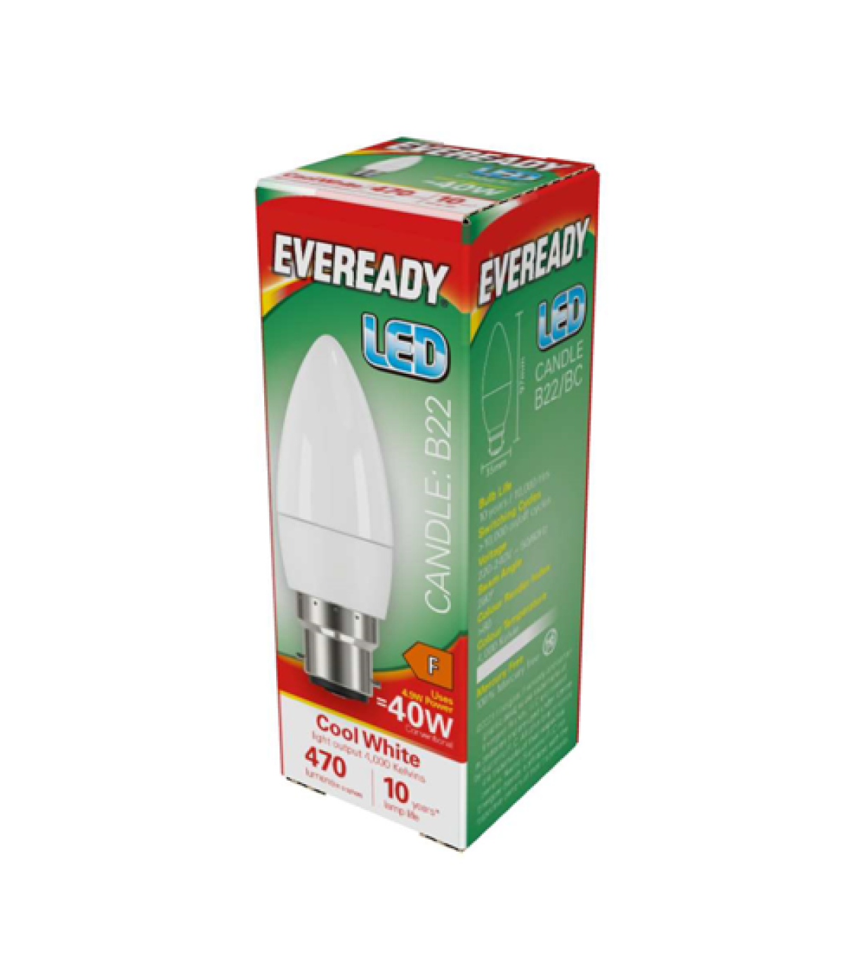 Eveready S14322 LED Candle Bulb 40w B22 (BC) 470lm 4.9W Cool White (Pack of 5) 4.9W / 40W Replacement 470 Lumen 4,000K (Cool White) Non-Dimmable 220-240V Energy Rating F