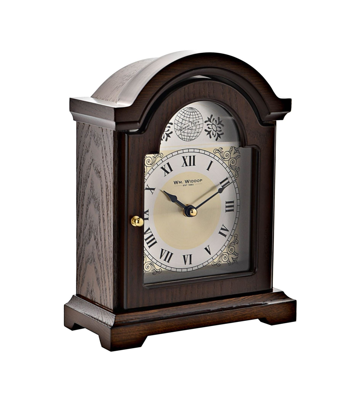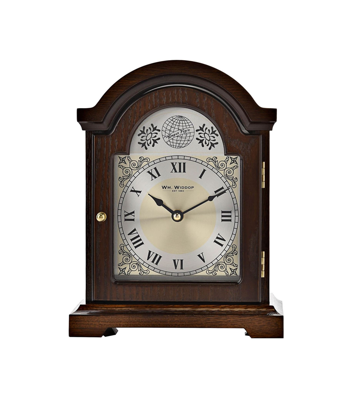 A broken arch mantel clock from WILLIAM WIDDOP�. This beautiful, silver metal faced mantel clock makes a stunning addition to a traditionally decorated home. It features black spade hands, Roman numeral dial, ornate face detail and walnut finish. It is completed by a 'Tempus Fugit' (Time Flies) inscription, along with an openable front panel to allow for cleaning and maintenance. The clock is packaged in a WM Widdop branded box.