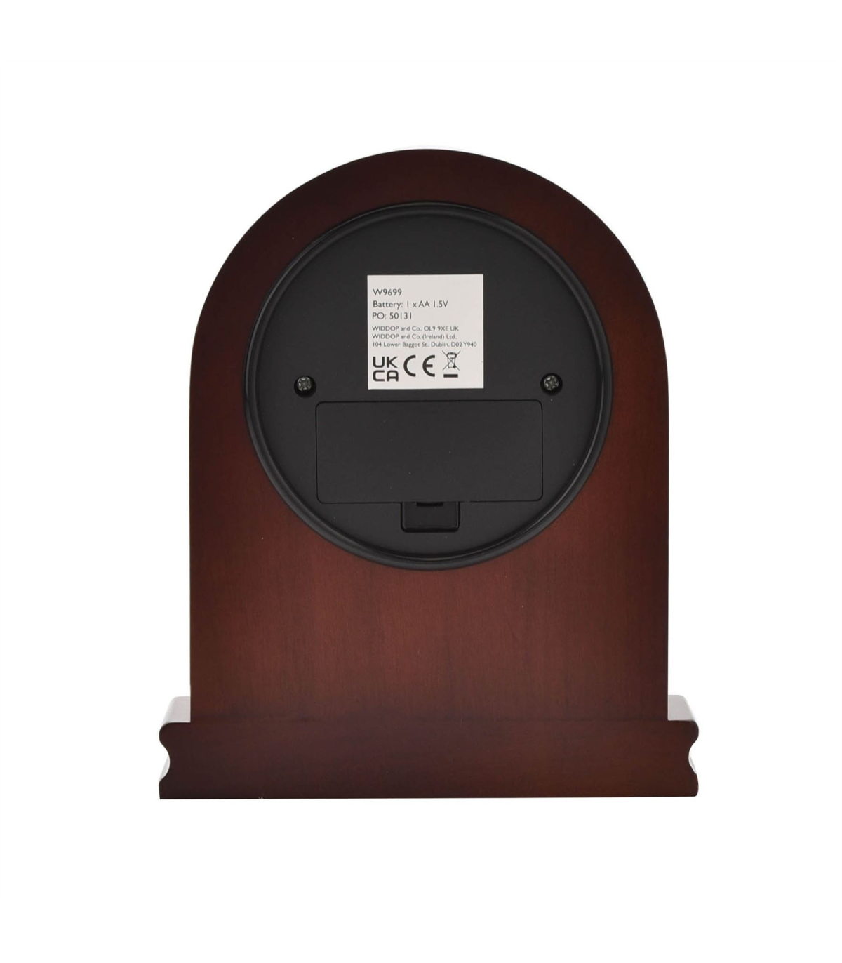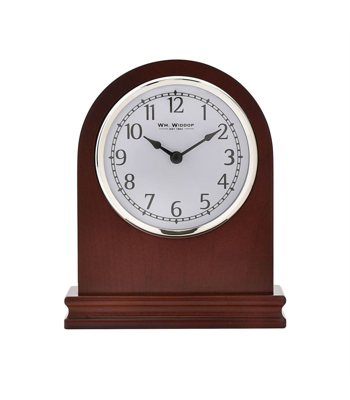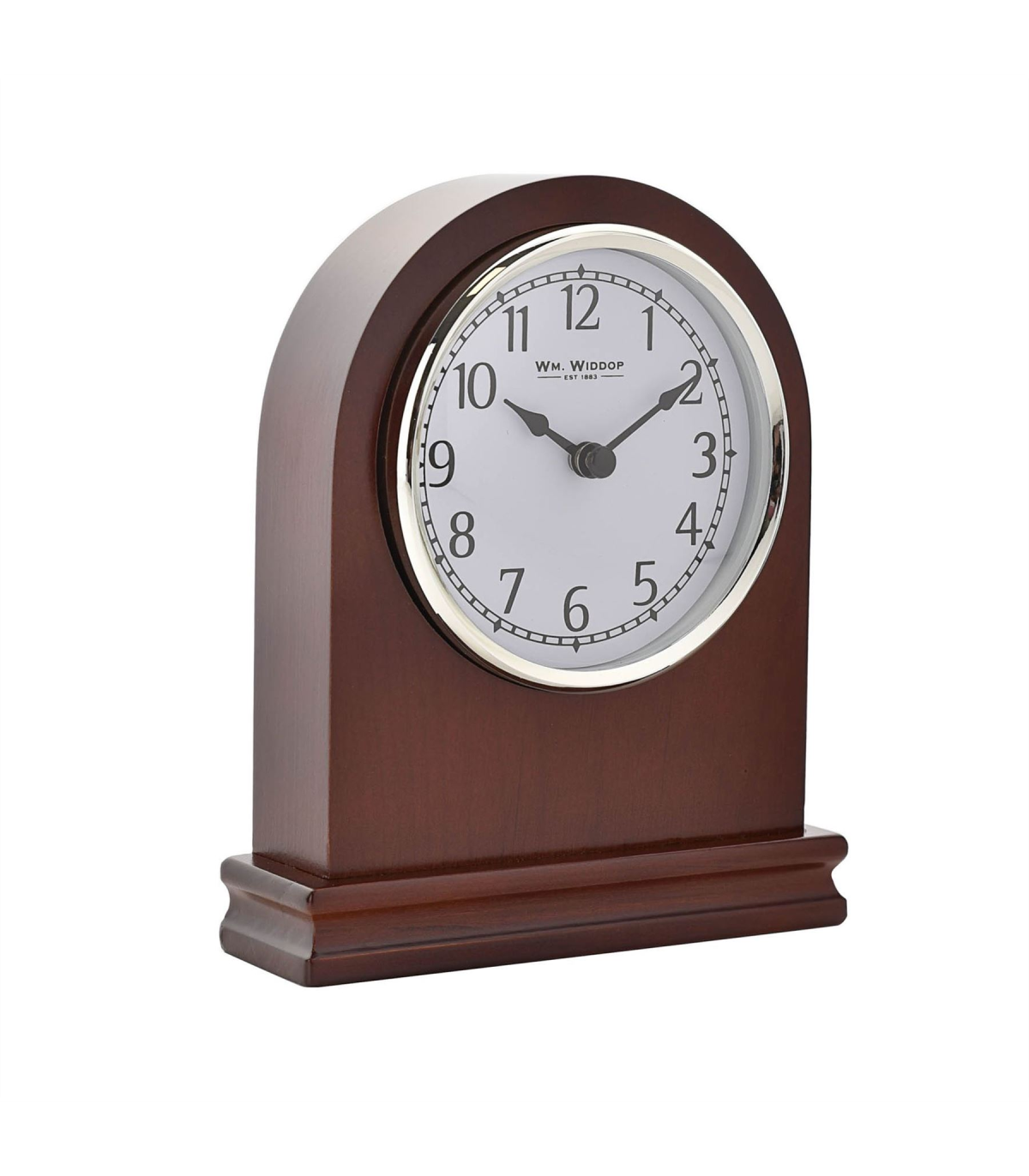 An arched walnut mantel clock from WILLIAM WIDDOP�. This modern take on a classic clock design creates a versatile timepiece to complement any home. The clock�s overriding feature is its stylish and beautifully simple design. The clock face has a white Arabic numeral dial and glistening silver bezel, which complements its surrounding dark wood finish. The clock is packaged in a WM Widdop branded box.