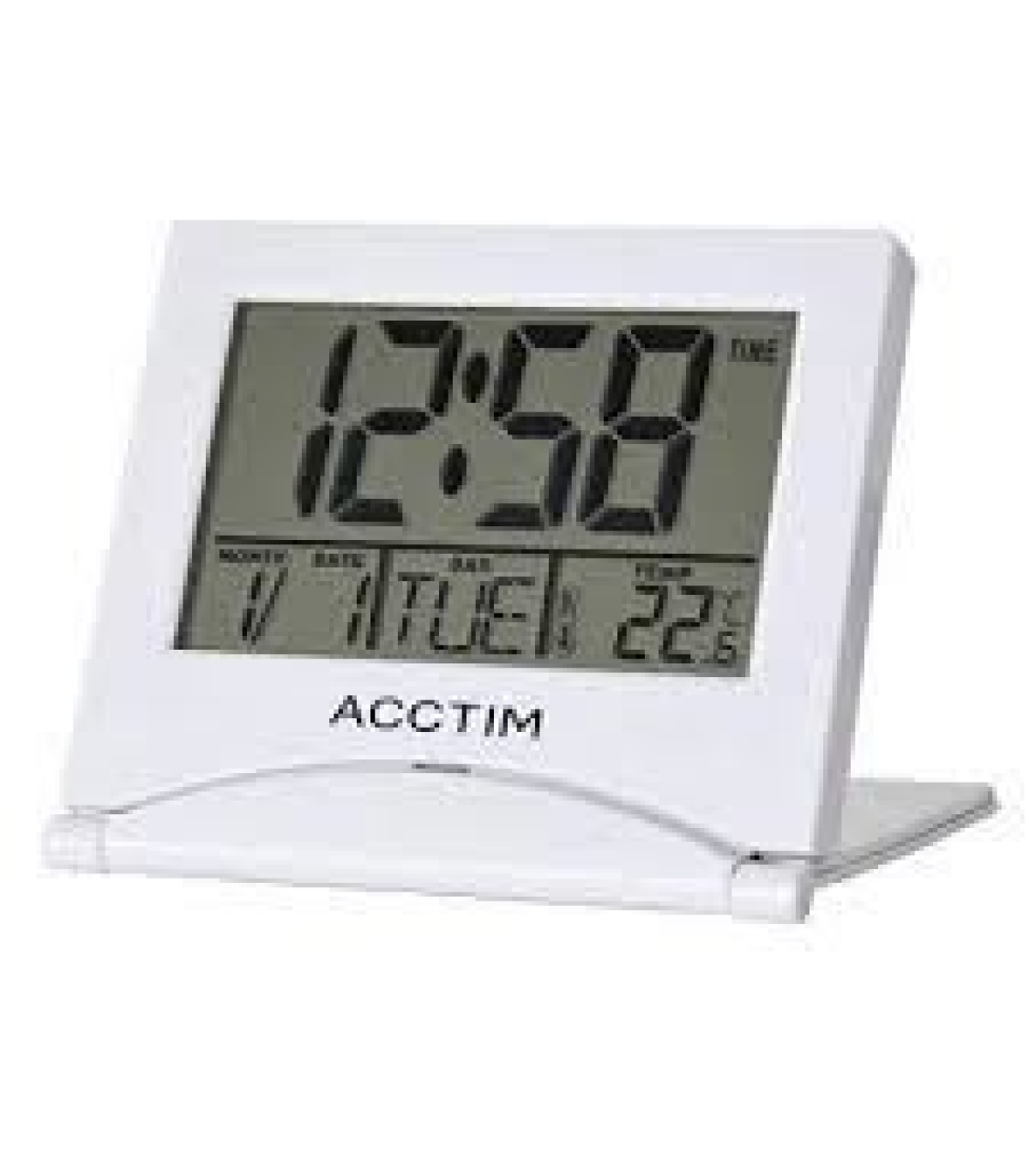 The Acctim Mini Flip alarm clock in silver is compact in size, making it ideal for taking on your travels. The LCD display shows time, calendar and indoor temperature clearly and the alarm with snooze function will make sure you wake up in time. The convenient folding travel case and included batteries make this clock ready to use straight out of the box.