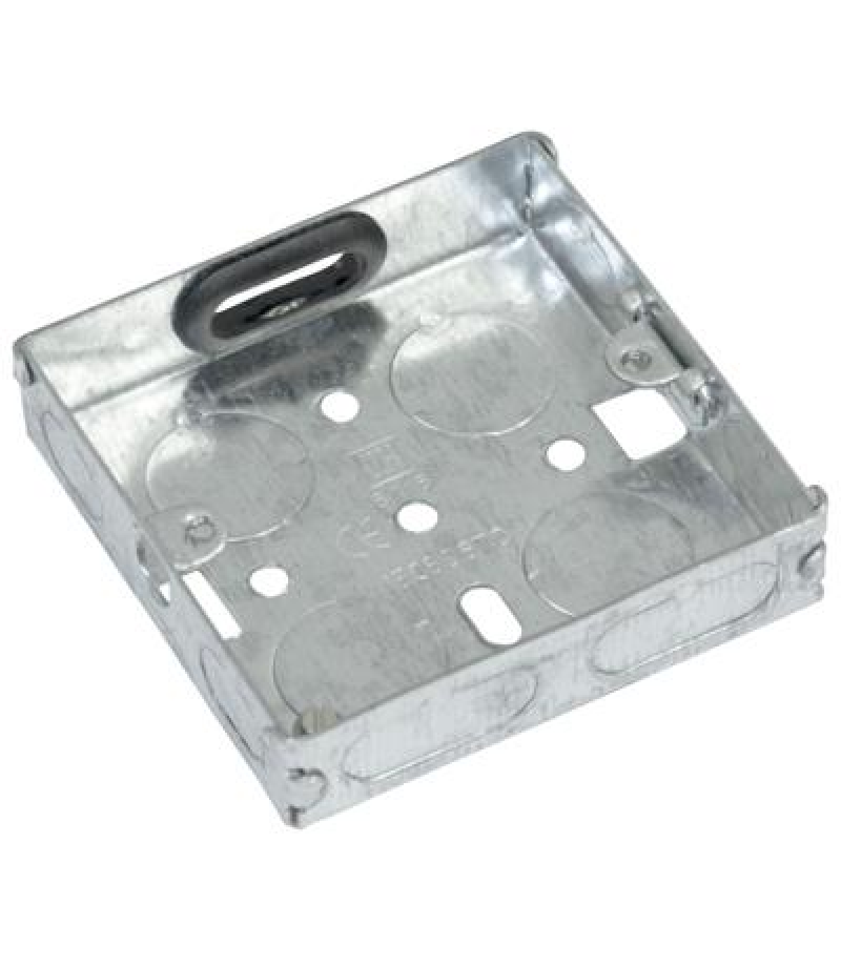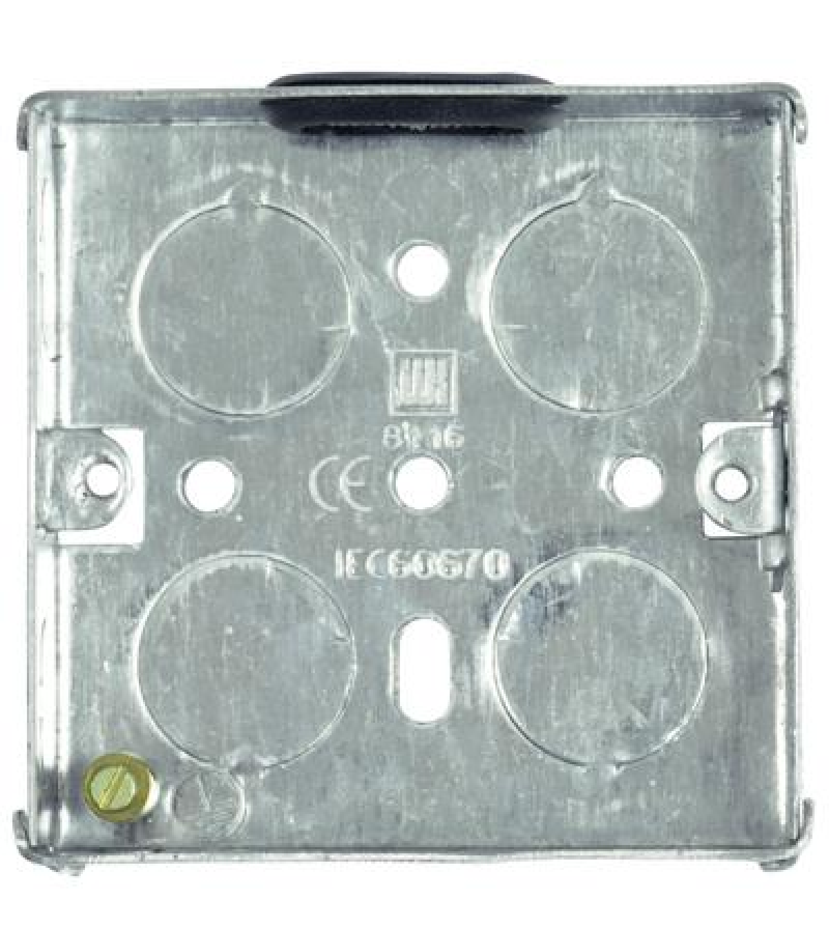 A single gang metal back box, choose from 3 different mounting depths. Made from galvanised steel this back box features multiple knockout box with earth terminal and adjustable fixing lug. Made to IEC 60670-1:2015 standards.
