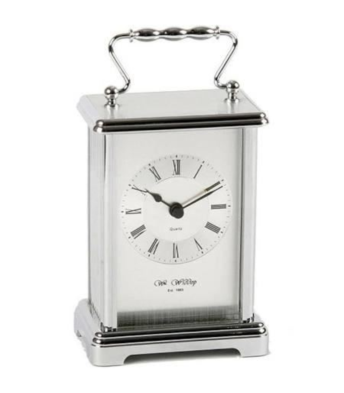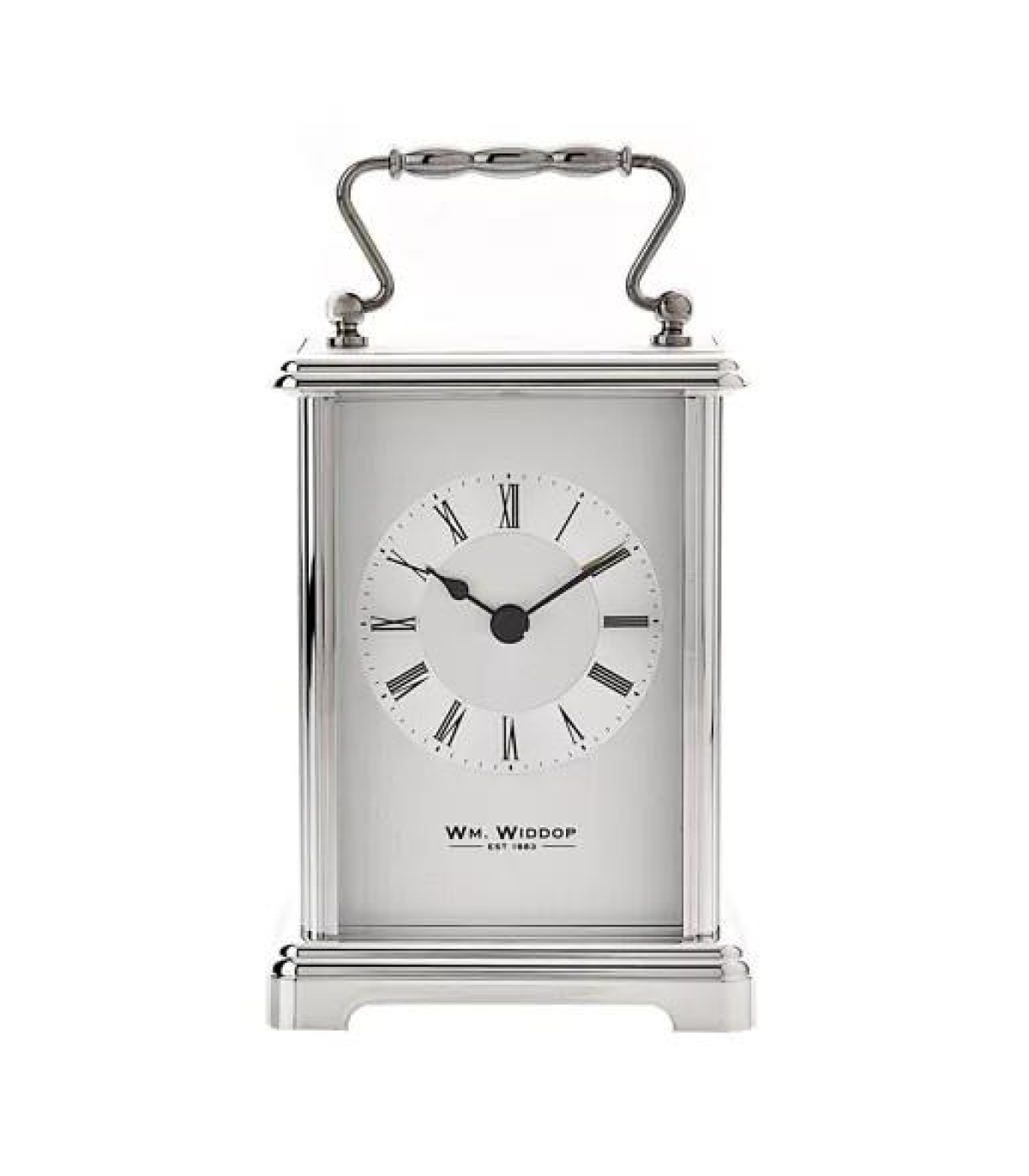 W4312 Widdop Carriage Mantel CLock Silver Traditionally styled carriage clock with a silver finish, white dial, black roman numerals and hour/minute hands. Quartz movement. Stands 9 x 13cm excluding the variable height