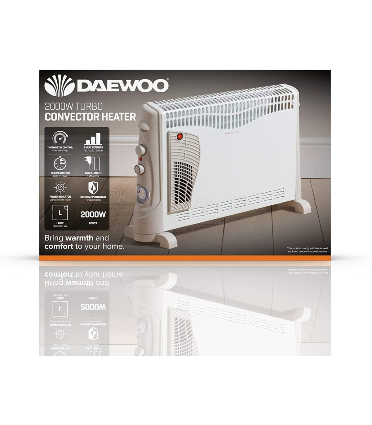 HOME, GARAGE & SMALL OFFICE USE - The Daewoo turbo heater is perfect for generating warmth in your home, garage or small office - Thanks to the power of the radiating heat you can be sure to stay warm during the winter months PORTABLE CASTERS FOR TRANSPORTATION - The handy portable carry handles allow you to move and transport the heater for room to room quickly and easily for maximum convenience 3 HEAT SETTINGS - This heater features a handy thermostat and 3 temperature control settings so you set which temperature suits you and others around you best for greater and customised warmth ADJUSTABLE THERMOSTAT/TIMER CONTROL - This radiator has a 2000w turbo output, which means it can quickly and easily warm up a large room within 15 minutes of being turned on FORCED FAN SETTING - A handy forced fan setting means you can cool the room down if you need to if it gets too hot - This feature is handy during the warm summer months