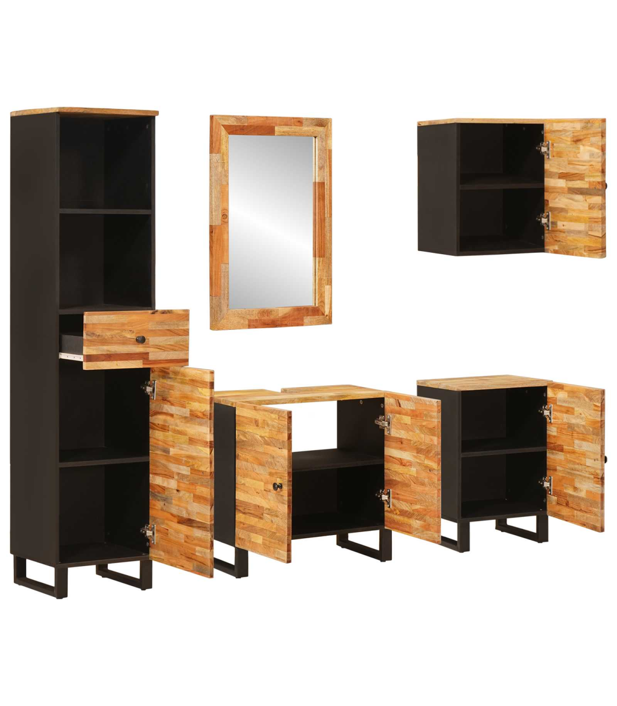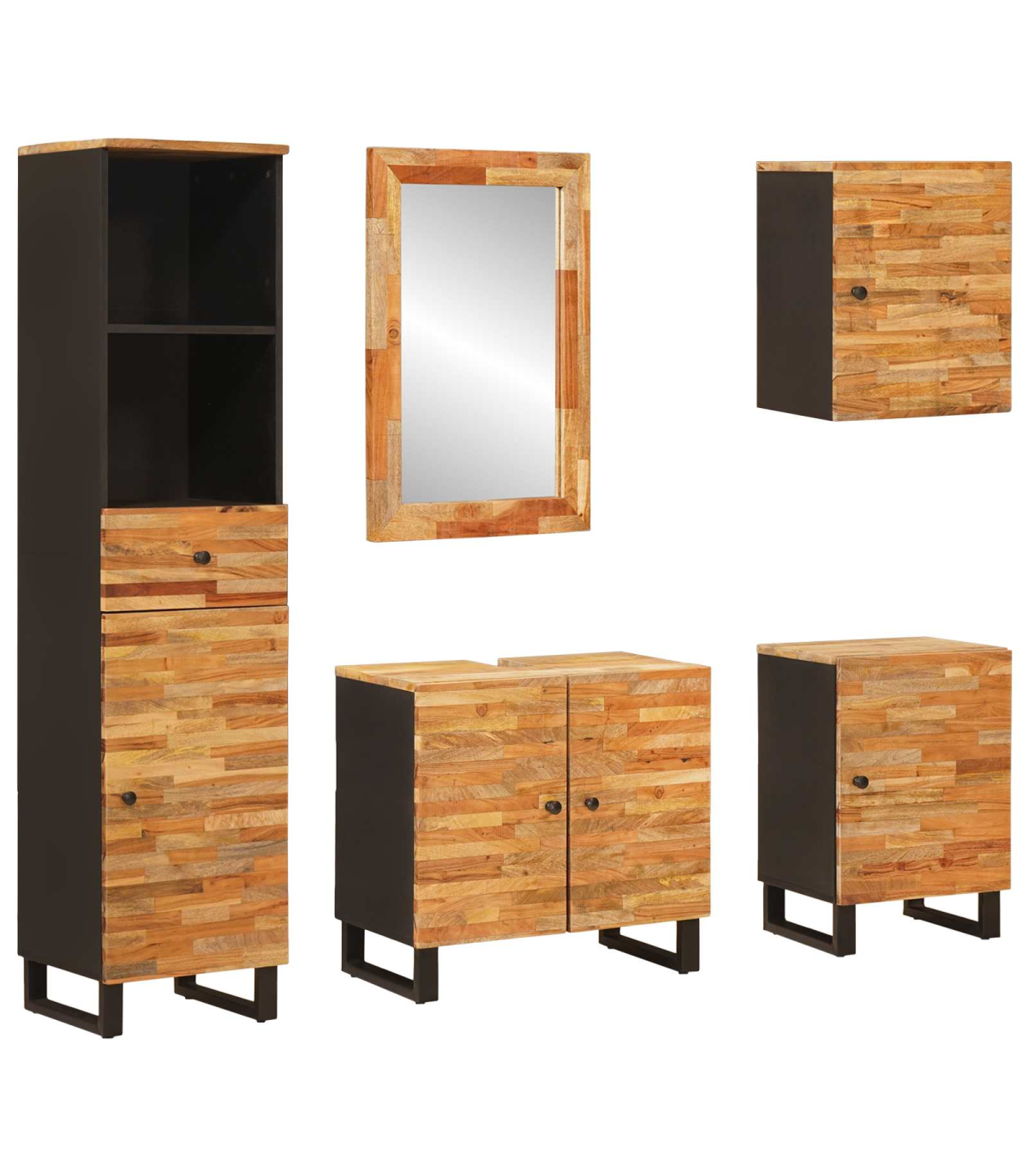 This modern bathroom set is crafted to enhance your bathroom's form and function. Featuring a sleek rectangular shape, these furniture pieces are made from natural solid mango wood, known for its elegant grain and strength. With its minimalist design characterized by simplicity and functionality, this set fits seamlessly into any contemporary bathroom setup, maximizing both storage and style. Visualize a clutter-free, aesthetically pleasing space with this comprehensive set that offers a harmonious balance of form and functionality. Materials: This bathroom set is made from solid mango wood, renowned for its rich natural appearance and durability. The use of this material ensures sustainability and adds a touch of warmth and sophistication to your bathroom environment. Included Components: The set includes a bathroom sink cabinet, mirror, two cabinets, and a hanging cabinet. Each unit is crafted to cater to different storage needs, offering both floor-standing and wall-mounted options to optimize bathroom space. Features /Function /Design: Designed with functionality in mind, this set embodies a modern aesthetic that prioritizes simplicity. The clean lines and natural wood finish enhance the serene atmosphere of the bathroom, making it a relaxing retreat. Recommended Uses: Ideal for indoor use, this set is perfect for bathrooms that require efficient use of space and need an update with a modern touch. Its timeless design suits various styles, from minimalist to contemporary. Care &Maintenance: Maintaining this bathroom set is easy; simply wipe with a damp cloth to keep it clean and fresh. This straightforward upkeep ensures the set remains a stylish addition to your space for years to come.