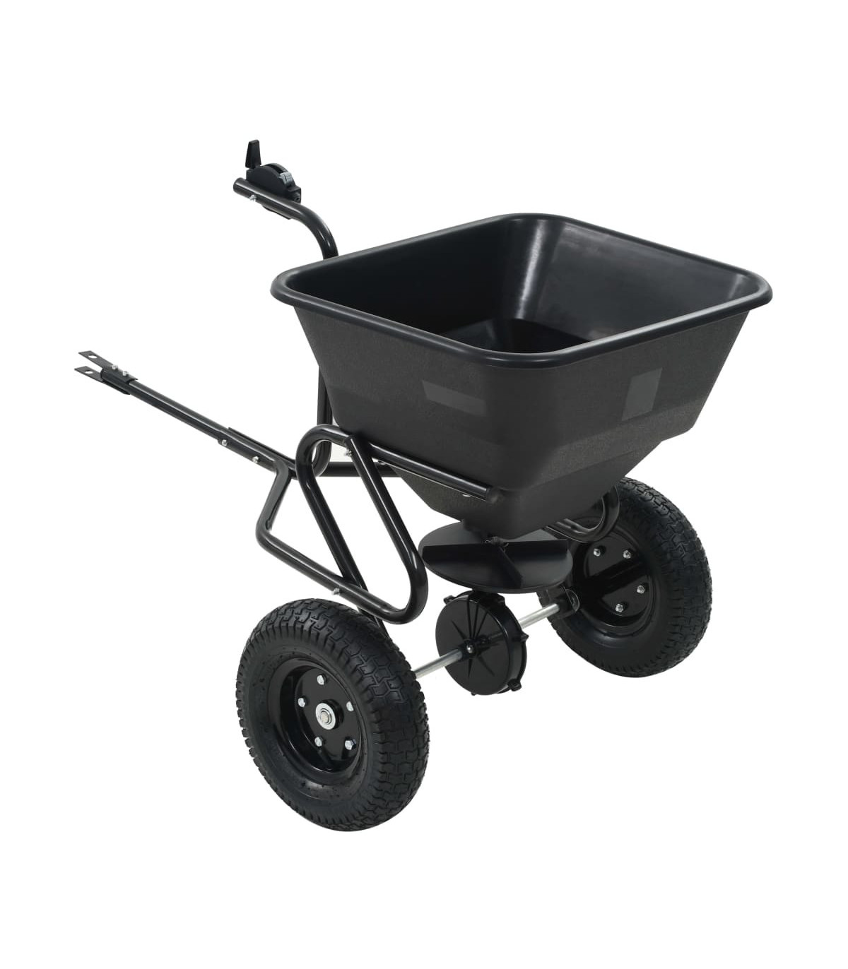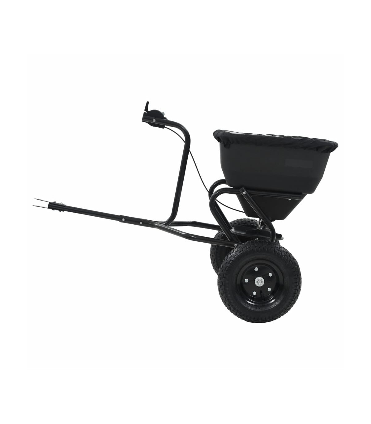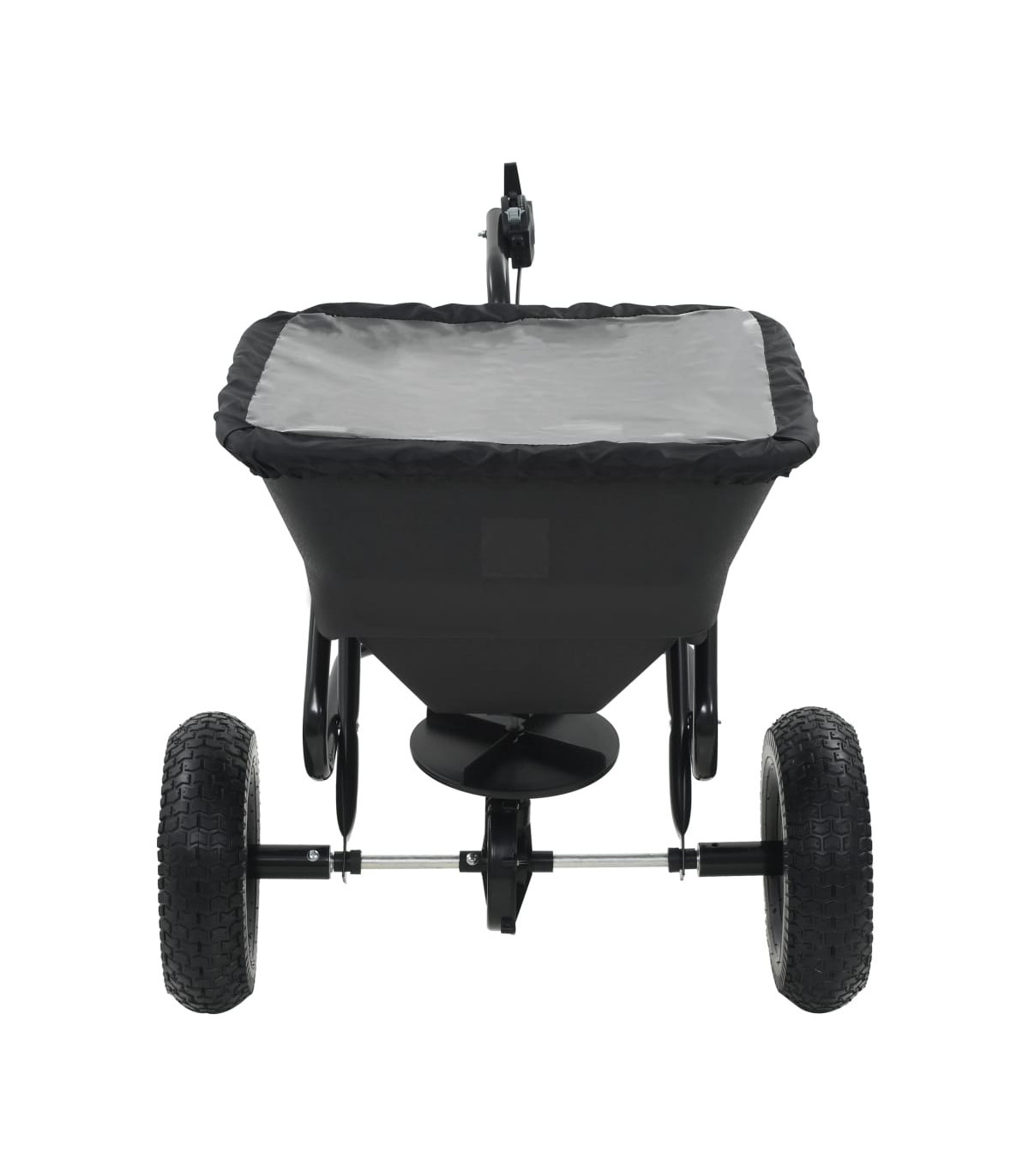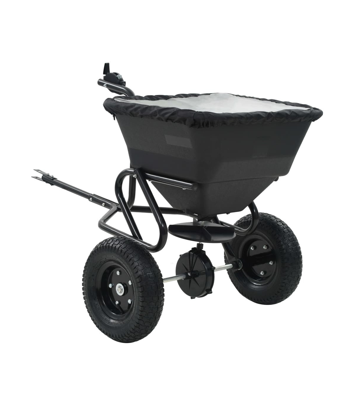 This tow-behind salt spreader will not only help you to salt your driveways and walkways in winter, but can also be used when sowing and applying fertilizer in spring and fall. The robust spreader has a tubular steel frame, which is corrosion resistant and durable. It also has a large PVC hopper to carry the salt, seeds, or fertilizer. This garden spreader is designed to strike a balance between dispersing too much or too little grass seed, neither too densely nor too sparsely, to make the grass grow healthily. It also helps to spread lawn fertilizer evenly to lower the risk of scorching. The lawn spreader is delivered with a cable-operated controller alongside the handle, with which you can easily adjust the spreading speed for higher efficiency. The design with two large and wide wheels and a long handle also help you to manoeuvre this tool in your garden easily. This item is easy to assemble. A cover for the hopper is also included in delivery.