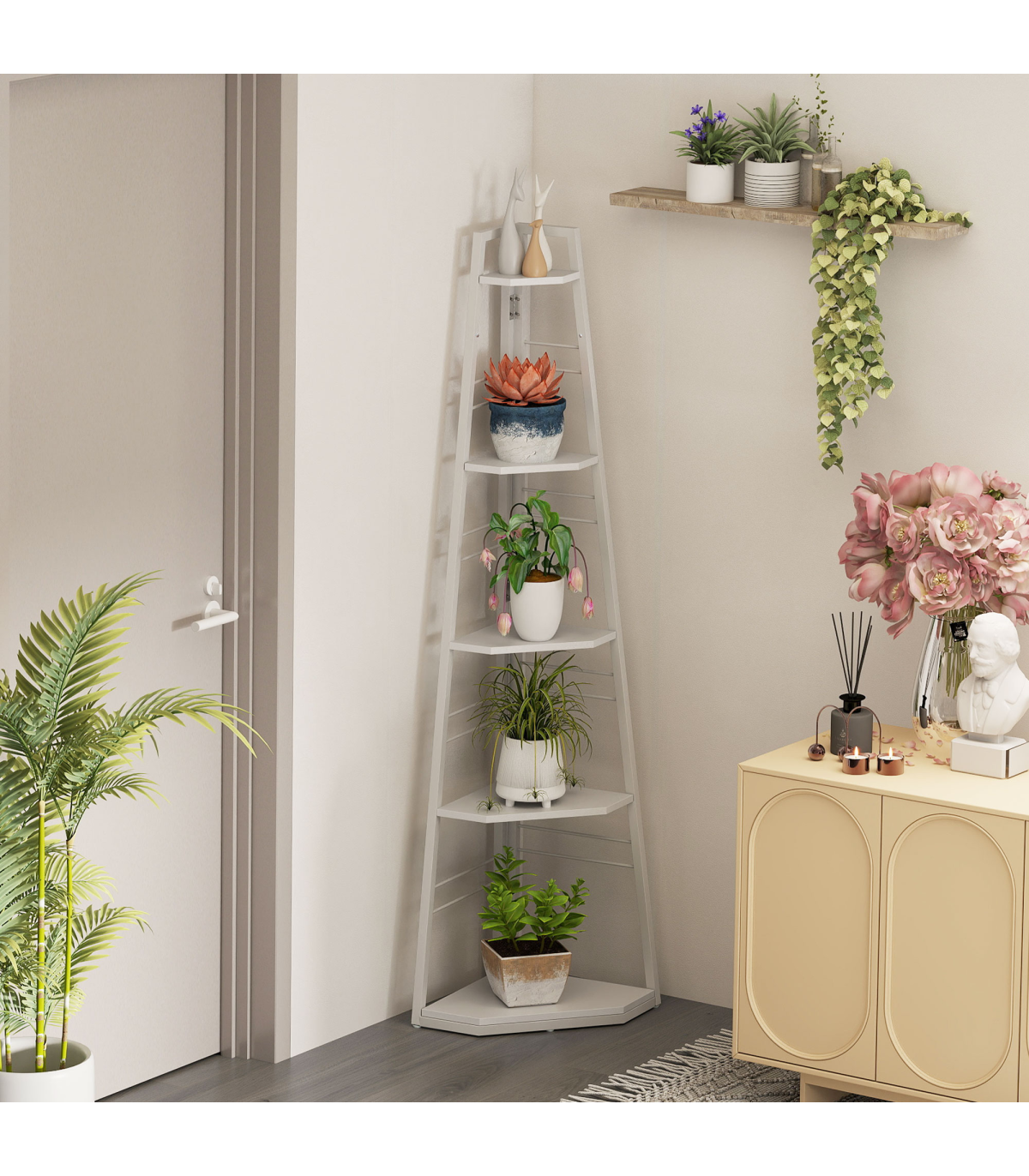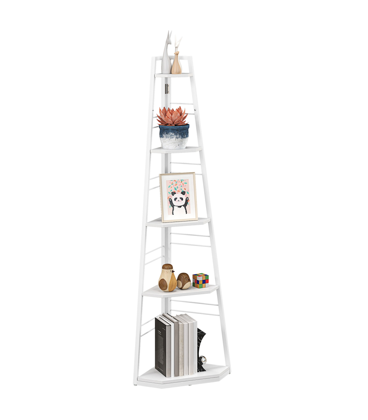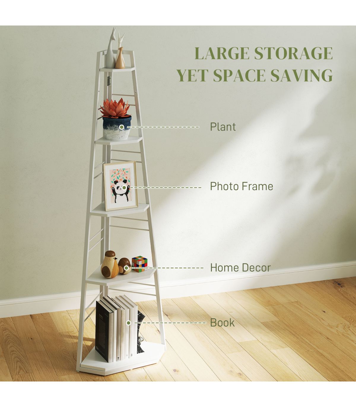 ● Five shelves: plenty of room for books, flowers, photos, ornaments and more