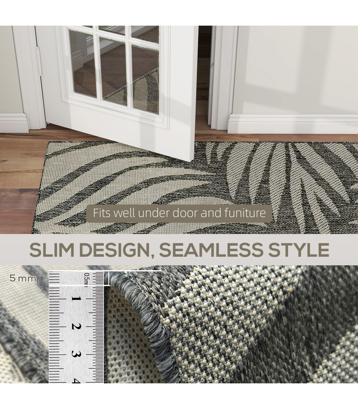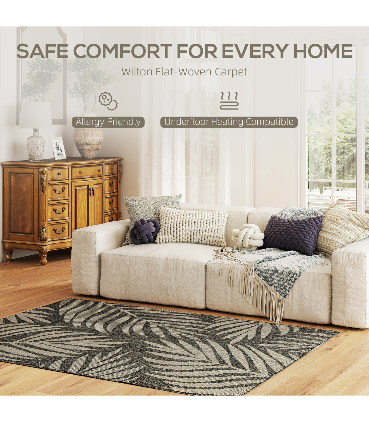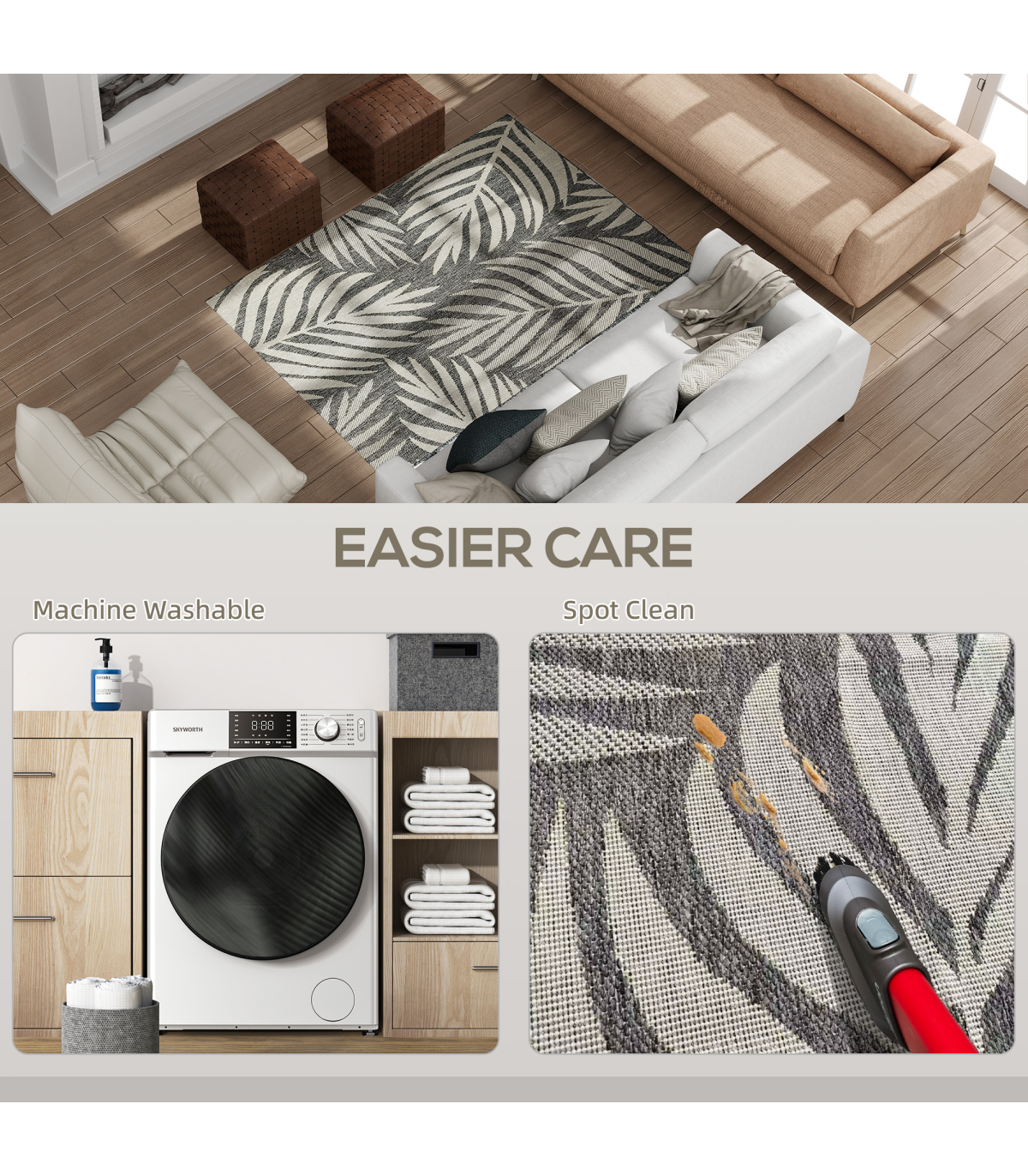 Give your home a fresh, modern feel with the HOMCOM Wilton flat-woven garden rug, designed with charming leaf-shaped patterns. Made from polypropylene, it's great for allergy sufferers and works well with underfloor heating. Whether indoors or out, the washable rug is a practical choice—UV resistant and easy to clean with a quick wipe or machine wash.