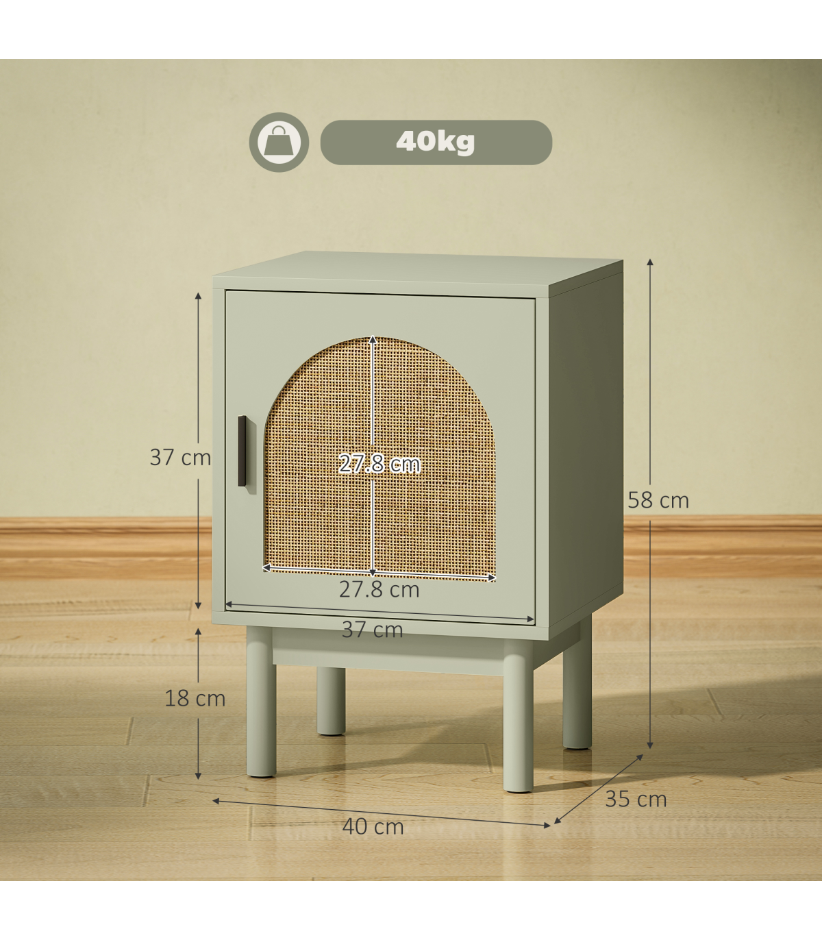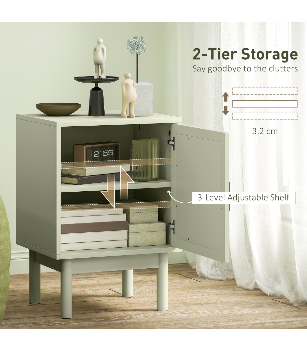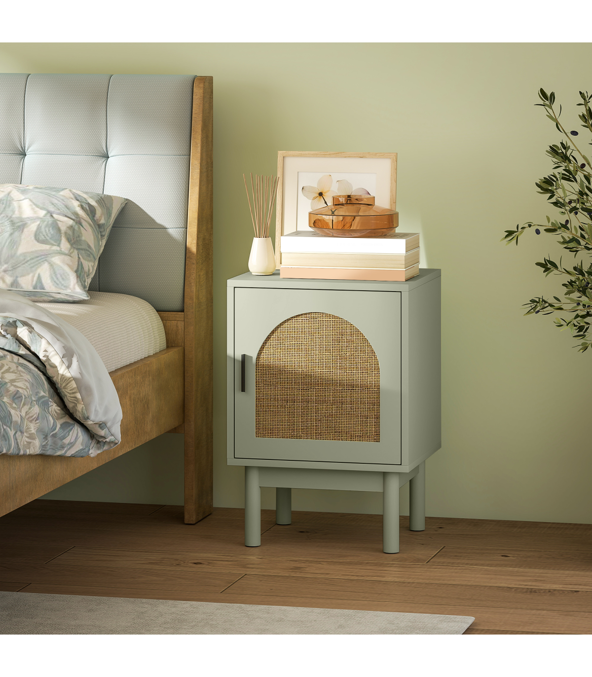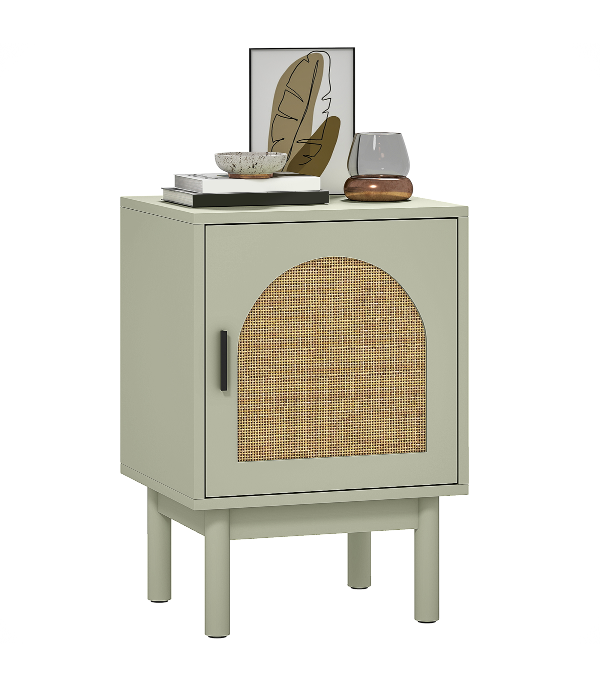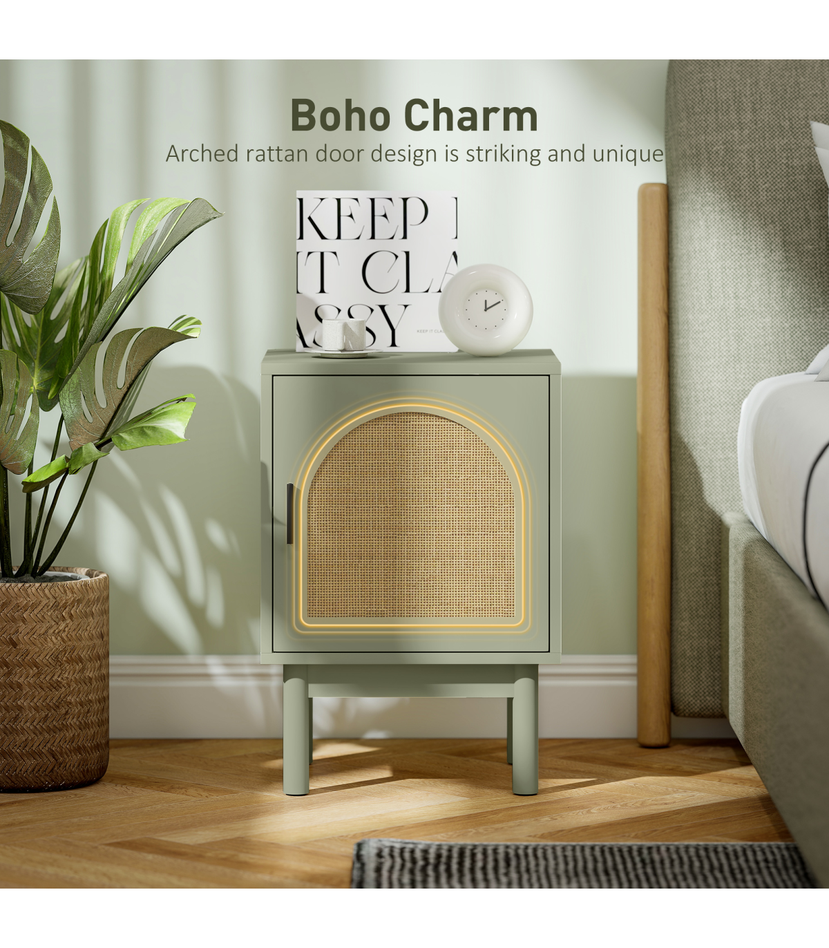 Add a splash of boho charm to your bedroom with the HOMCOM bedside table! Its arch rattan door pairs a soothing light green hue and two-tier design with adjustable shelving makes it a trendy and practical choice. The solid wood legs feature non-slip pads, ensuring stability. Great as a small bedside cabinet or end table, blending style and function effortlessly.