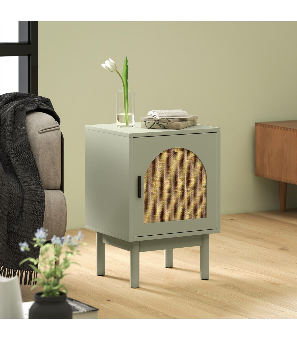 HOMCOM Boho Bedside Table with Rattan Door and Adjustable Shelf, Light Green