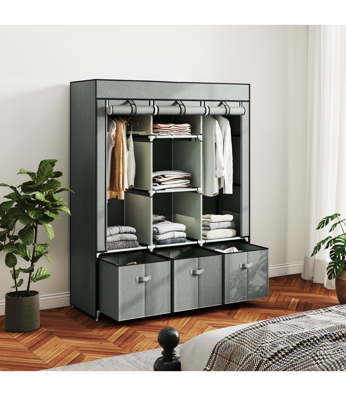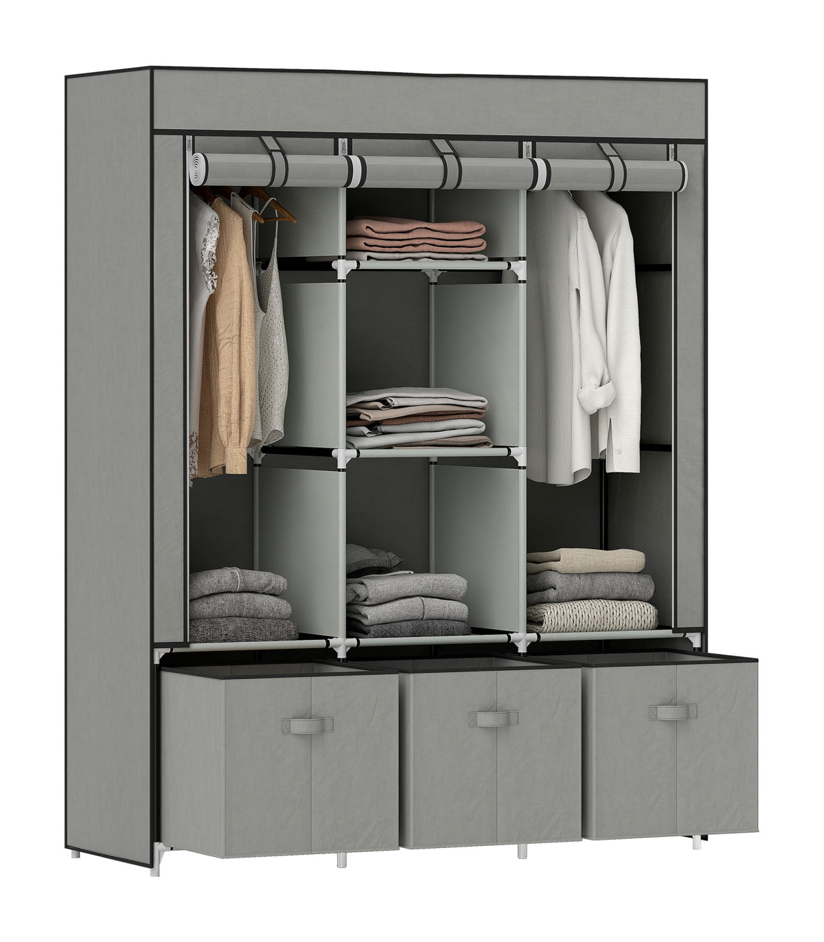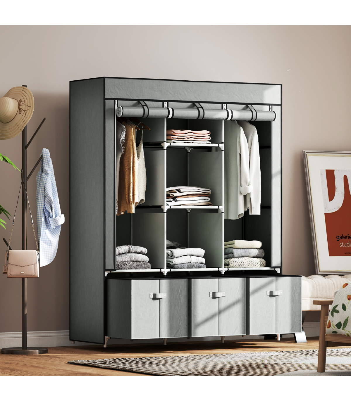 ● Fabric cover protects clothes from dust