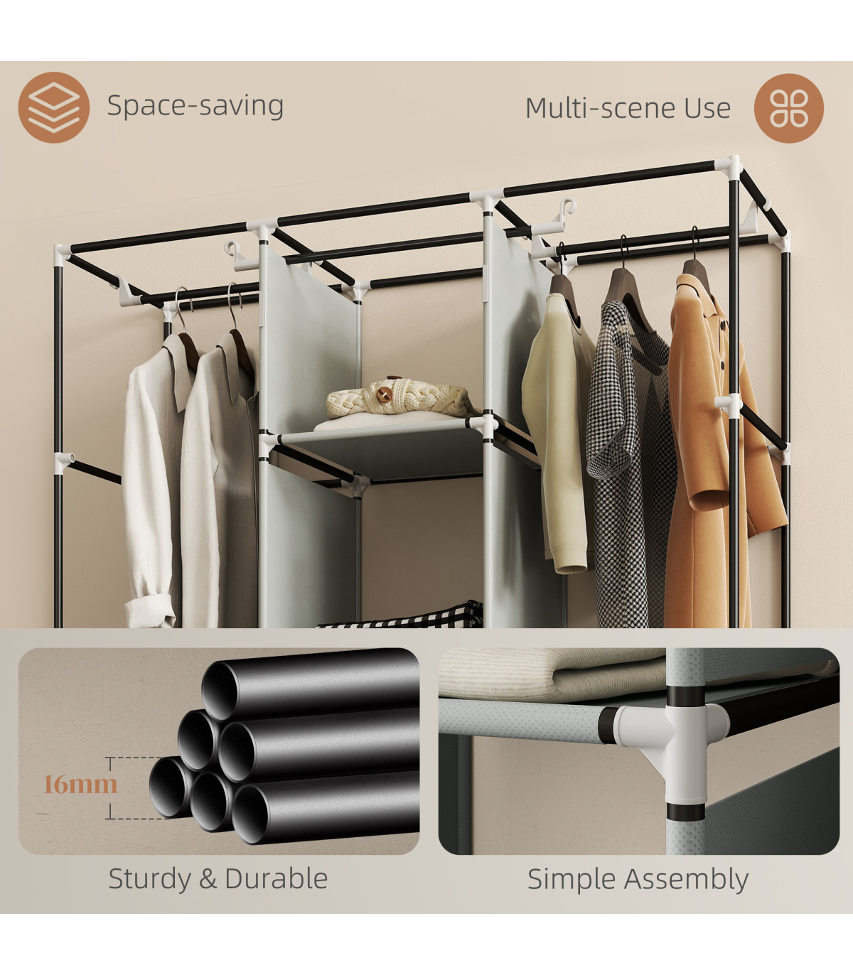 ● Weight Capacity: 65kg (total), 5kg (each layer), 15kg (hanging rod)
