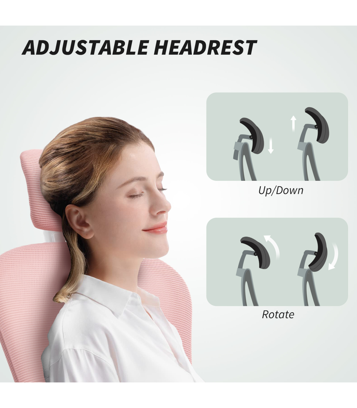 ● Headrest rotates and moves up/down