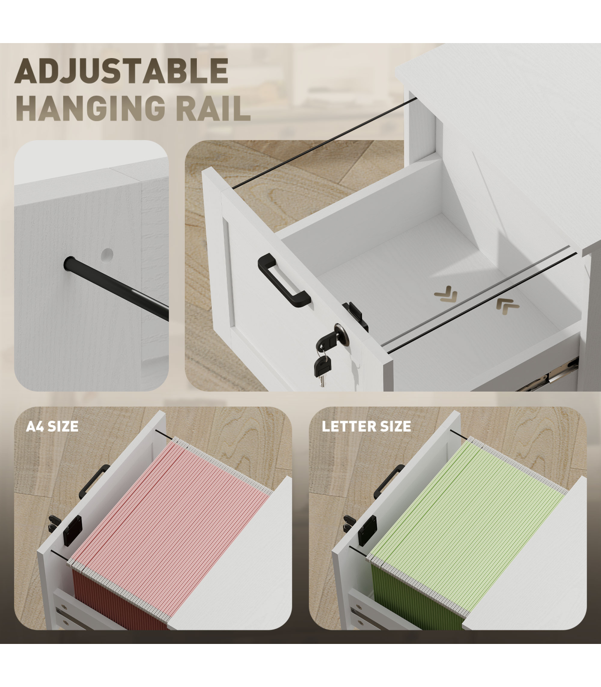 Discover the sleek HOMCOM File Cabinet, a modern marvel for any cluttered office. Featuring two spacious, lockable drawers with adjustable rails to fit A4 and letter-sized file folders. This compact office drawer unit doubles as a printer stand, blending functionality with style. The wood effect finish adds a touch of contemporary chic to your workspace essentials. A great secure, stylish office storage drawers unit.
