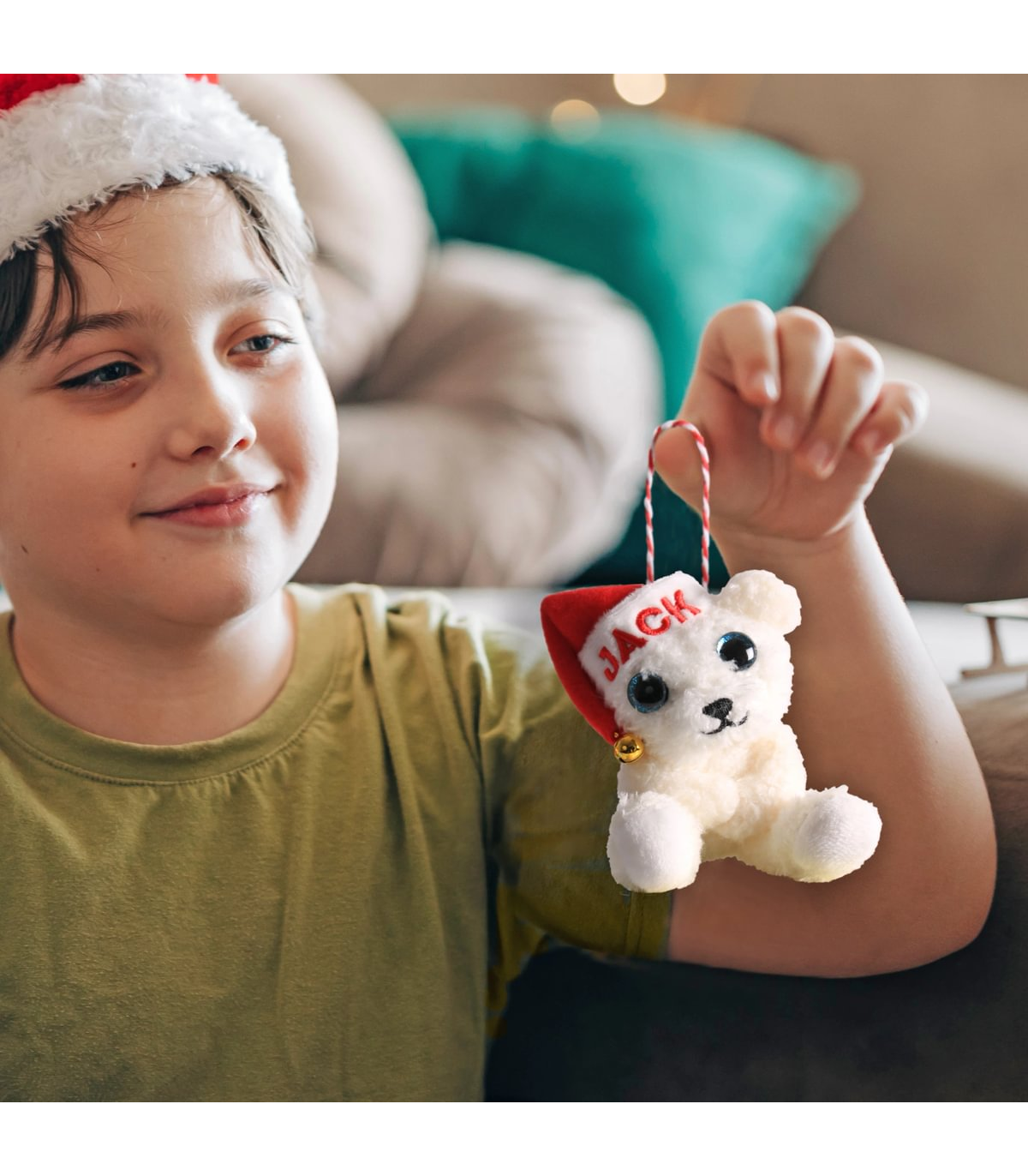 Add a touch of festive magic to your Christmas tree with a handmade, pre-personalised plush bear decoration. The adorable bears wear a classic Santa hat embroidered with popular childrens names and topped with a shimmering gold jingle bell. This super-cute plush bear has sparkling blue glitter eyes to give an endearing look that kids will just love. The decoration comes with a teddy bear-shaped name tag and a festive striped hanging string completes the design. PLEASE NOTE: These items are pre-personalised. The item you receive is the name or title that you have selected. Items are not personalised to order and we do not offer bespoke customisation.