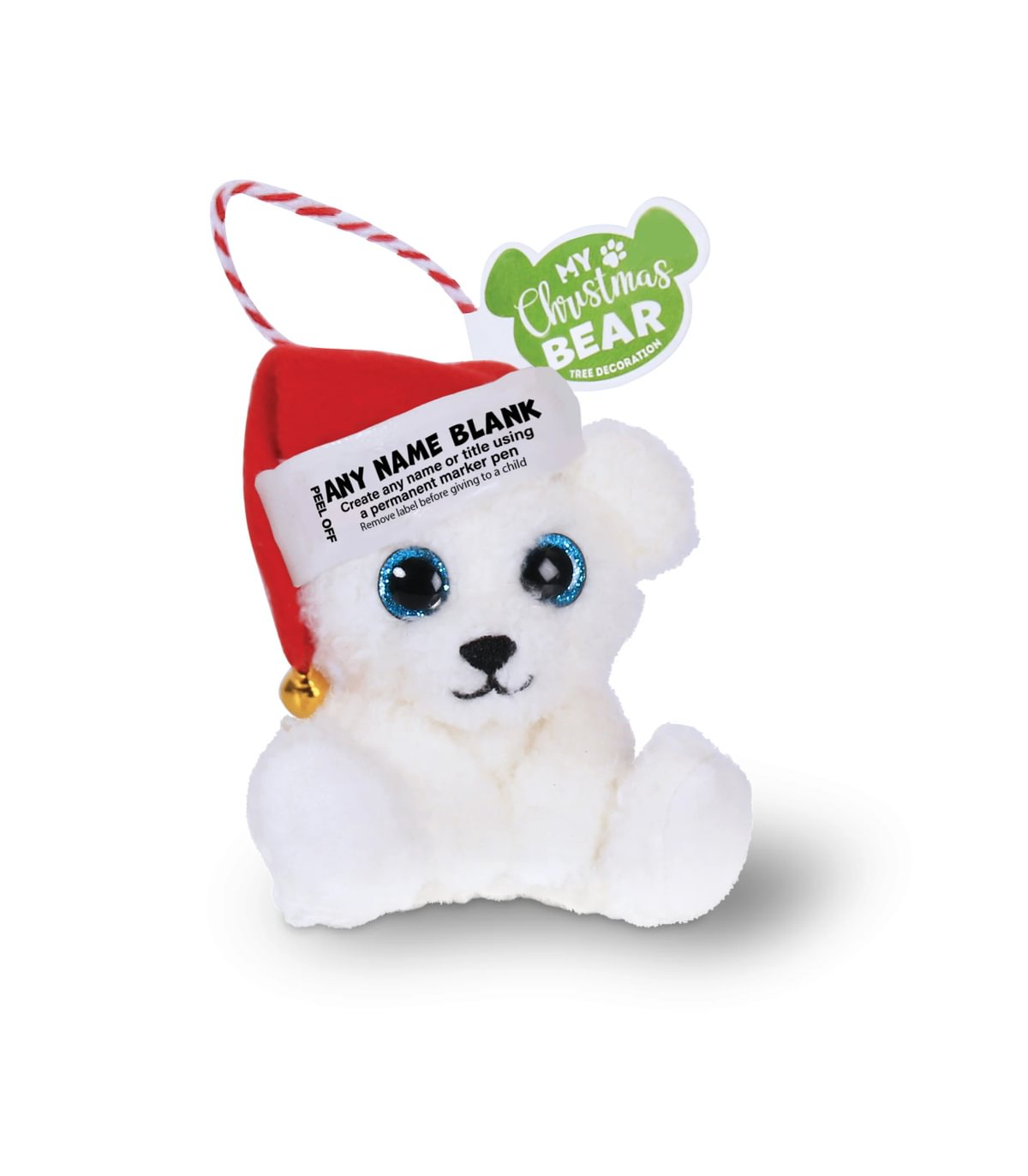 Add a touch of festive magic to your Christmas tree with a handmade, pre-personalised plush bear decoration. The adorable bears wear a classic Santa hat embroidered with popular childrens names and topped with a shimmering gold jingle bell. This super-cute plush bear has sparkling blue glitter eyes to give an endearing look that kids will just love. The decoration comes with a teddy bear-shaped name tag and a festive striped hanging string completes the design. PLEASE NOTE: These items are pre-personalised. The item you receive is the name or title that you have selected. Items are not personalised to order and we do not offer bespoke customisation.