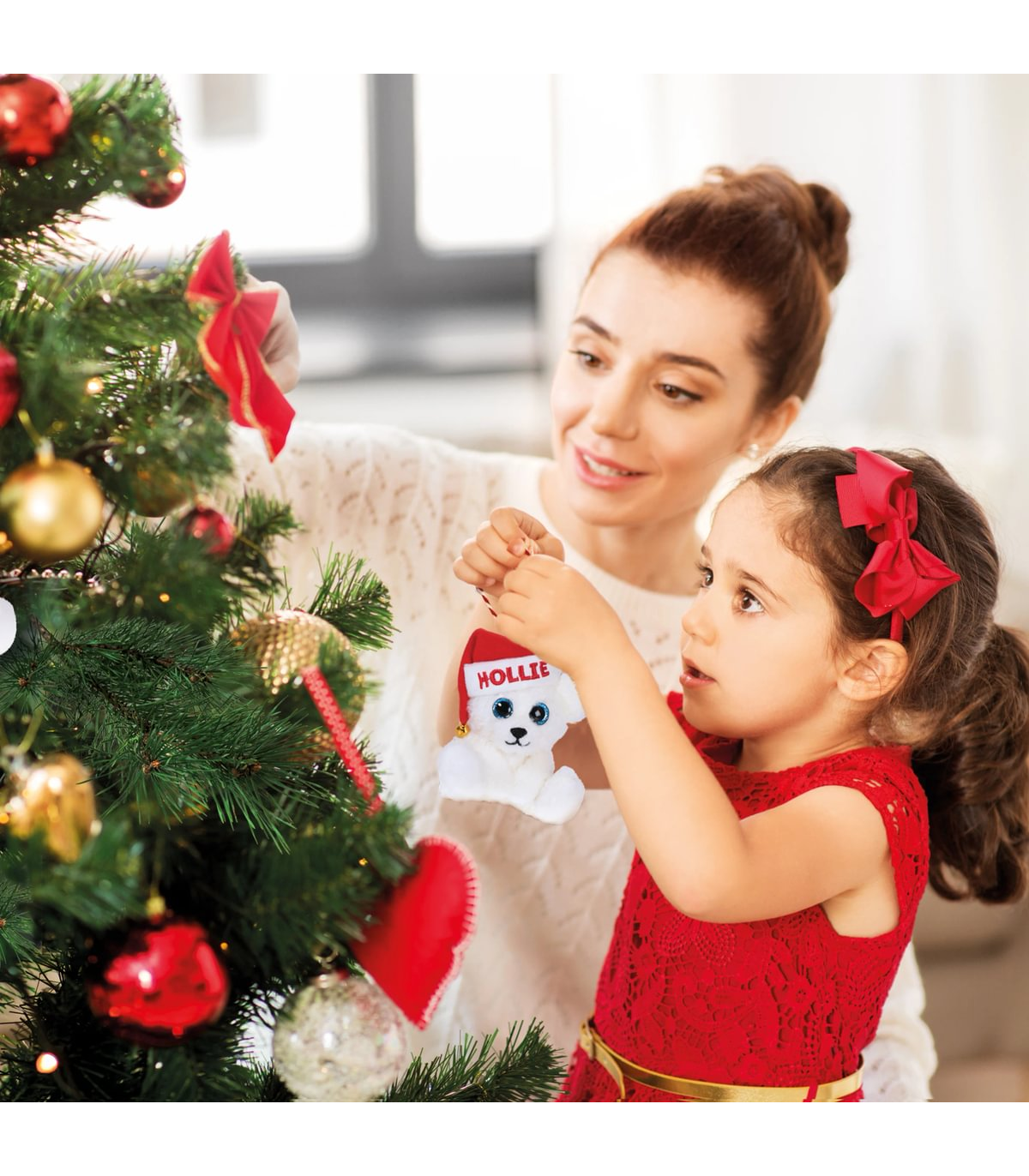 Add a touch of festive magic to your Christmas tree with a handmade, pre-personalised plush bear decoration. The adorable bears wear a classic Santa hat embroidered with popular childrens names and topped with a shimmering gold jingle bell. This super-cute plush bear has sparkling blue glitter eyes to give an endearing look that kids will just love. The decoration comes with a teddy bear-shaped name tag and a festive striped hanging string completes the design. PLEASE NOTE: These items are pre-personalised. The item you receive is the name or title that you have selected. Items are not personalised to order and we do not offer bespoke customisation.