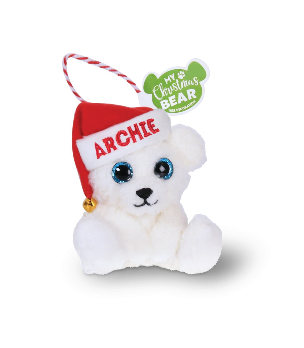 Add a touch of festive magic to your Christmas tree with a handmade, pre-personalised plush bear decoration. The adorable bears wear a classic Santa hat embroidered with popular childrens names and topped with a shimmering gold jingle bell. This super-cute plush bear has sparkling blue glitter eyes to give an endearing look that kids will just love. The decoration comes with a teddy bear-shaped name tag and a festive striped hanging string completes the design. PLEASE NOTE: These items are pre-personalised. The item you receive is the name or title that you have selected. Items are not personalised to order and we do not offer bespoke customisation.