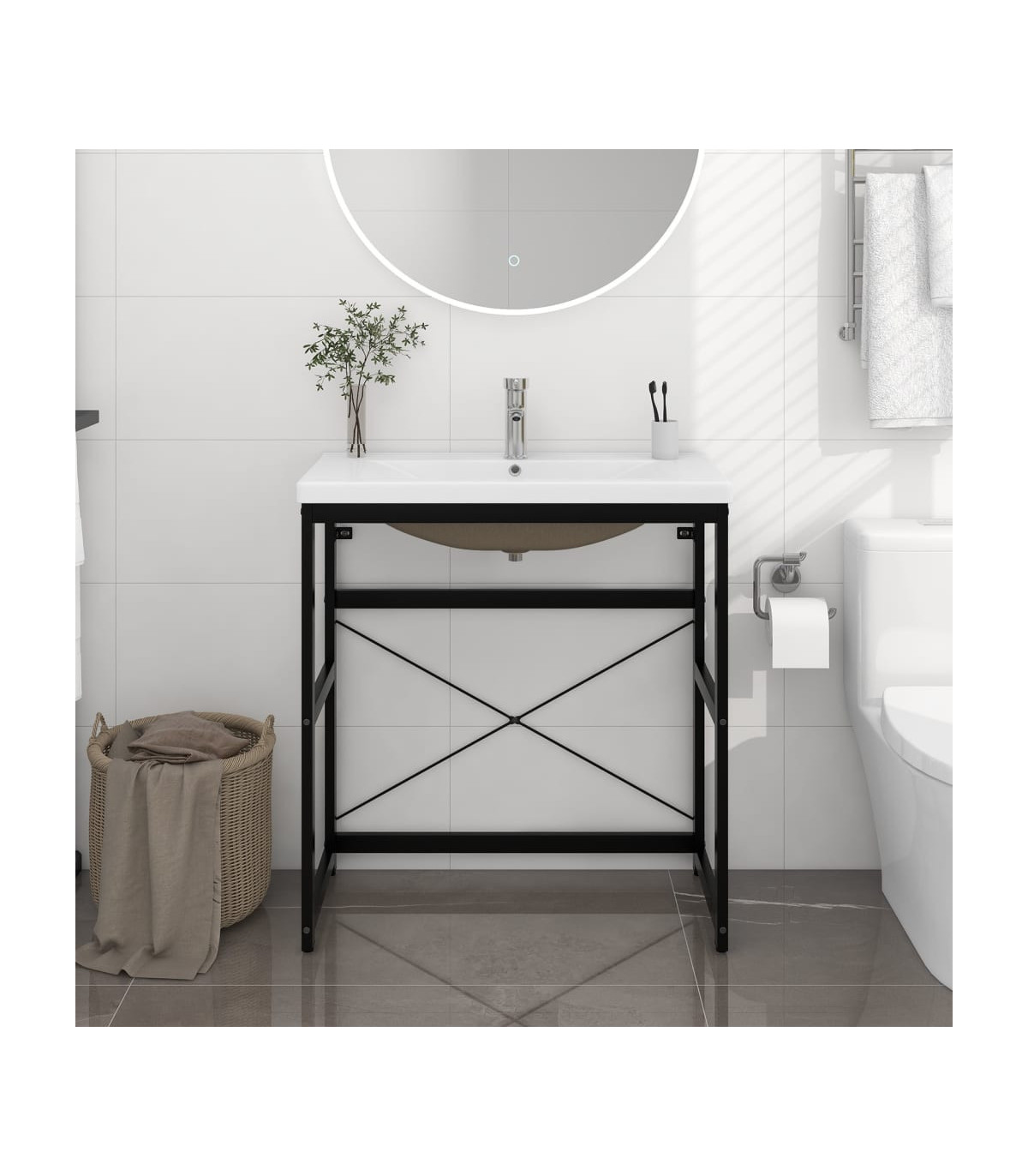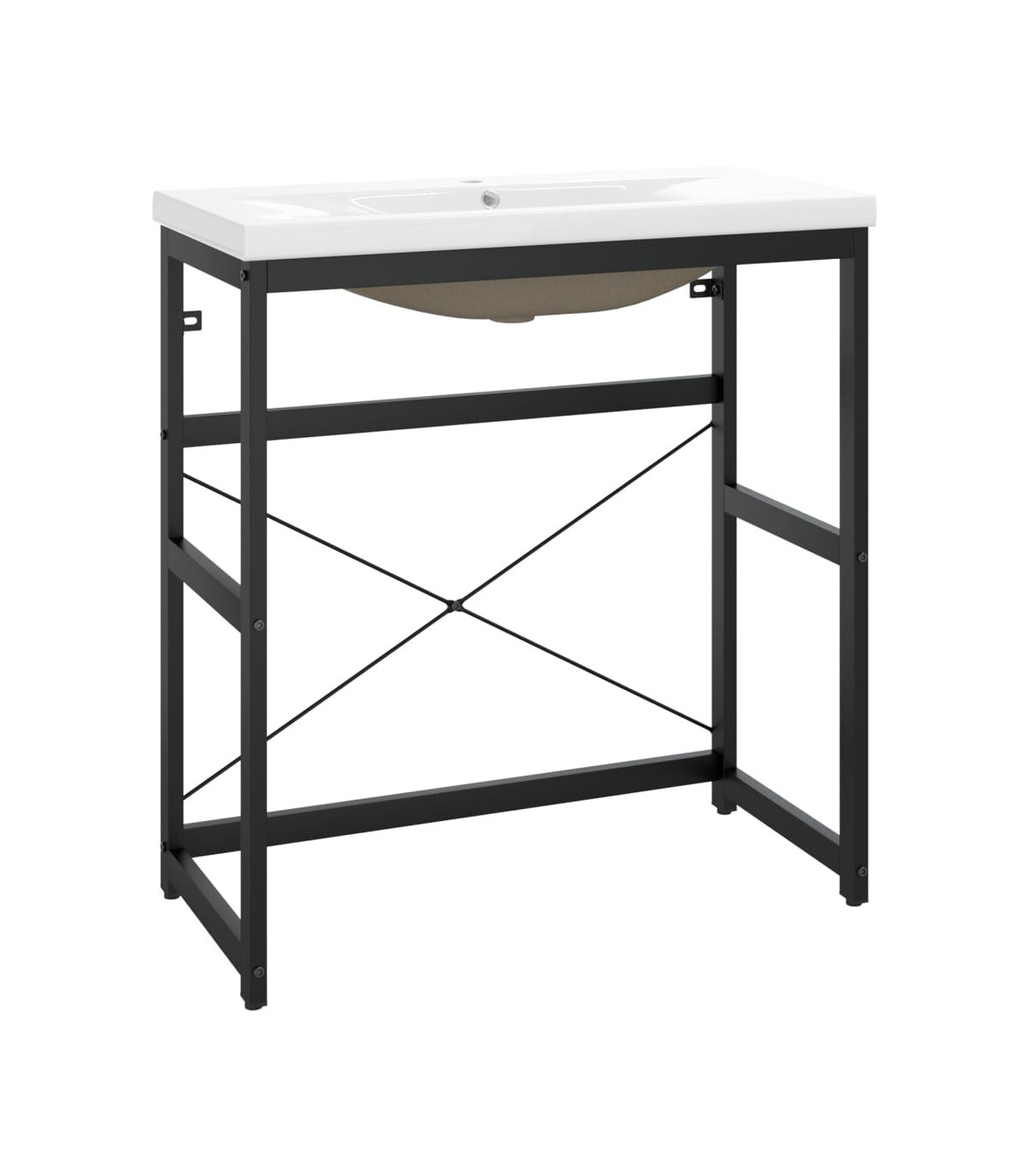 This bathroom washbasin frame with a bulid-in basin is a perfect match for your bathroom or washroom with a clean, tidy appearance. The wash stand is made of powder-coated iron, making it stable and durable. This washbasin frame gives easy access to towels and baskets and creates a more ample space than closed storage. Made of ceramic, the basin can not only serve as a vessel for daily use but also as an adornment in your living space. Thanks to its trendsetting and contemporary design, this washbasin will definitely suit any decor. An overflow is also equipped to flow water out when it gets too full. Its glazed surface brings itself a modern yet elegant design. Additionally, the washbasin frame and basin are easy to clean with a damp cloth. Please note: The tap and the drain are not included in the delivery.