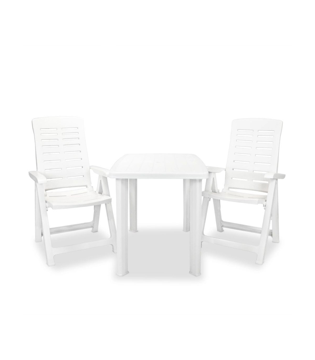 This weather-resistant bistro set will be a great choice for al fresco dining in the garden, on the patio or at the campsite. The garden table has an umbrella hole so that you can use it with an umbrella and keep cool in the shade. The chairs' backrests have 4 reclining settings, so you can always find the most comfortable position. The chairs can be folded to save space when not in use. The set is made of durable plastic, making the table and chairs weather resistant and easy to clean. This outdoor dining set is also lightweight, which makes it easy to move around. Delivery includes 1 table and 2 folding chairs.