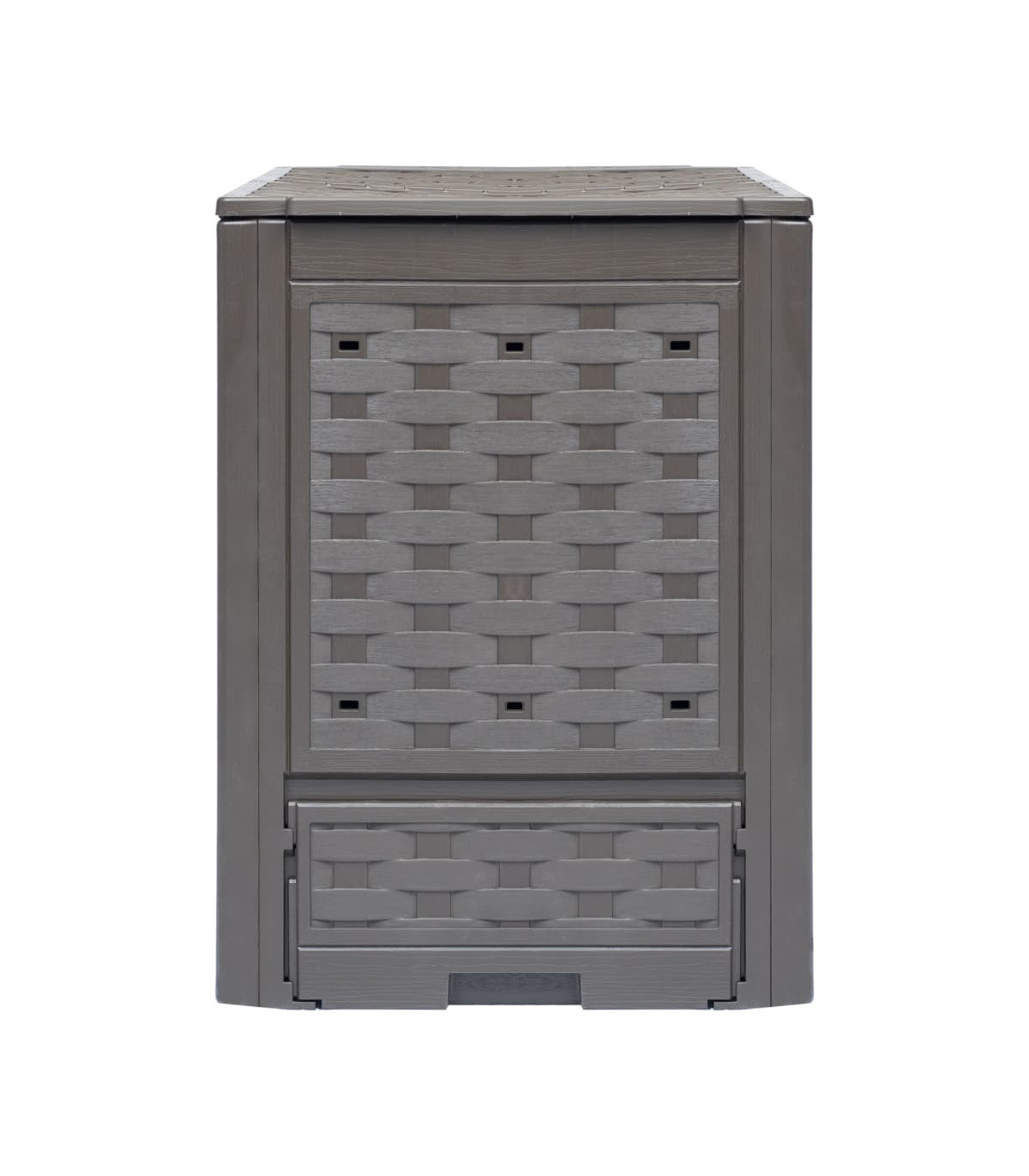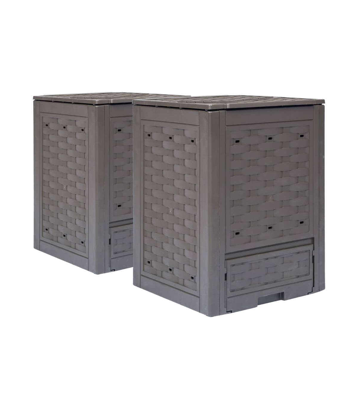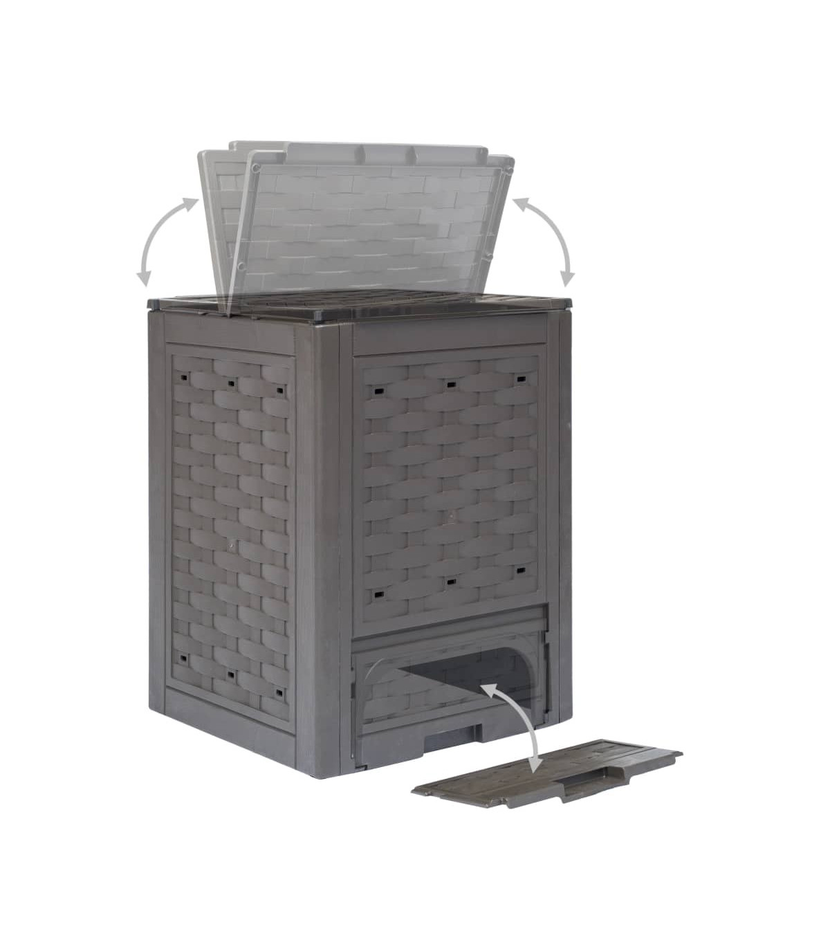 Our garden composters in a rattan look will surely be a perfect option to collect organic waste, including leaves, weeds, and lawn clippings. The compost bins are made of plastic which makes them UV and weather resistant. The units have a lightweight body as well as a neat appearance. They have split lids for optimal irrigation and ventilation. Thanks to ventilation holes in side parts, the waste boxes can exquisitely achieve optimal composting. These square composters will come in very handy when recycling, and meanwhile they will blend naturally into any garden. Delivery includes 2 garden composters.