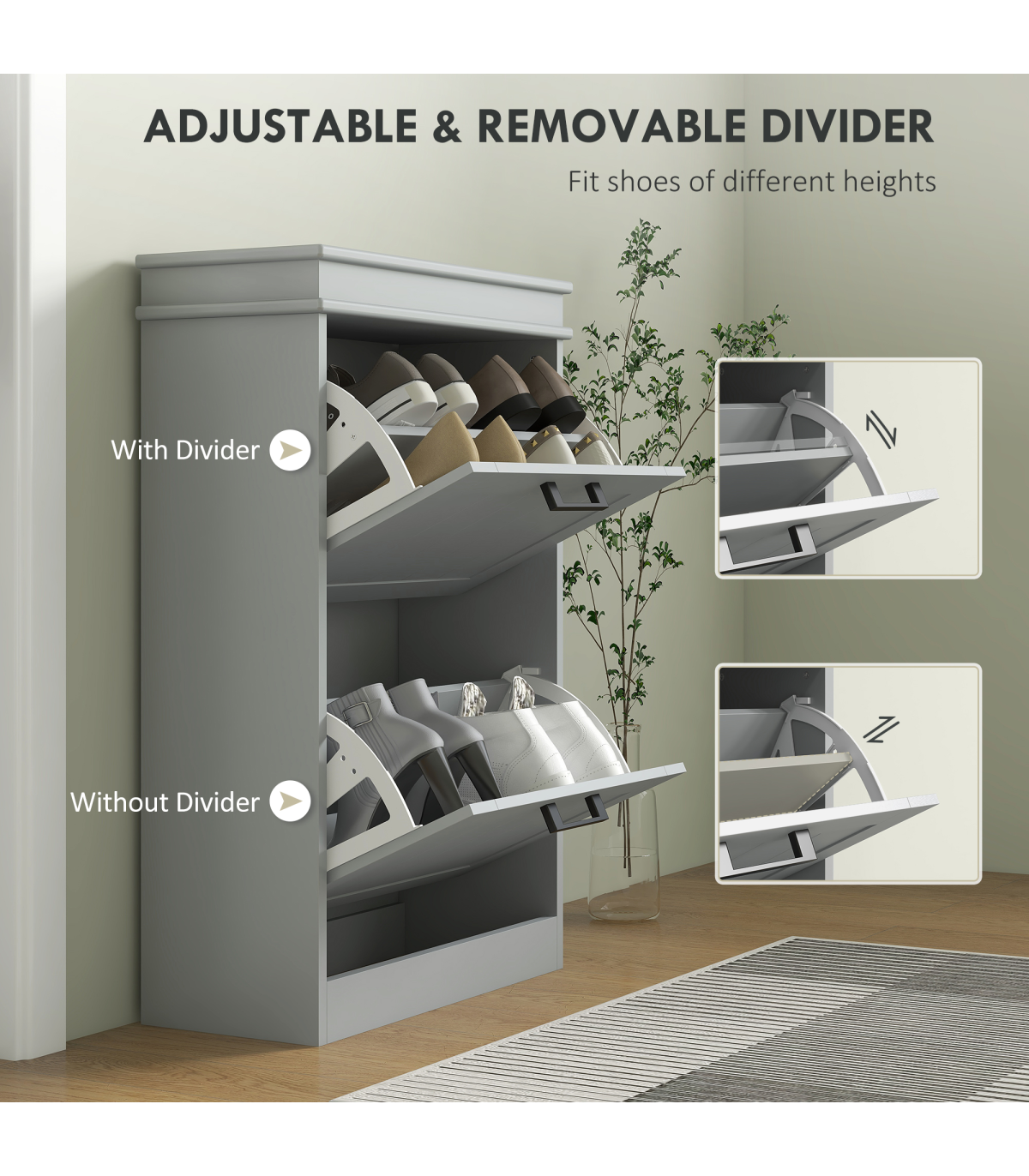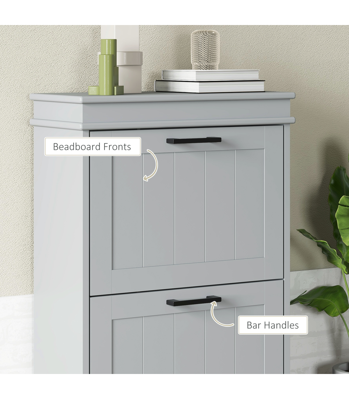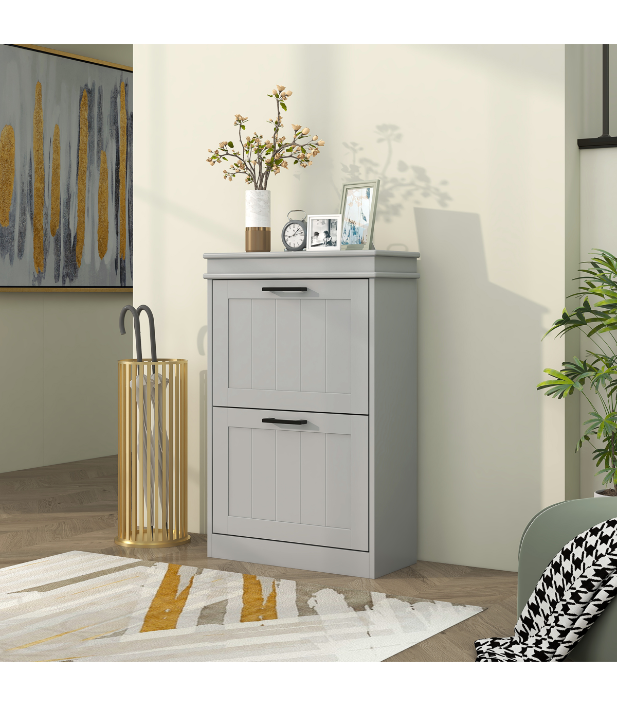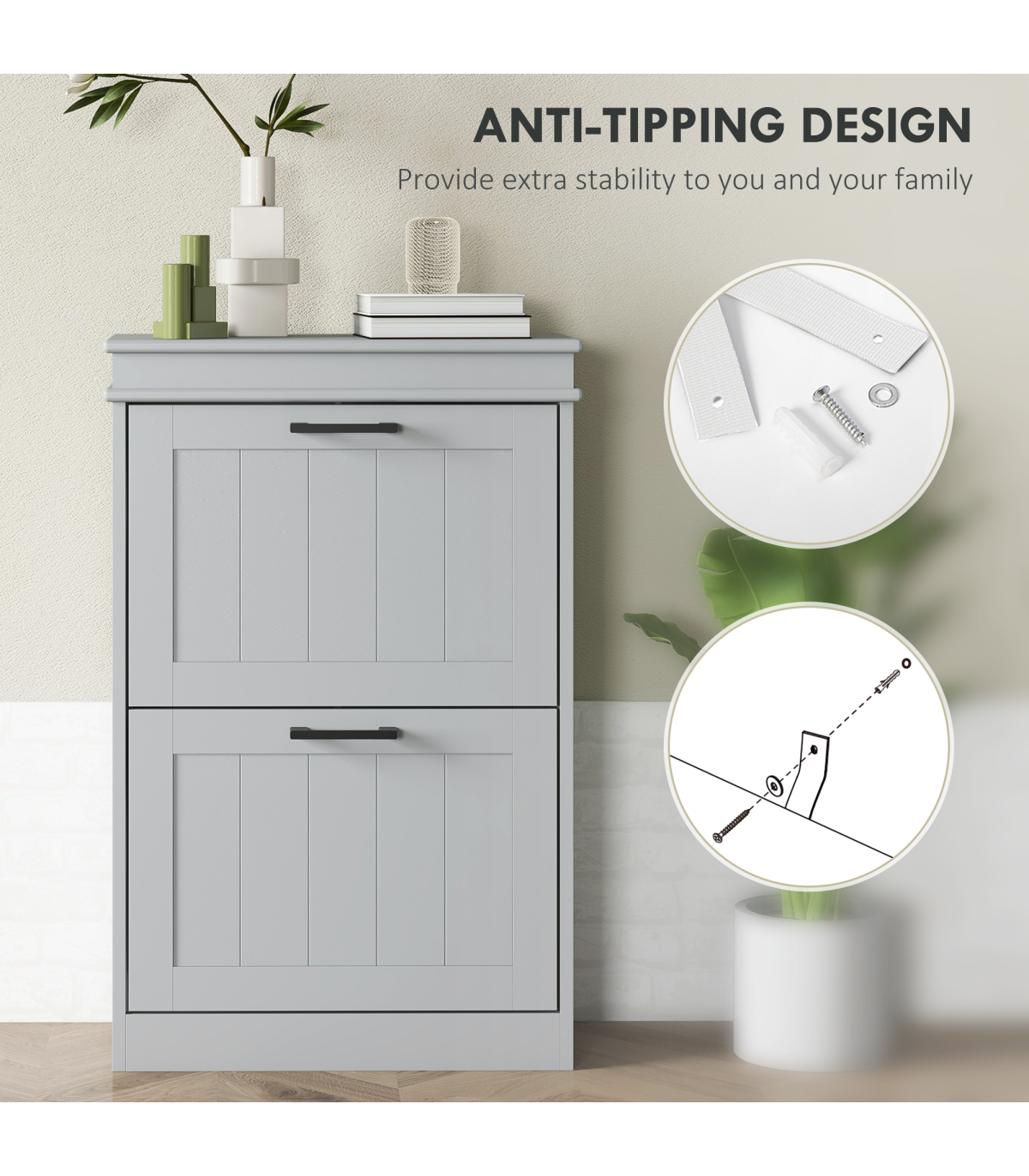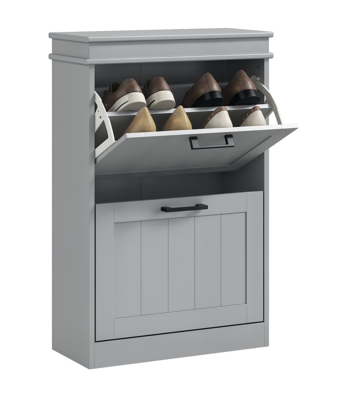 this minimalistic grey shoe cabinet comes with anti-tipping straps to securely attach to a wall.