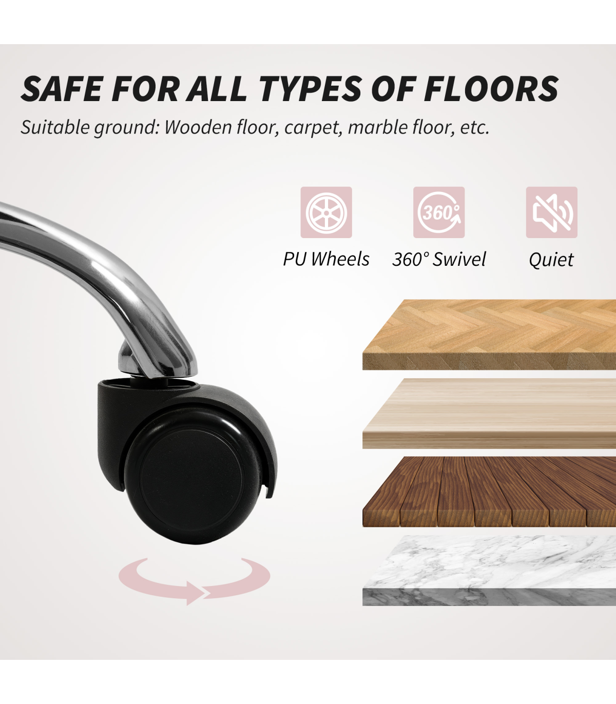 ? 360° swivel seat and PU wheels allow easy movement on various flooring types