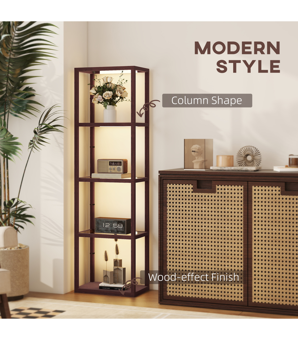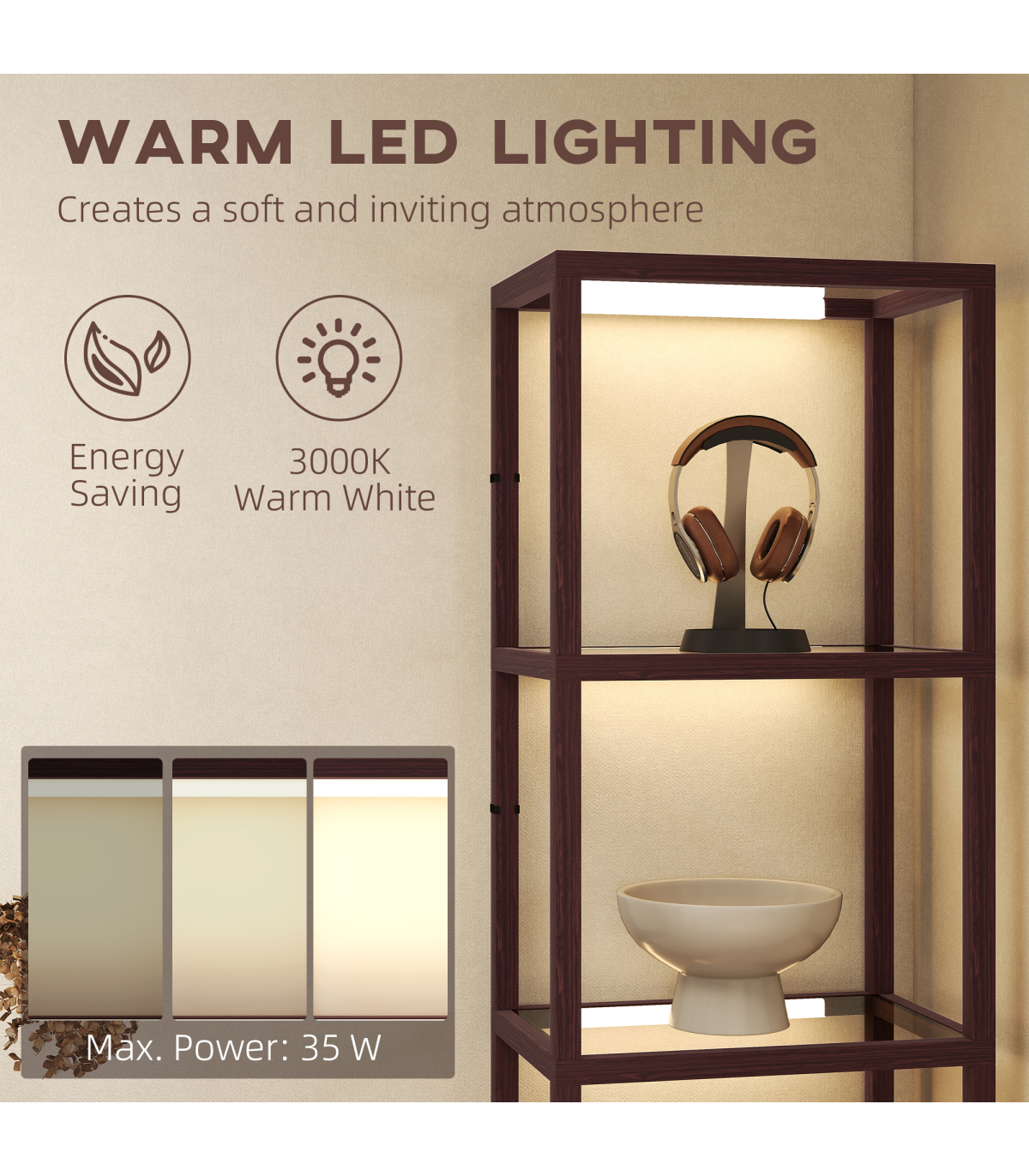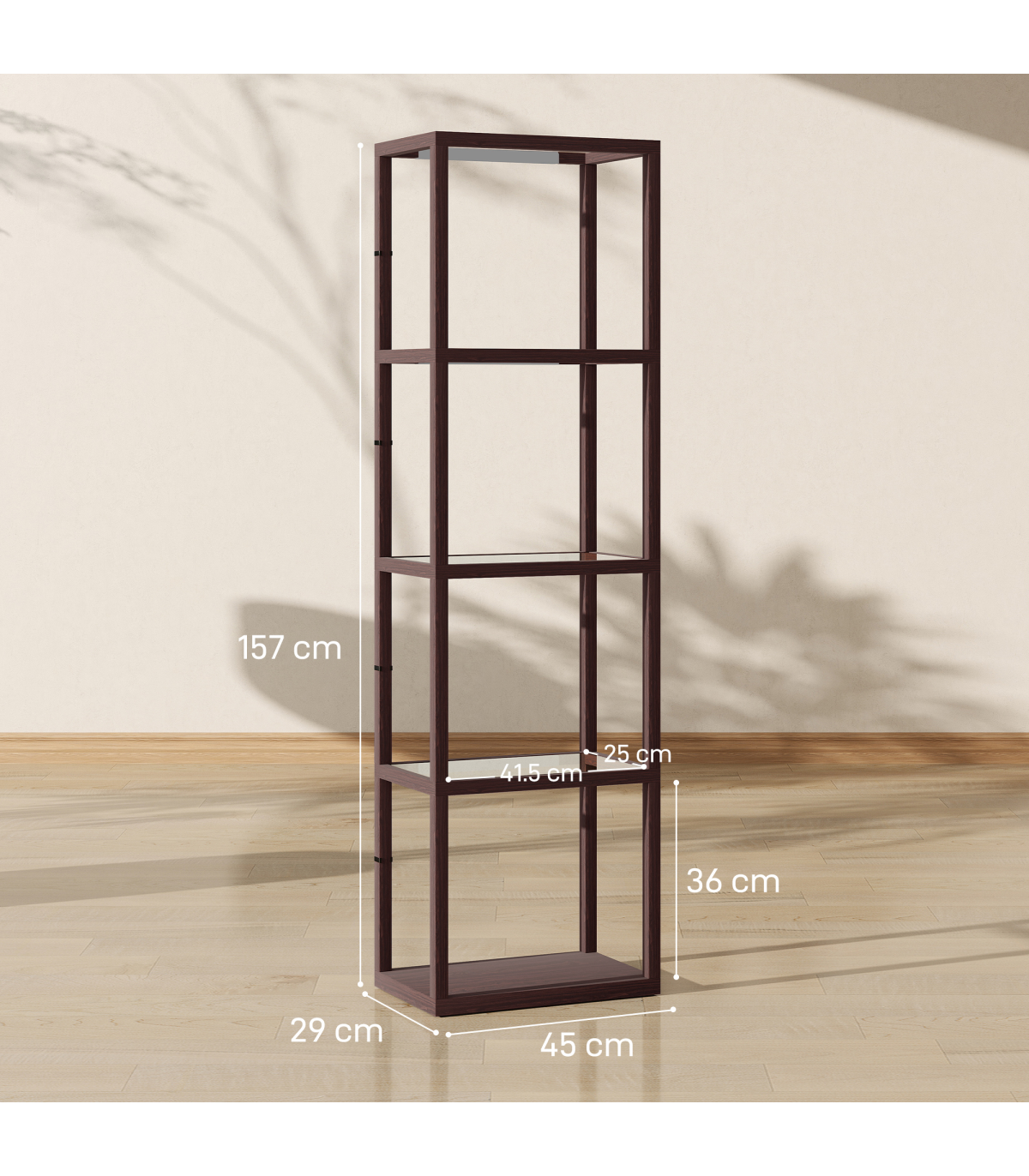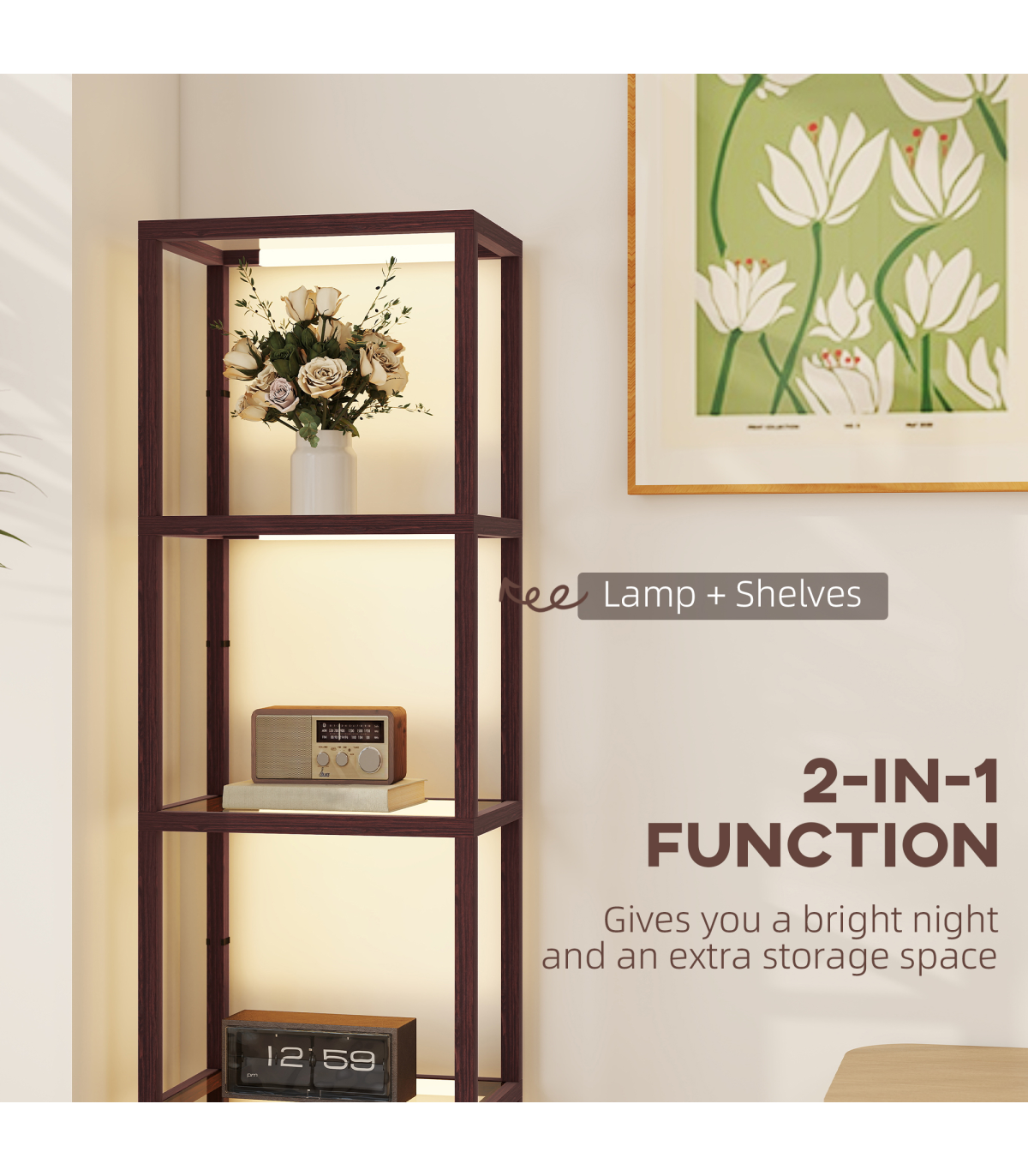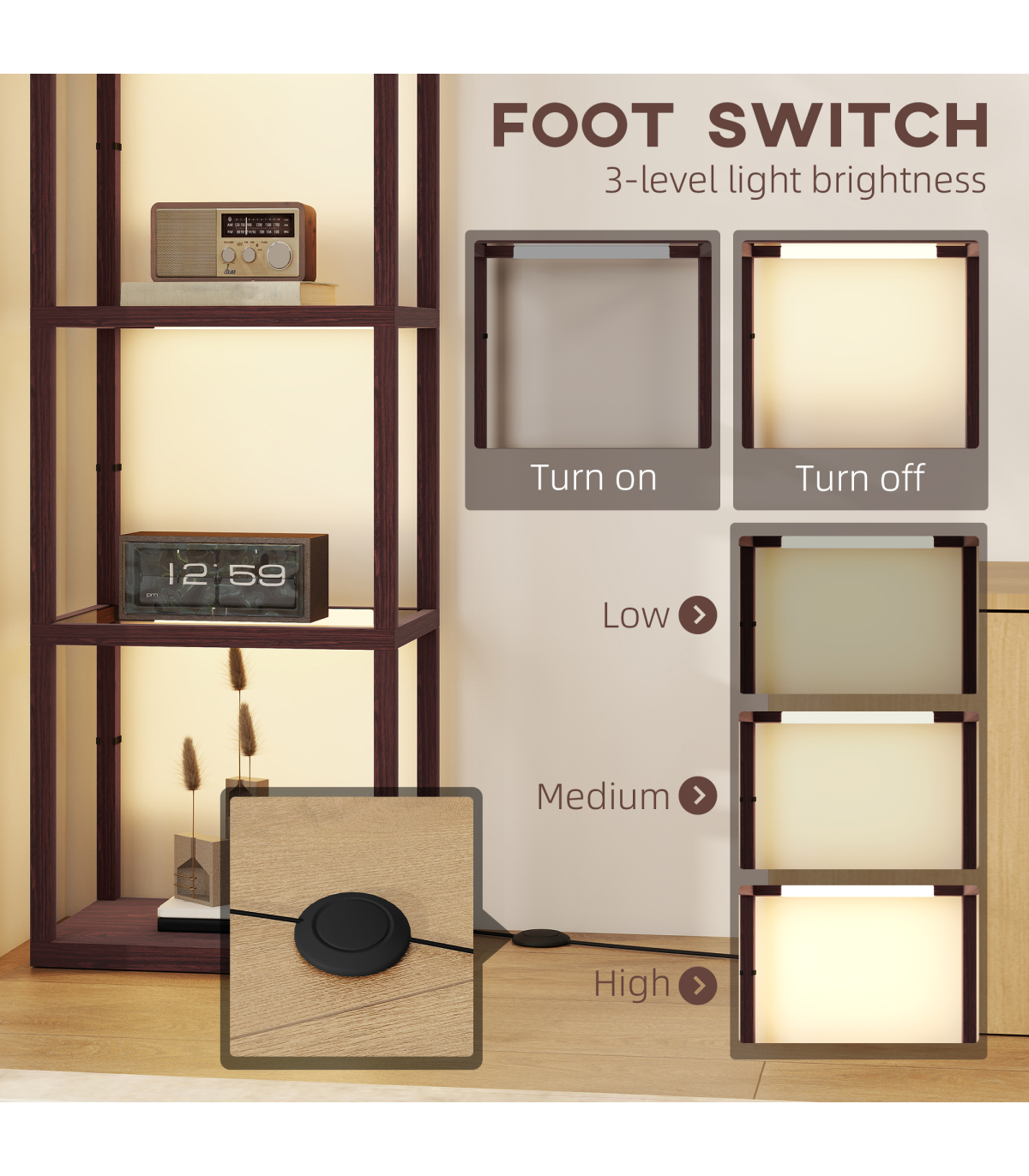 A dash of light for the warm ambience - simply pop this HOMCOM LED floor lamp with shelves into your chosen corner to start enjoying the beautiful illumination. This tall lamp is fitted with warm white LED light lines: 3000 K with three-level adjustable brightness. This bedroom lamp serves as a shelving unit with four-section storage to keep your favourite pieces on show. Tempered glass shelves add a sleek touch and help light transmission. Plug in and step on the foot switch to start enjoying.