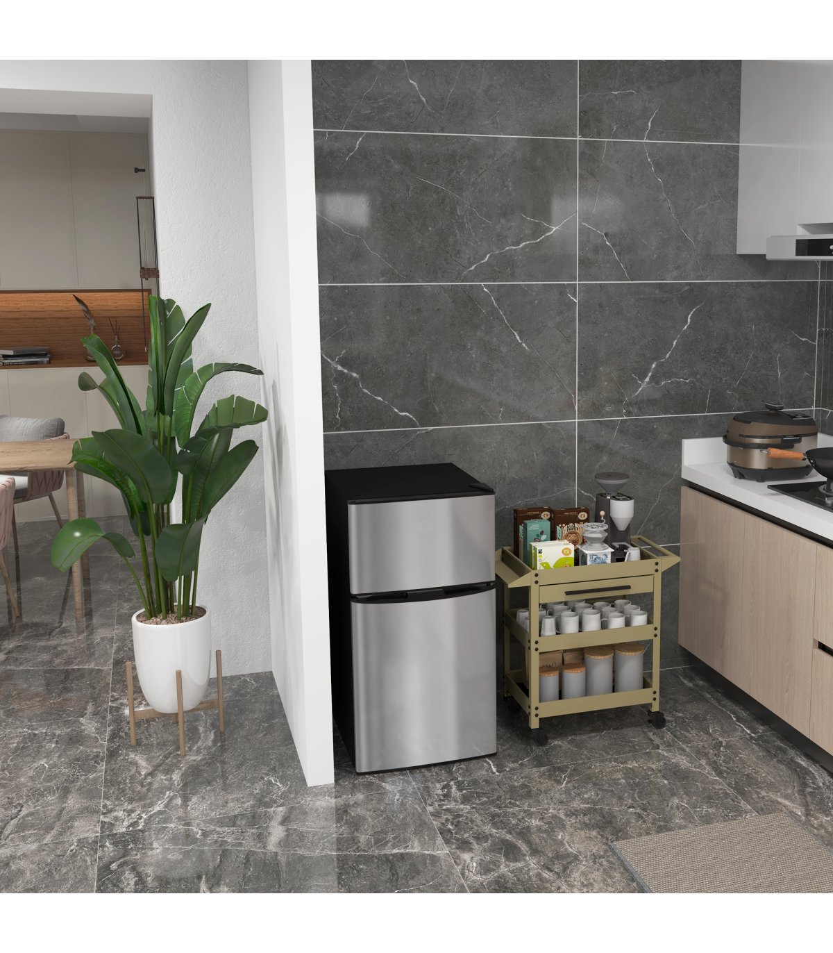 Even small spaces can accommodate fresh food with this HOMCOM under counter fridge freezer. Combining a 25L upper freezer and 63L lower fridge, you can safely store plenty of food and drinks. With two removable shelves, a crisper drawer, door racks and reversible doors, you have full control over how you use this fridge. Low-power and quiet under counter fridge — efficient and unobtrusive for any room.