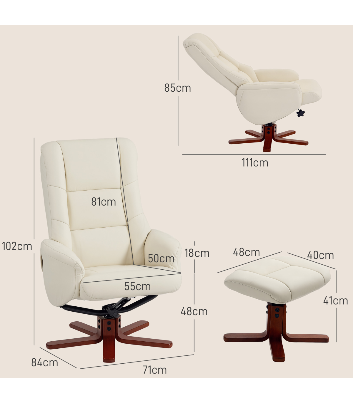 ● Overall Dimension: 71W x 84D x 102H cm (Chair), 48W x 40D x 41H cm (Ottoman)