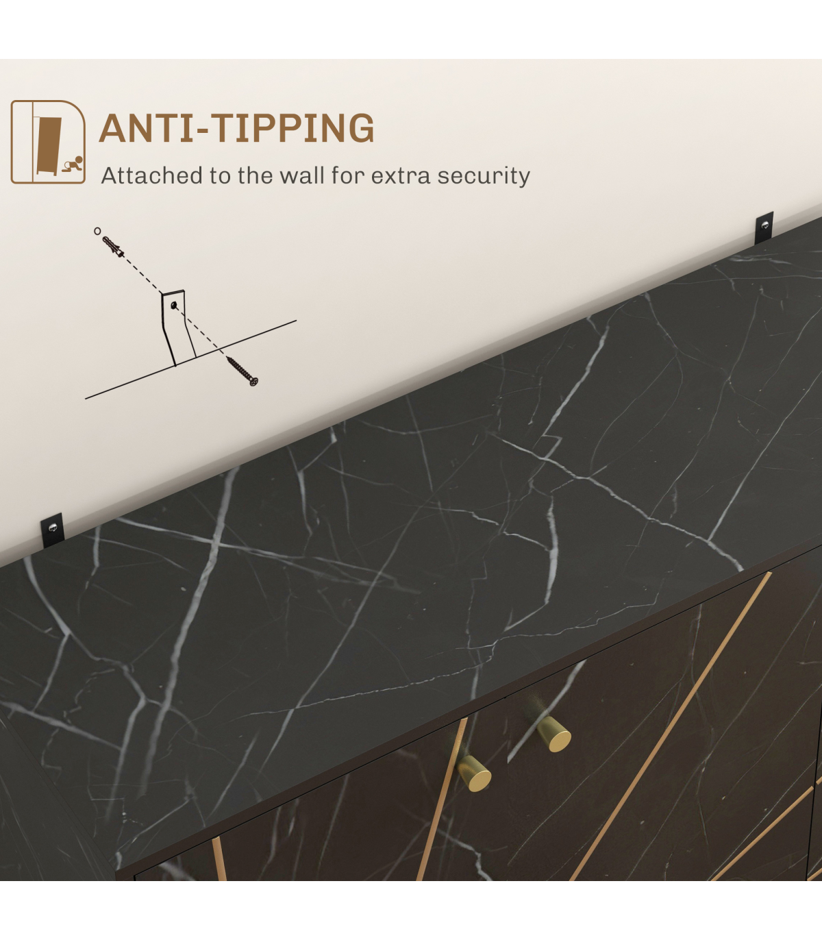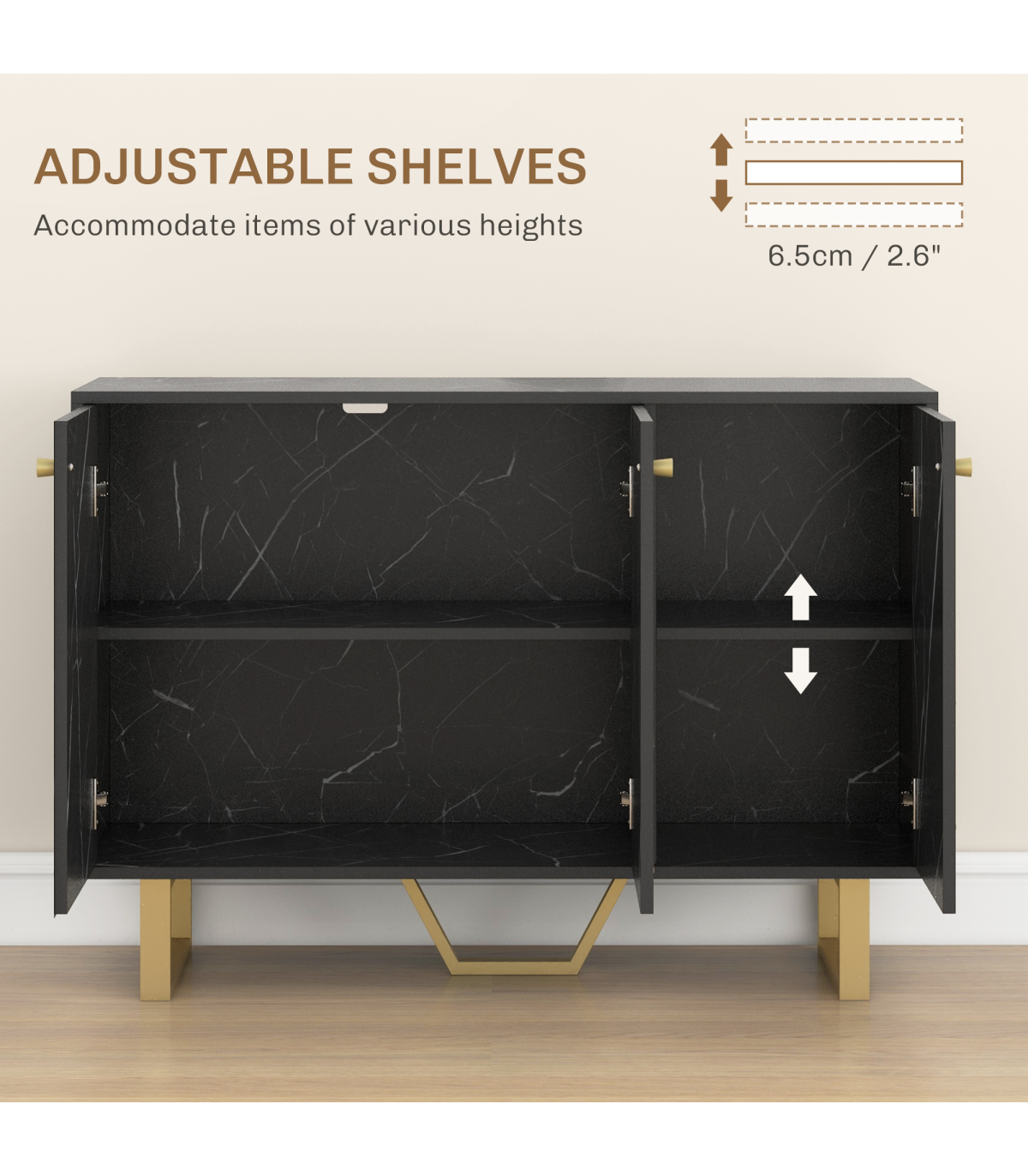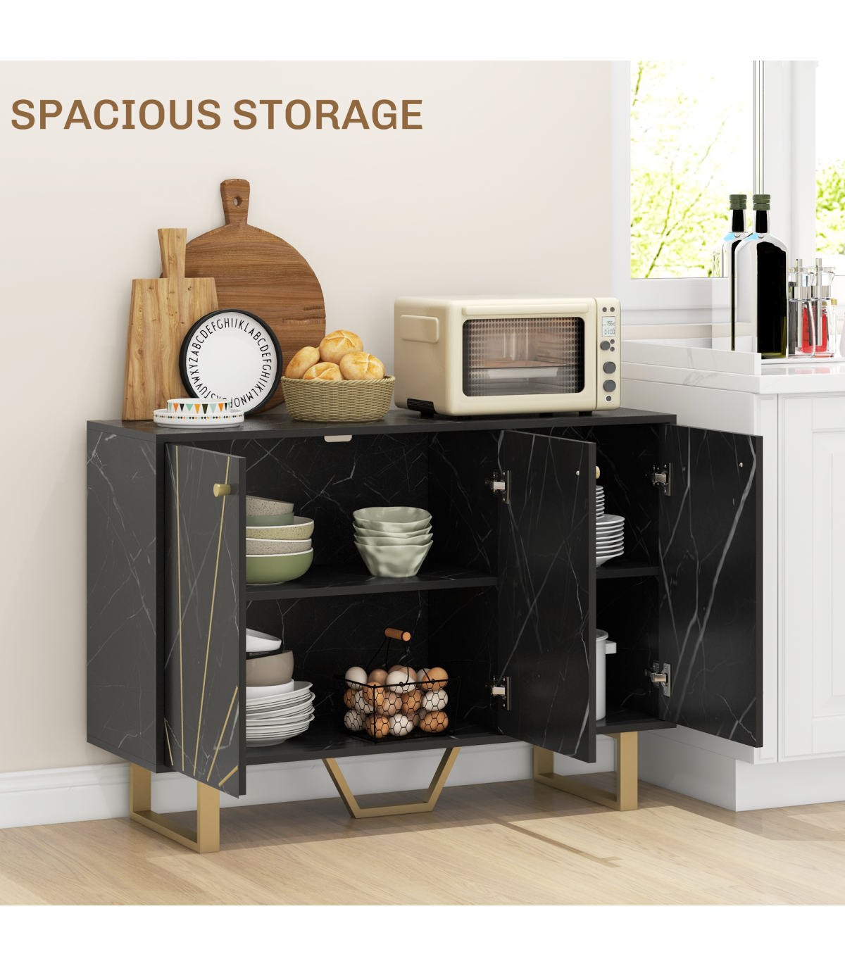 Elevate your space with the HOMCOM kitchen storage cabinet, where modern luxury meets functionality. Adorned with a chic marble texture and glamorous gold-tone legs and handles, this sideboard combines style with practicality. It features spacious cabinets, including a large double-door and a smaller single-door, each housing a 3-level adjustable shelf to cater to your storage needs. Add a touch of sophistication to any room!