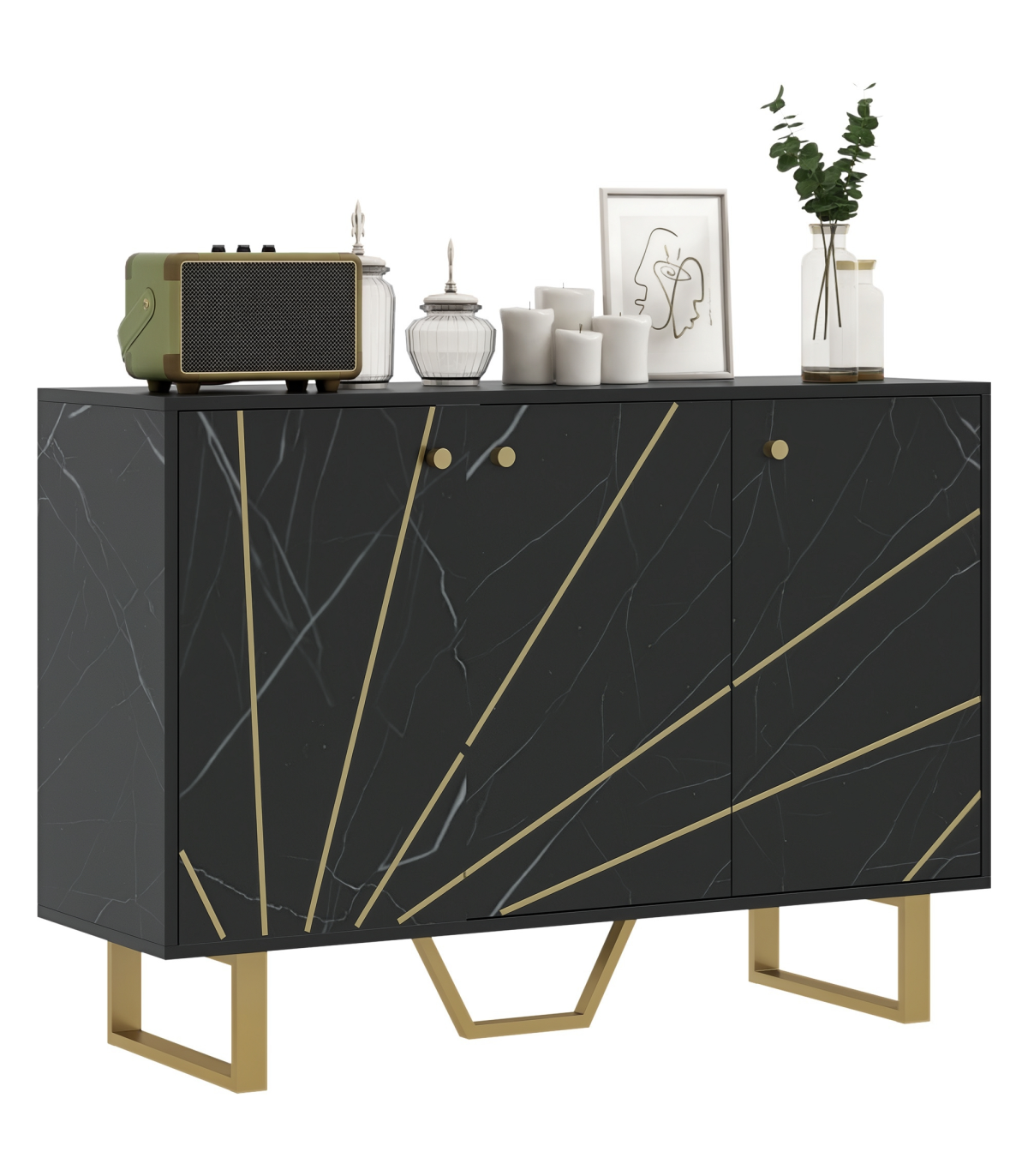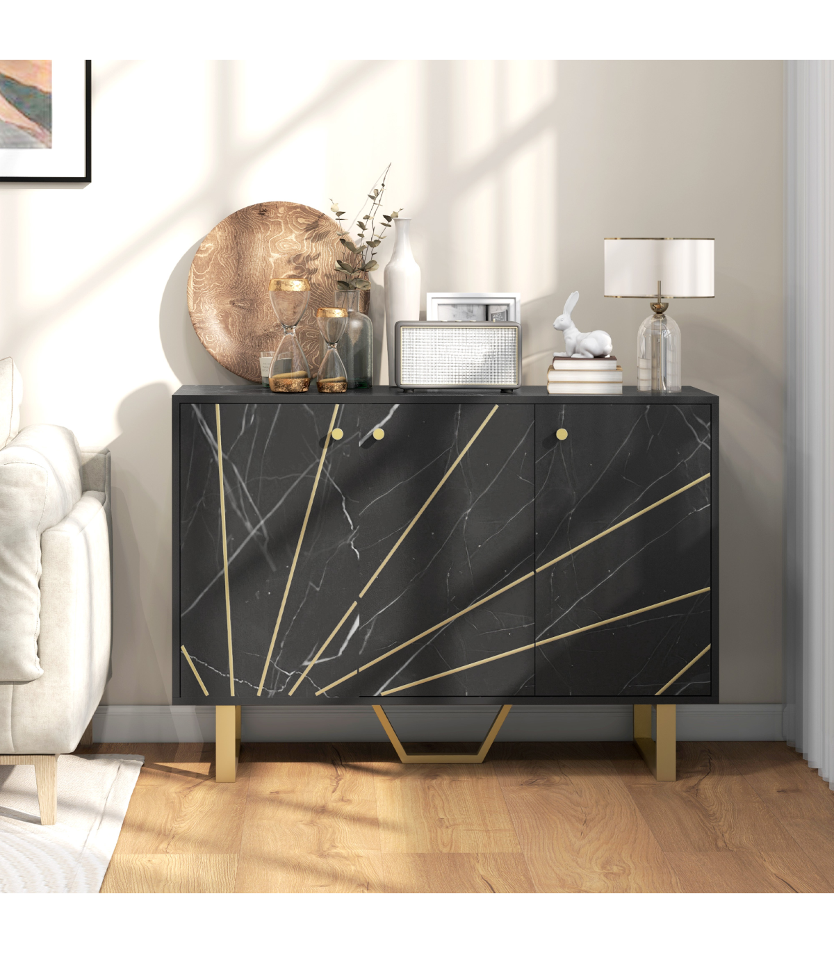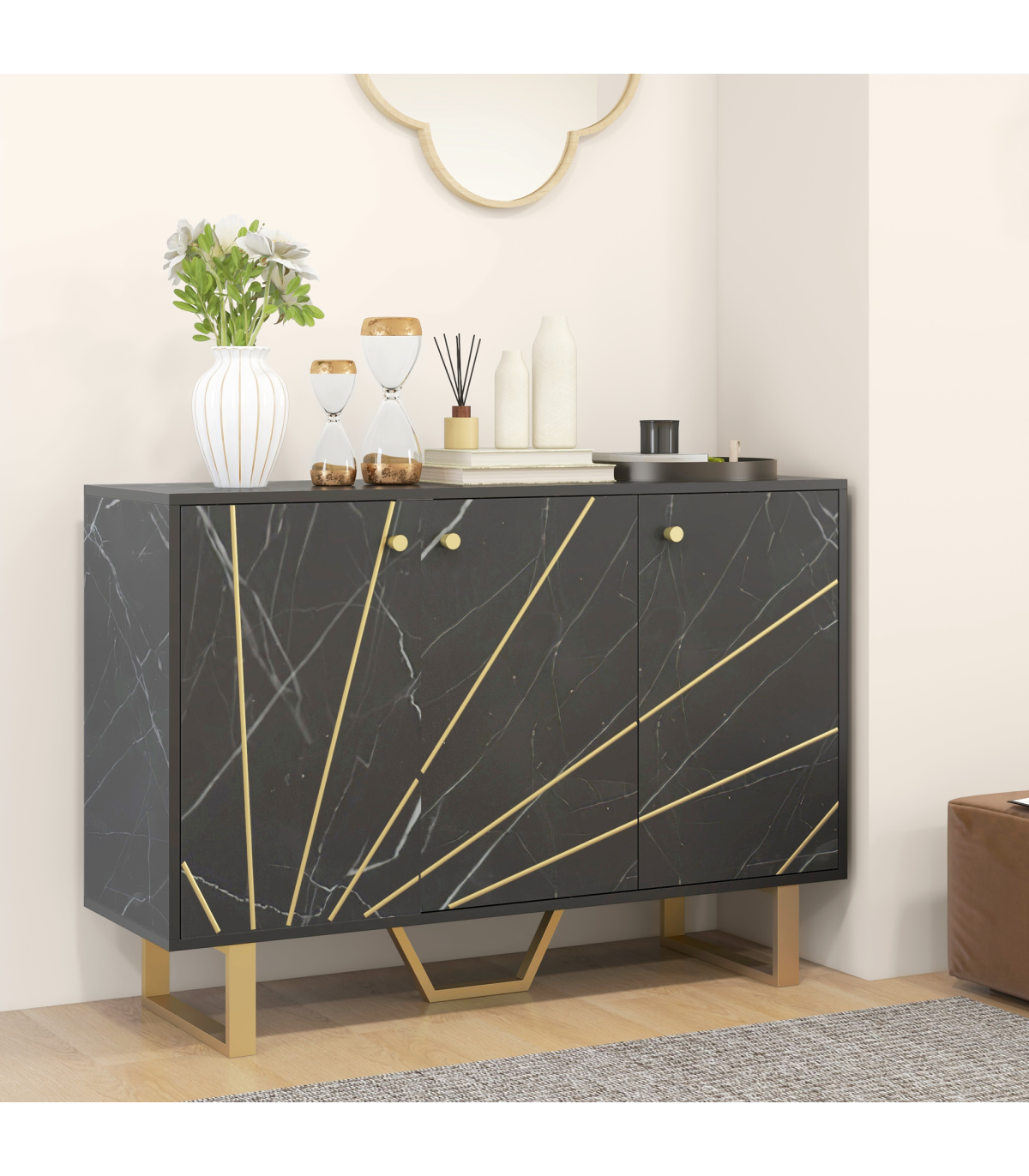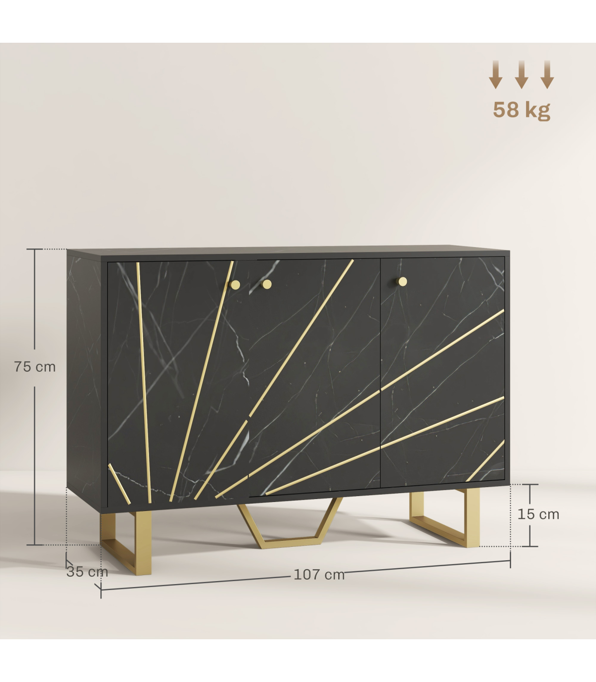 Elevate your space with the HOMCOM kitchen storage cabinet, where modern luxury meets functionality. Adorned with a chic marble texture and glamorous gold-tone legs and handles, this sideboard combines style with practicality. It features spacious cabinets, including a large double-door and a smaller single-door, each housing a 3-level adjustable shelf to cater to your storage needs. Add a touch of sophistication to any room!