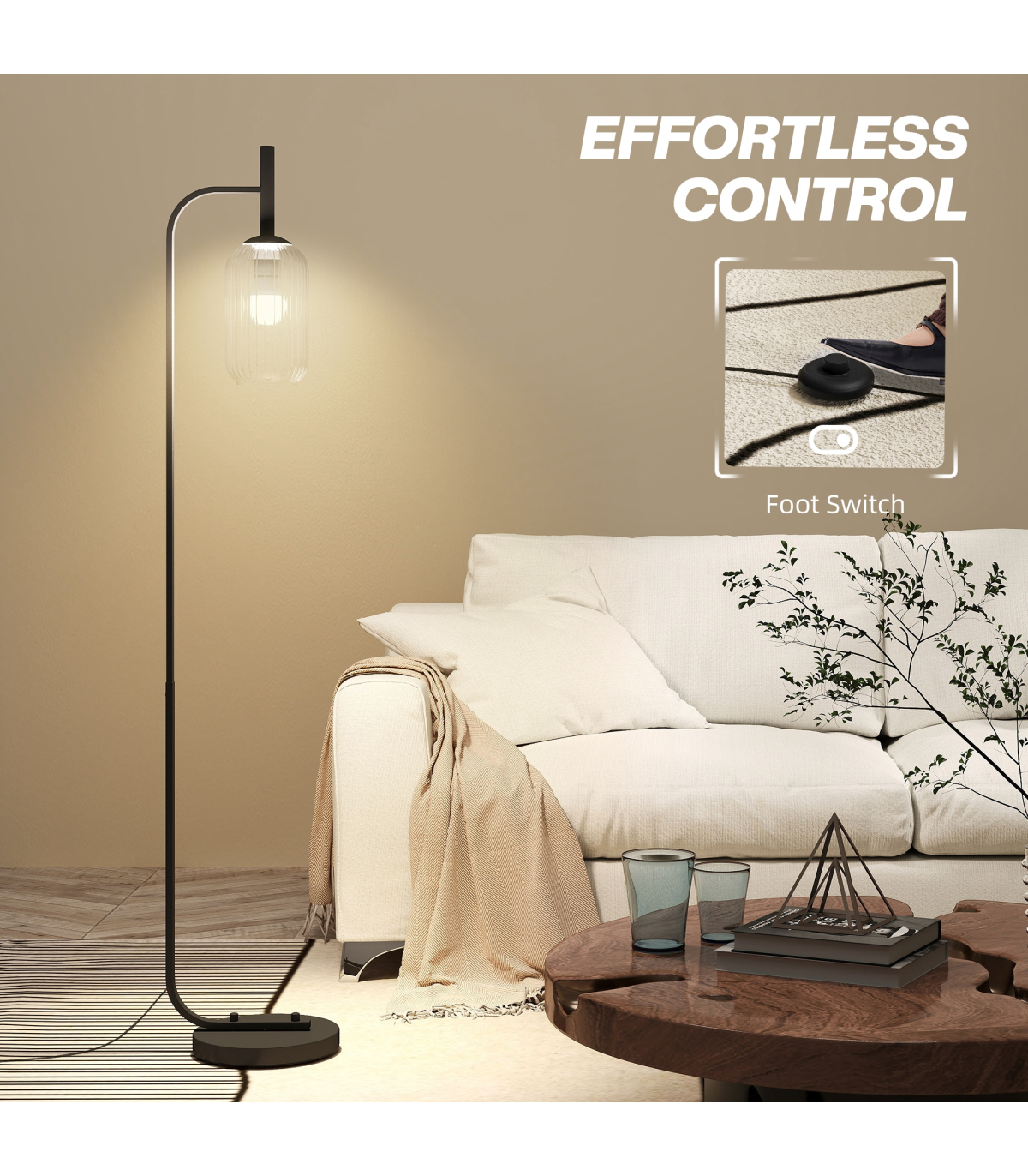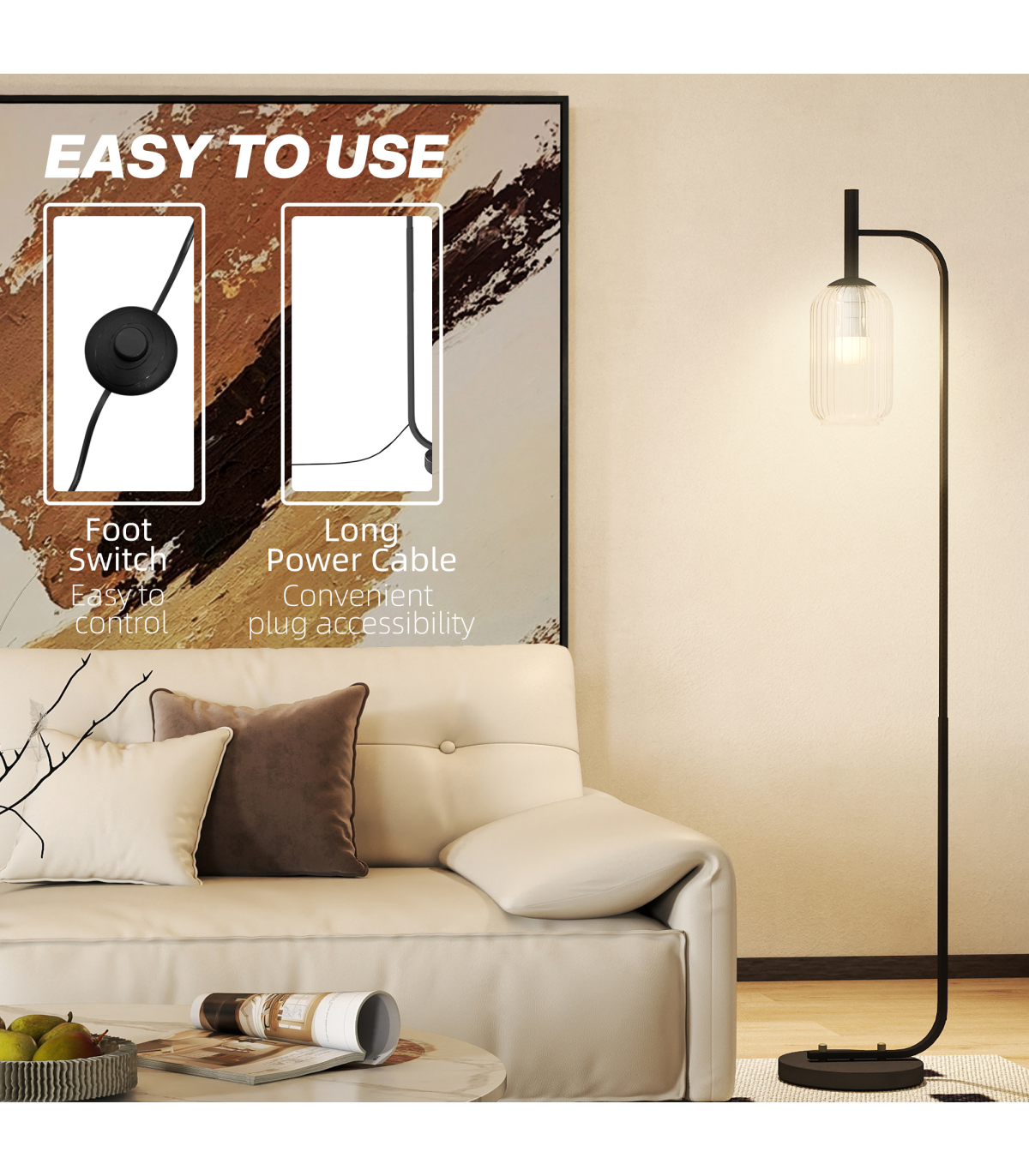HOMCOM Modern Floor Lamp with Glass Lampshade, Foot Switch for Living Room