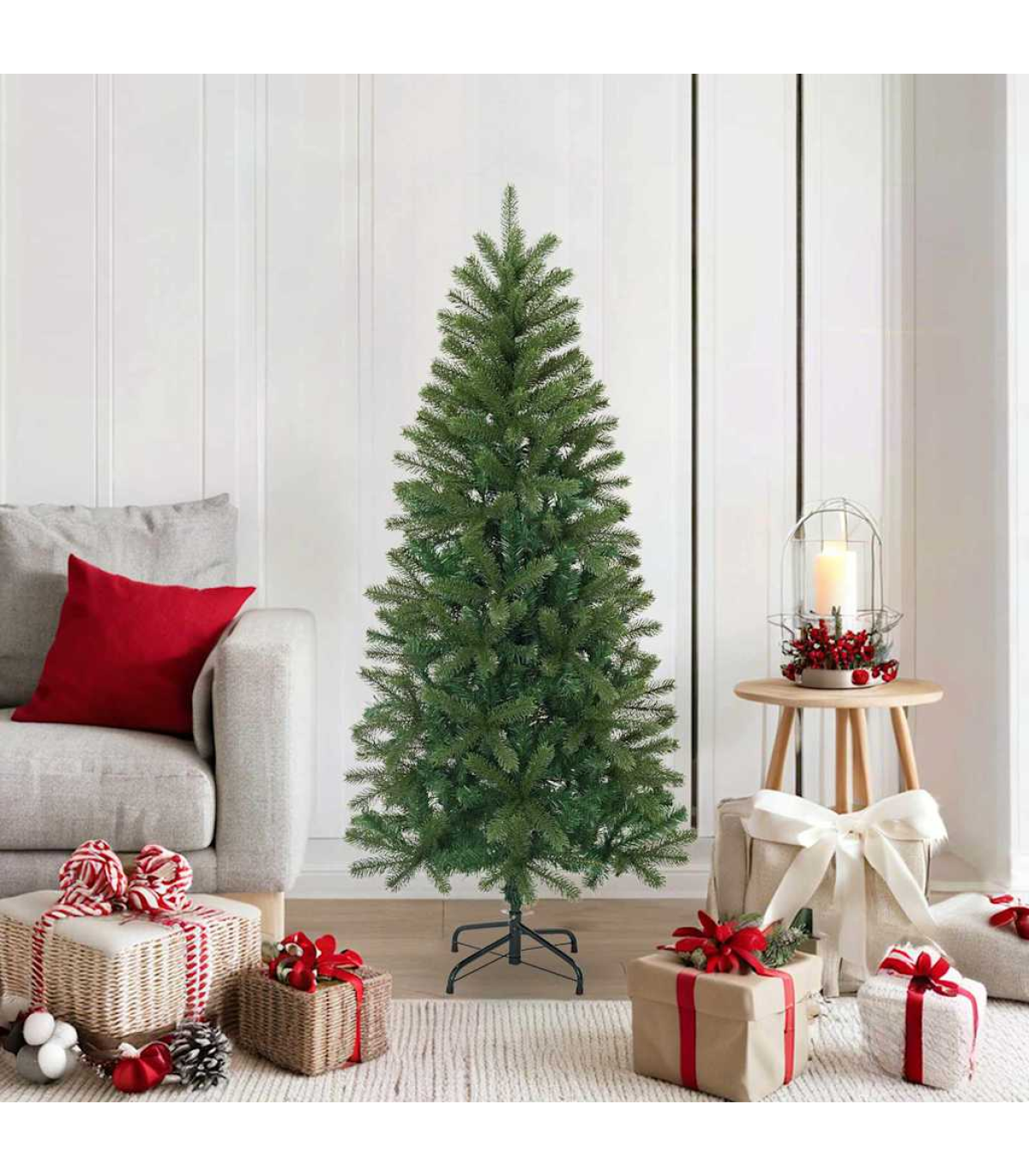This Modern Artificial Christmas Tree is a pristine embodiment of contemporary style blended with classic holiday spirit. Designed to bring life and light to any room or outdoor shelter, its lush green branches made from durable PVC and PE offer a realistic and lasting appearance. Perfect for both indoor and sheltered outdoor use, the tree stands as a centerpiece of seasonal décor, effortlessly transforming any living room, garden, or terrace into a festive wonderland, suitable for gatherings, celebrations, or quiet family moments. Quality Materials: Crafted from a durable combination of PVC and PE, this tree stands out for its ability to mimic the natural look and feel of a genuine Christmas tree, ensuring it remains a cherished part of your seasonal décor for years. Sturdy Construction: Supported by a robust iron stand, the tree remains firm and stable, providing a sound foundation for your holiday ornaments and lights, thus safeguarding your seasonal decorations from tilting or toppling over. Modern Design: This tree adopts a sleek, modern design with minimal ornamentation, making it a versatile choice for spaces that value simplicity without sacrificing festive spirit. This design exudes timeless elegance, ensuring it complements various décor styles seamlessly. Seasonal Versatility: Perfect for both living rooms and sheltered outdoor areas, this tree engages the holiday spirit in diverse environments. Its adjustable features provide the flexibility to fit within different spatial setups, making it truly adaptable. Easy Maintenance: The tree comes with straightforward assembly instructions, requiring just a screwdriver and the efforts of two people, making it a convenient choice for those looking to decorate with minimal fuss during the busy holiday rush.