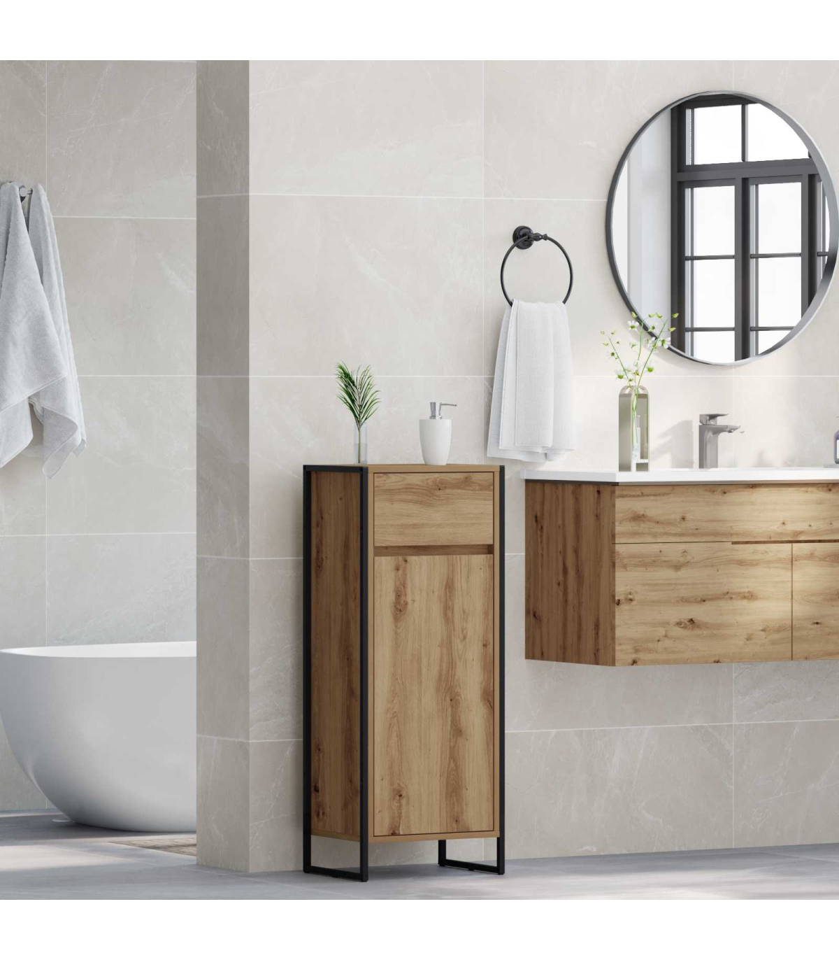 This Industrial Bathroom Cabinet serves as a perfect blend of style and practicality, elevating the aesthetic of your bathroom with its sleek rectangular shape. Crafted with precision from engineered wood, it is designed to provide long-lasting performance in indoor environments. With its thoughtful dimensions of 40 x 30 x 100 cm, this cabinet can effortlessly be incorporated into smaller spaces, making it an ideal choice for modern bathroom settings where space and style are priorities. Engineered Wood Craftsmanship The cabinet is skillfully constructed from engineered wood, offering a high degree of stability and robustness. This material ensures the cabinet maintains its appearance and structural integrity over time, proving its worth especially in the moisture-prone environment of a bathroom. Solid Steel Legs: The use of steel for the legs provides increased stability and support for the cabinet. Not only does this contribute to the overall durability, but it also adds a contemporary touch, enhancing the industrial style and modern appeal of your bathroom decor. Ample Storage Capacity: With a neatly organized interior, the cabinet features multiple compartments that provide generous space for storage. This design perfectly accommodates toiletries, towels, and other essentials, keeping them neatly hidden yet easily accessible. Indoor Use : Designed expressly for indoor use, the cabinet fits seamlessly into the bathroom setting. It contributes to the functionality and decor, providing both aesthetic appeal and practical utility without overwhelming the space. Ease of Assembly : Assembly requires two people using a screwdriver, ensuring all parts fit securely and safely. The process is straightforward enough to be completed within the confines of the bathroom without requiring extensive tools or experience.