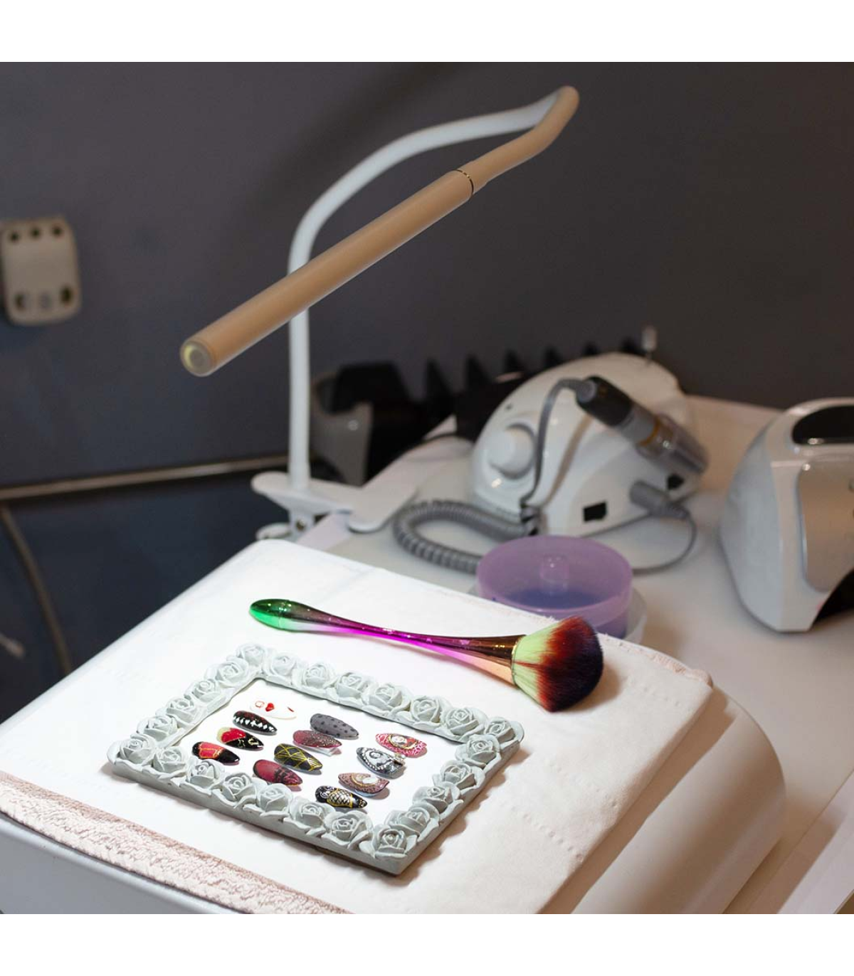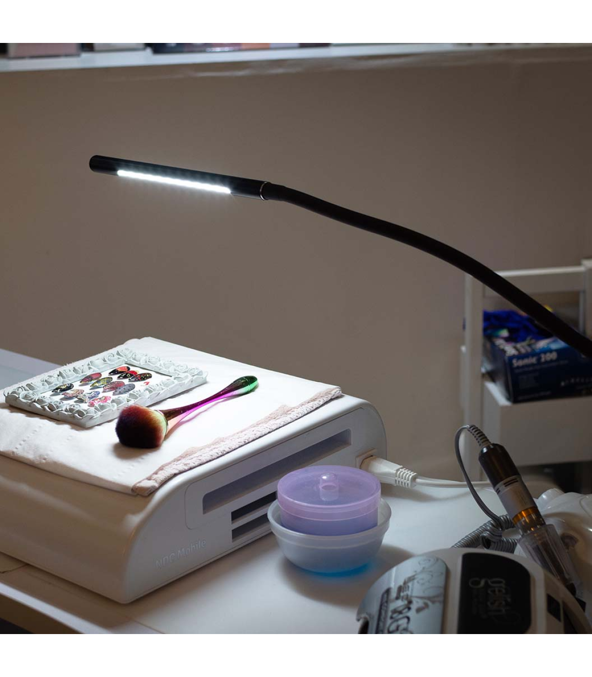 Introducing the Slim Lamp Flex, a stylish and portable lighting solution designed for professionals on the move. Powered by USB, this lamp easily connects to adapters or chargers, ensuring you have light wherever you go. The Slim Lamp Flex is perfect for mobile beauticians, nail technicians, crafters, and anyone needing a reliable, adaptable light source. Its sleek design and practical features make it an essential addition to any professional toolkit.