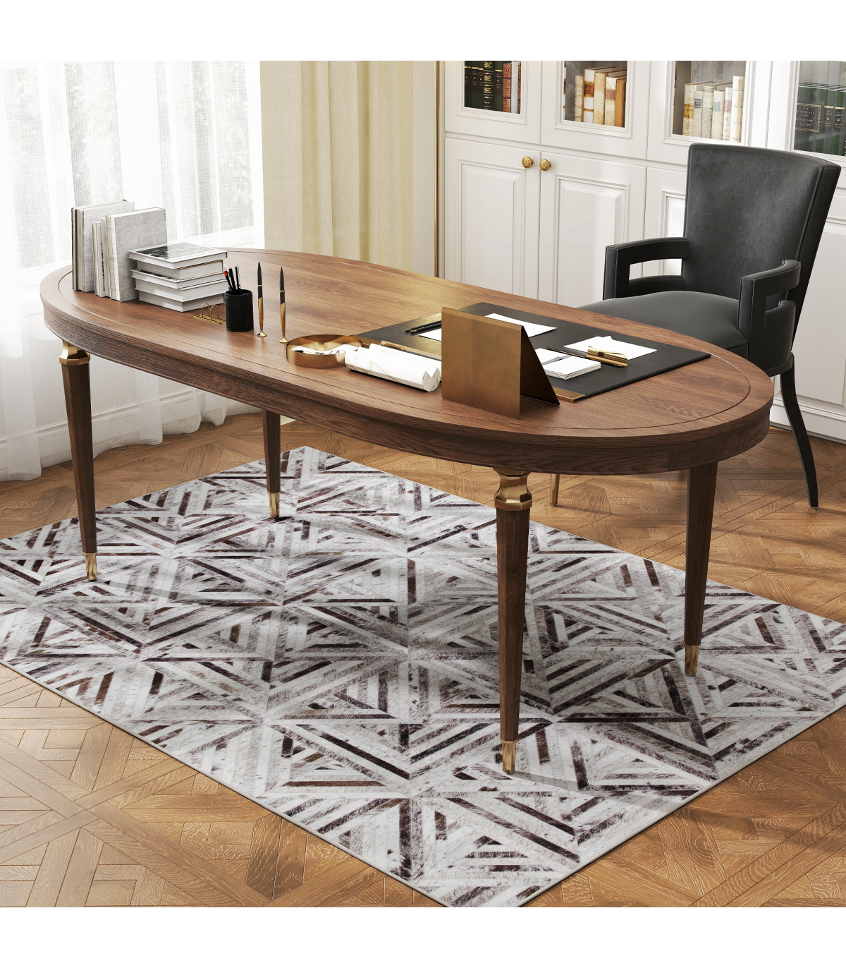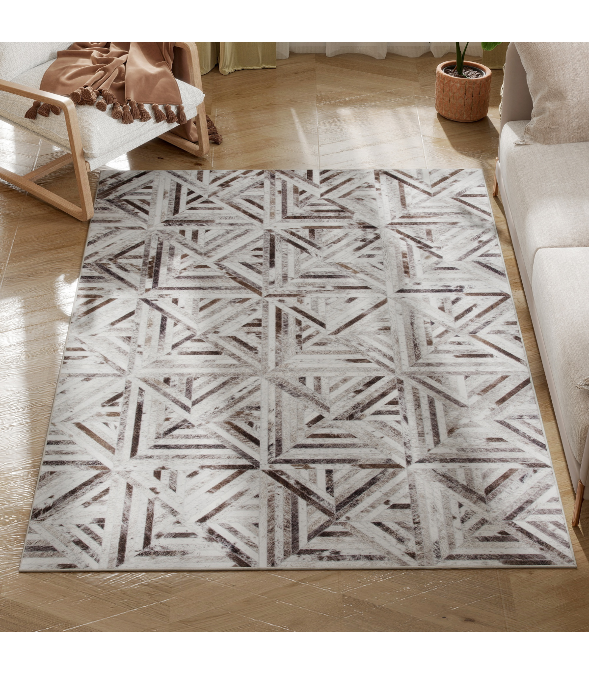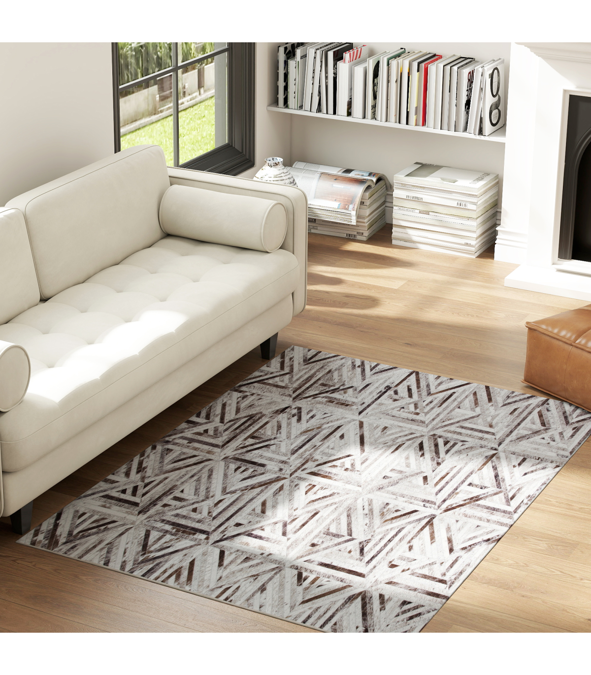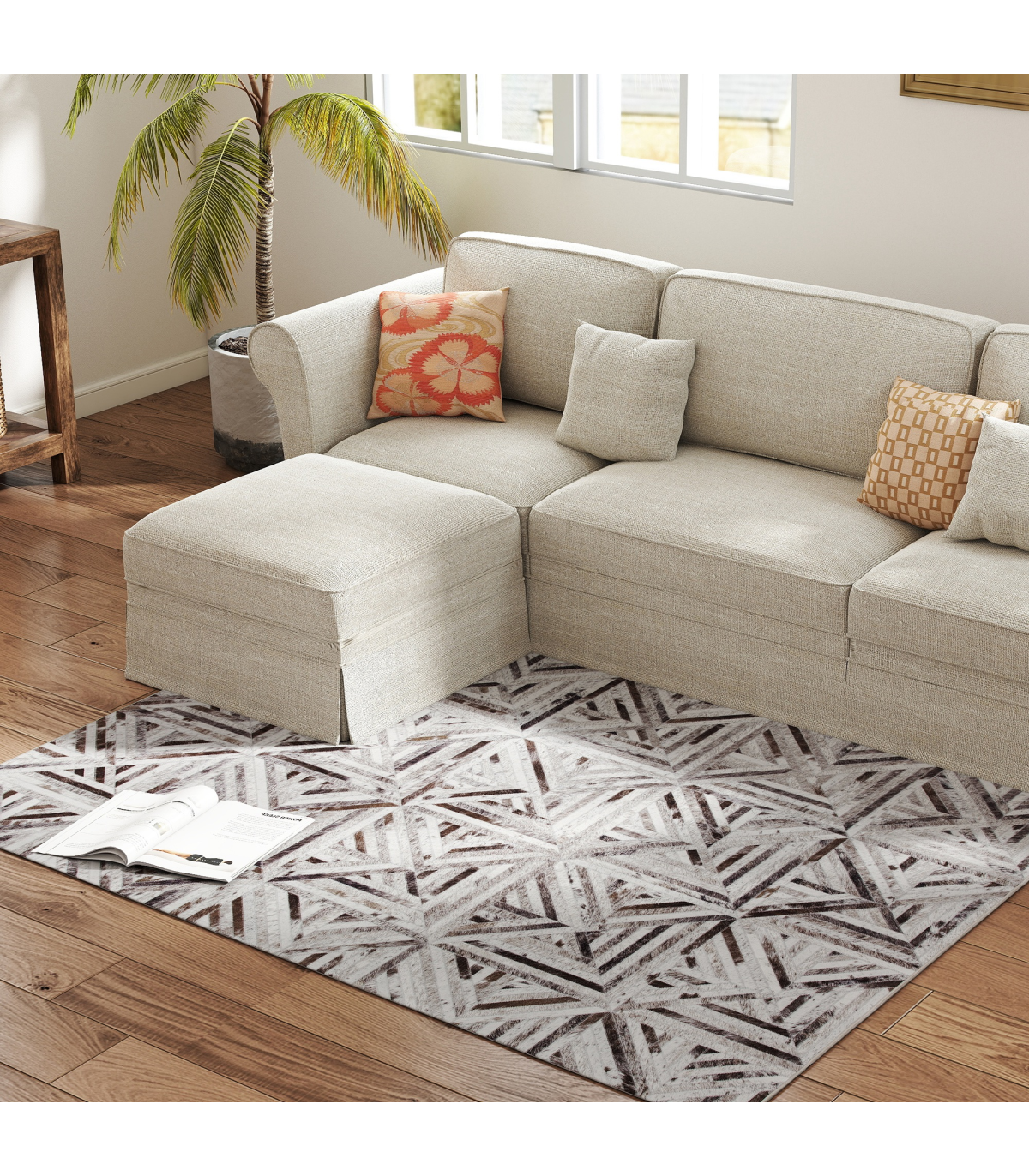 ● Heat transfer printed carpet with faux leather patchwork adds modern luxury and durability