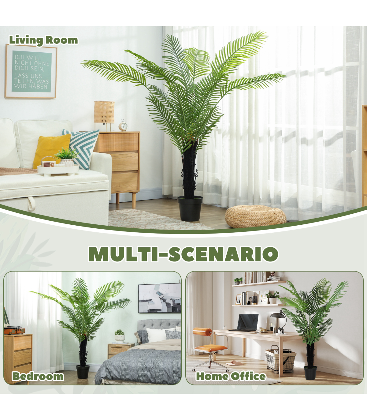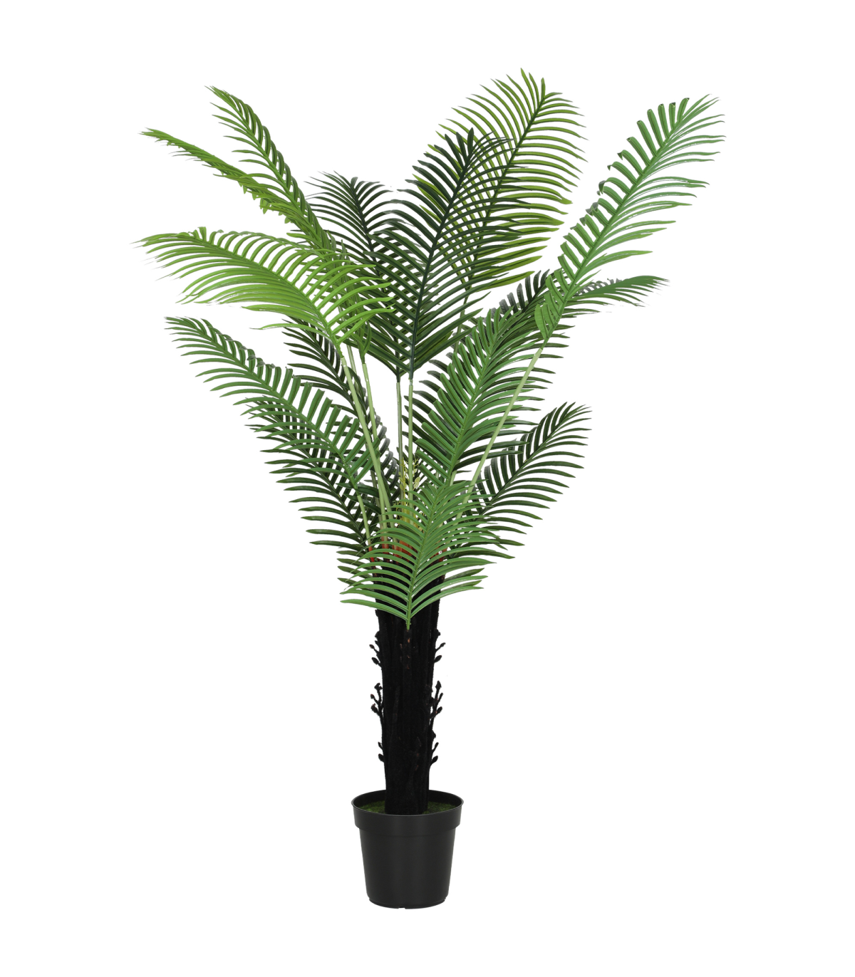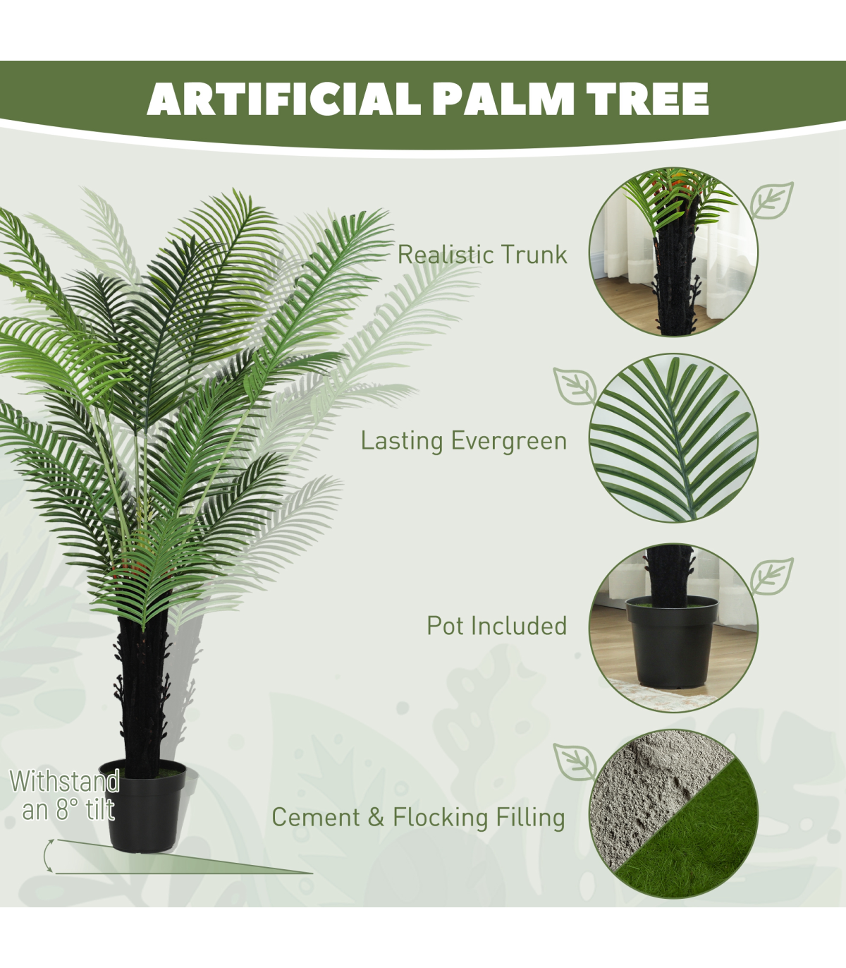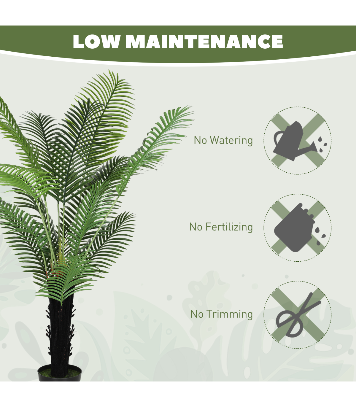 ● PE leaves and flocked trunk mimic realistic, tropical aesthetics
