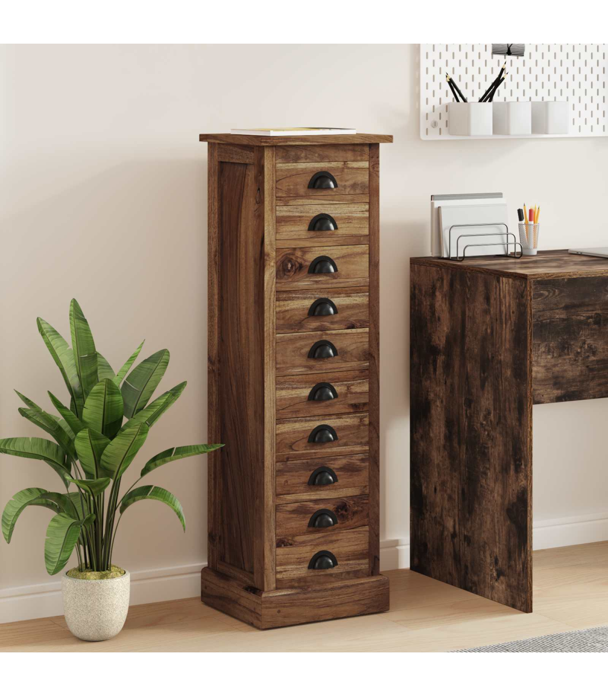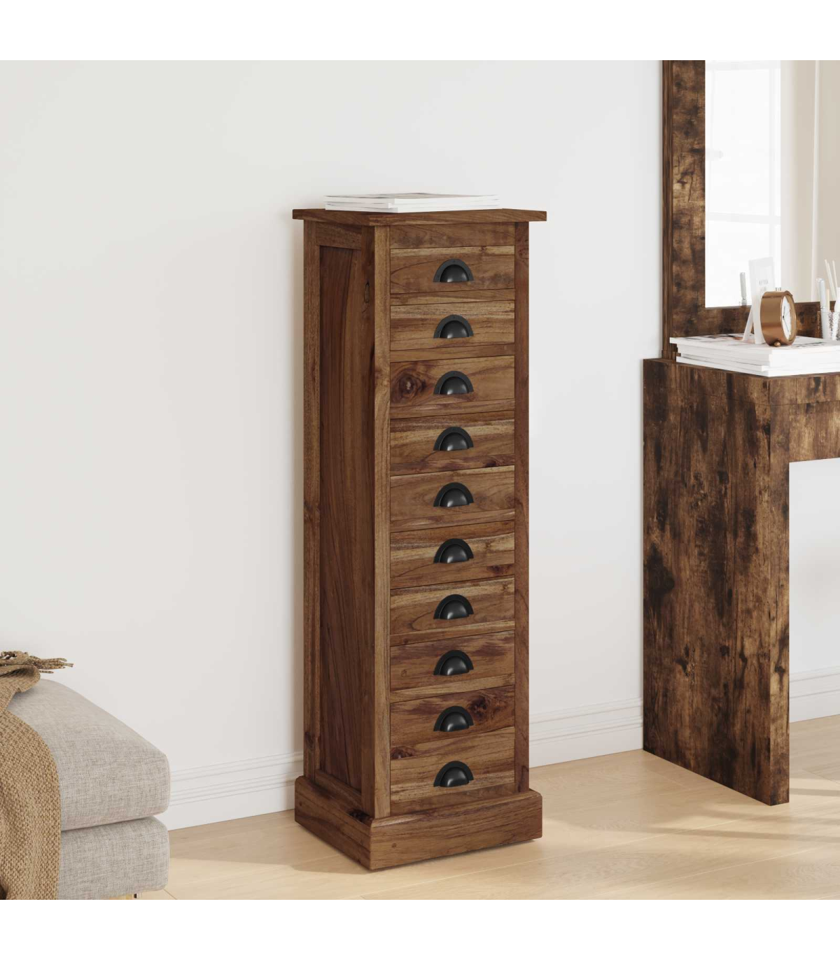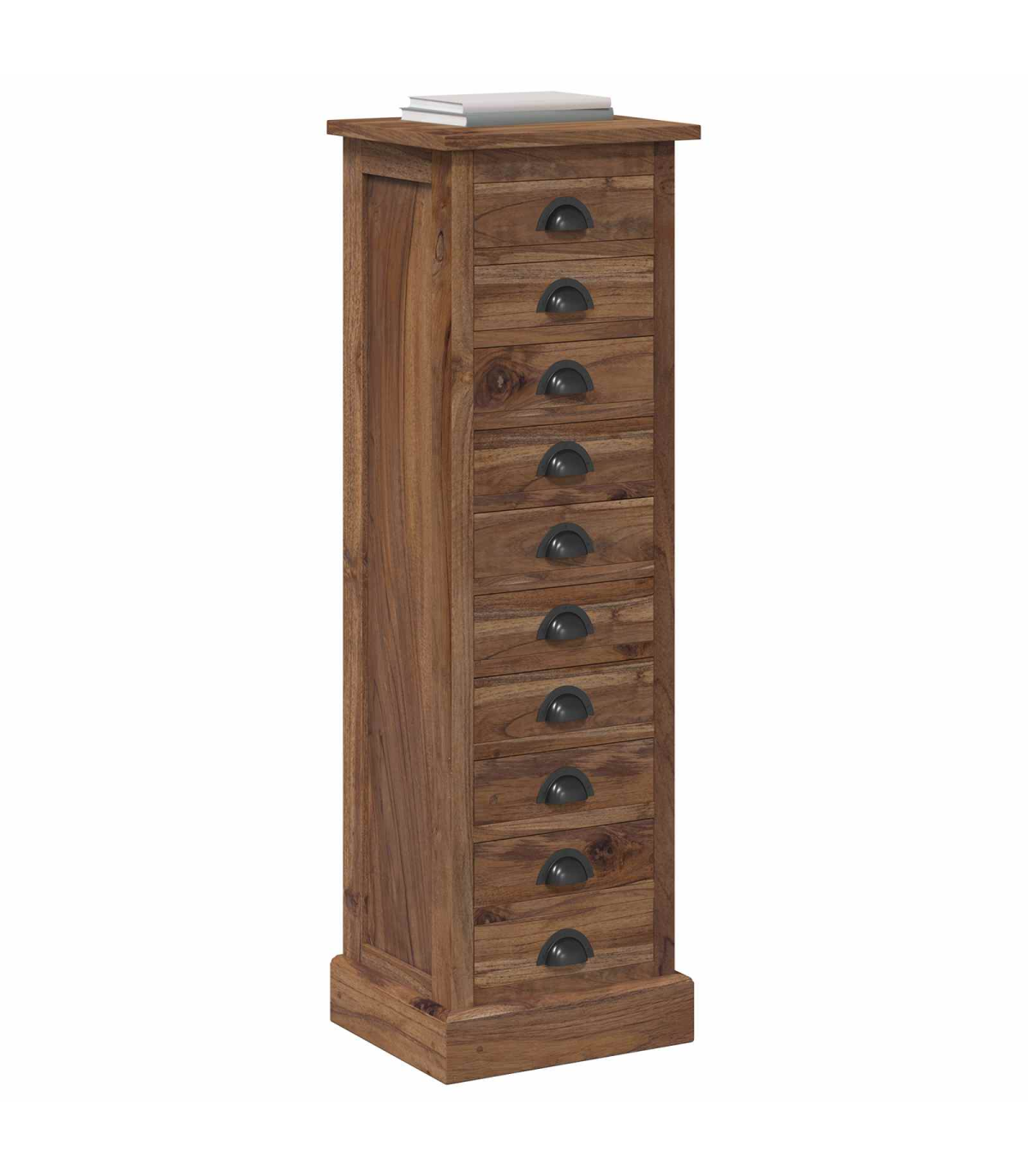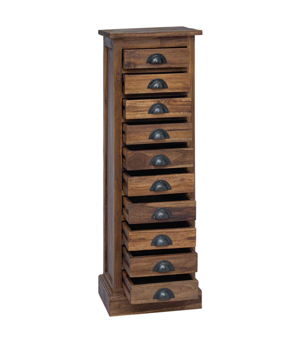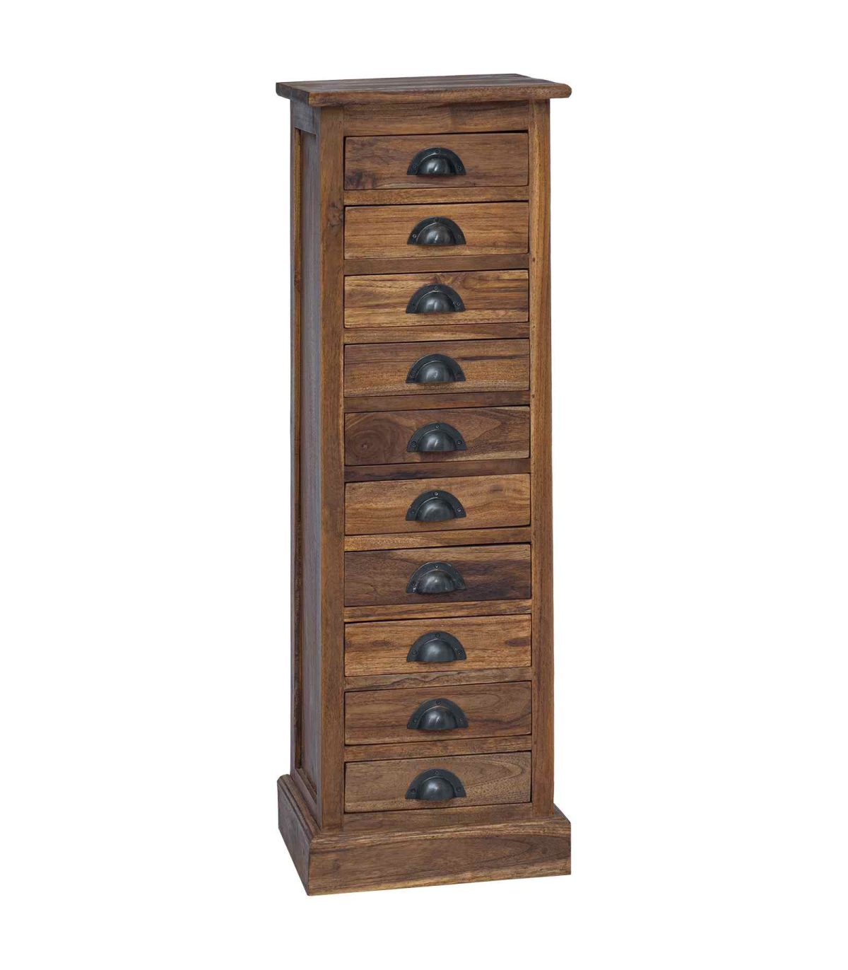 This exquisite Chest of Drawers combines timeless elegance with practical functionality, making it an ideal addition to any living room or bedroom. Crafted from Solid Teak Wood, this storage unit showcases an appealing vintage style, reflecting the grace and charm of a previous era while meeting modern storage needs with ease. Its rectangular shape provides a sturdy build that can effortlessly complement various home decors. Whether situated in a cozy corner or used as a centerpiece, this Chest of Drawers adds a touch of refinement and ample storage space, all in a compact form that fits perfectly in diverse residential settings. Solid Teak Materials Crafted from premium Solid Teak Wood, both the frame and the drawers of this unit provide unwavering support and finesse. The natural grain enhances its aesthetic appeal, offering a visually pleasing texture that stands out in any room. Functional Components Featuring multiple traditional drawers with cup pulls, this piece offers ample storage space for your essentials. The black metal handles contrast beautifully with the brown teak, introducing an element of sophistication to the entire design. Timeless Features Handmade with attention to every detail, its vintage style and space-saving attributes make it a cherished piece for those valuing both function and form. The fine sanded, smooth finish ensures a tactile and visual treat, adding elegance to everyday storage. Versatile Uses This Chest of Drawers is perfect for living rooms, bedrooms, or any interior space needing stylish organization. Its compact size makes it ideal for both larger and more intimate settings, adapting seamlessly to varying room conditions. Care &Maintenance Maintain its pristine appearance by avoiding abrasive cleaners. A simple wipe with a soft cloth ensures the furniture remains a timeless element in your living space, contributing to a clean and respectable appearance over the years.