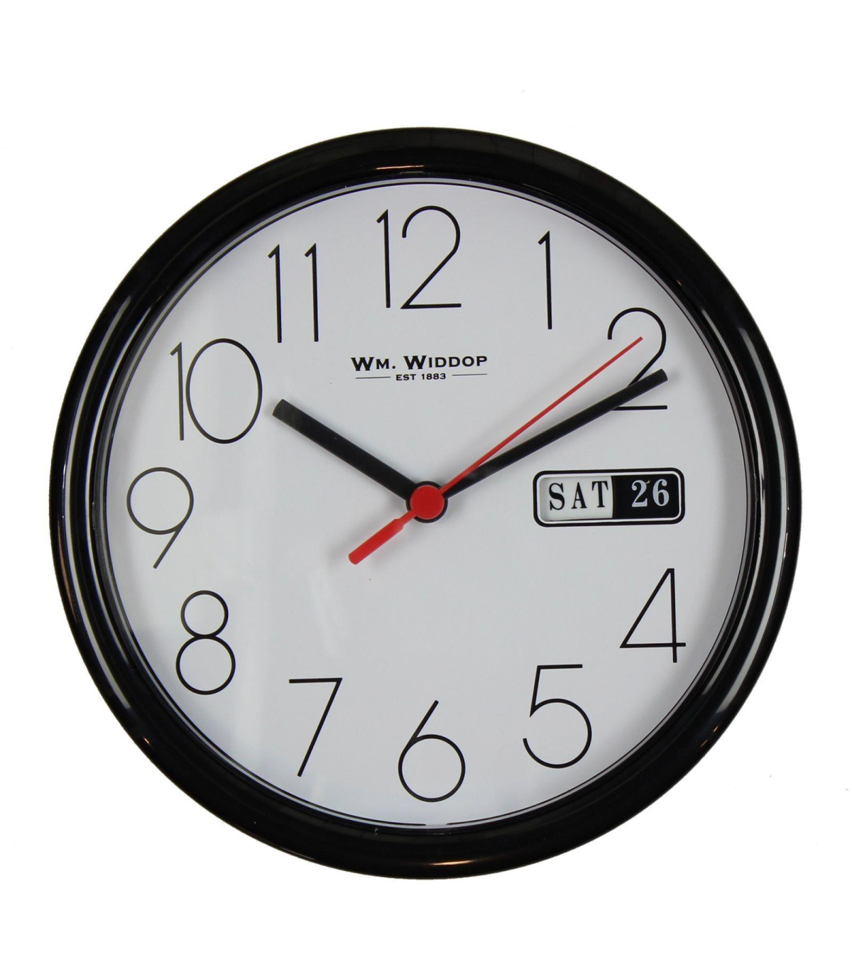 Wm.Widdop Day/Date Wall Clk-Black Case White Dial 8.5"Rnd