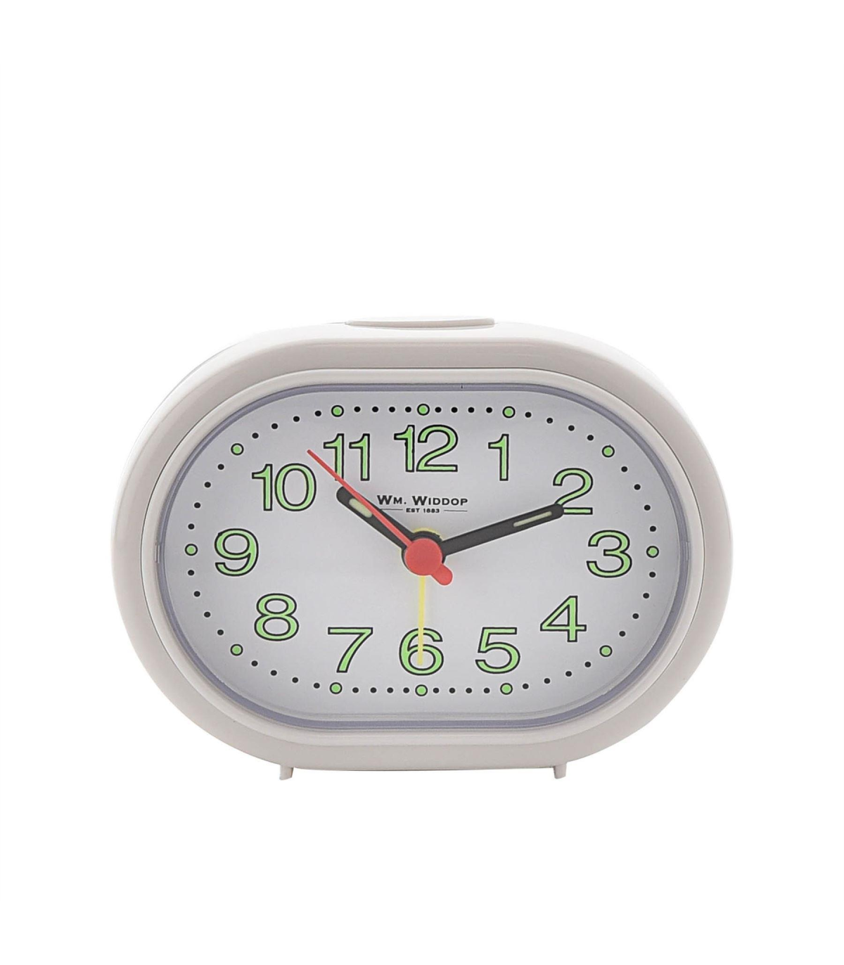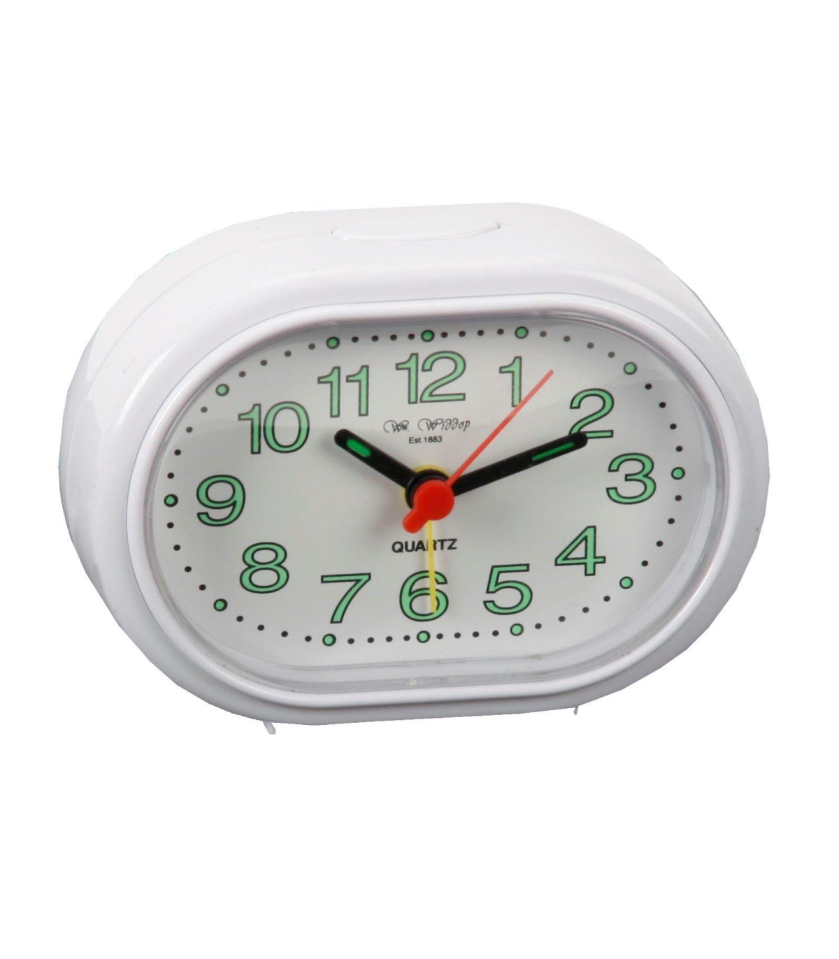 A White oval alarm clock from William Widdop. This classic alarm clock brings a touch of simple, vintage style to the home. With its green reflective dial, the clock is perfect for a bedside table. The clockface is white in colour and the contemporary clockhands complement the luminous dial to make for an easy to read clock in low light. The clock has a beep alarm which can be set using the adjuster on the back. Product Details Brand : Widdop Height : 6.2 cm Width : 9 cm Depth : 3 cm Weight : 0.064 kg Cube : 0.072