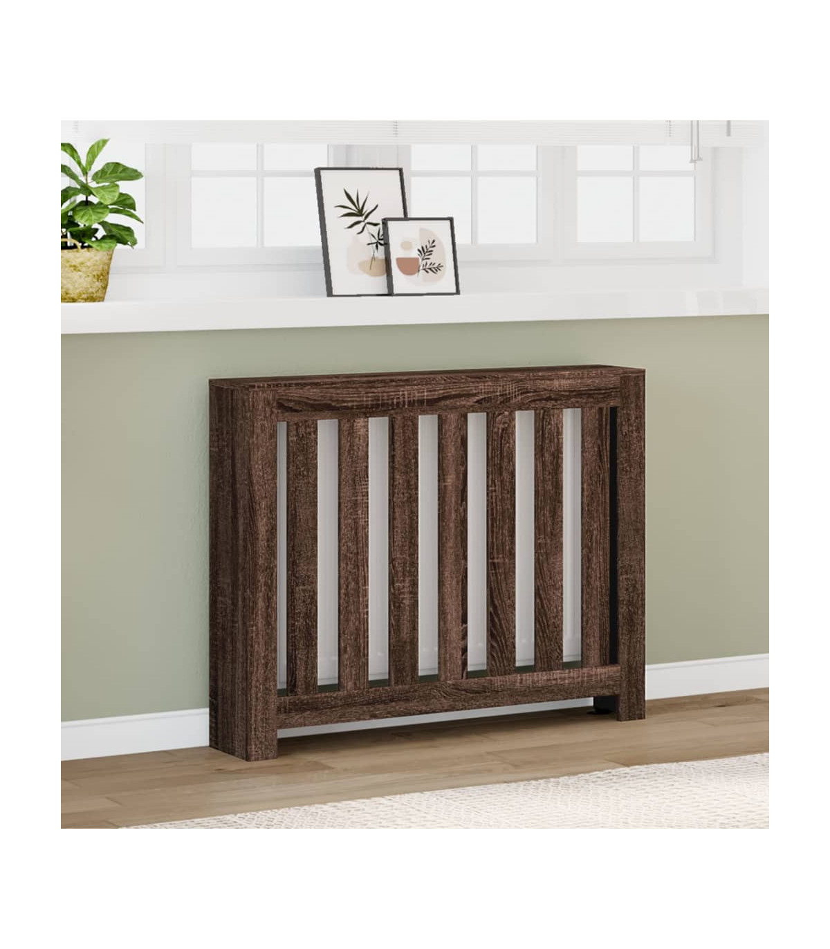 This radiator cover will make a perfect addition to your living room.Long-lasting material: The engineered wood is of exceptional quality with a smooth surface and also features strength, stability, and resistance to moisture.Modern appearance: The radiator cover cabinet has a modern, slatted design that suits any decor. It will make a stylish and practical addition to your living room.Easy to maintain: Thanks to its smooth surface, the cover is easy to clean with a damp cloth and requires less maintenance.Practical shelf: This radiator cover is designed to give your radiator a decorative function and some additional shelf space for photo frames, books, ornaments, etc. Warning:To prevent it from tipping over, this product must be used with the provided wall attachment device.