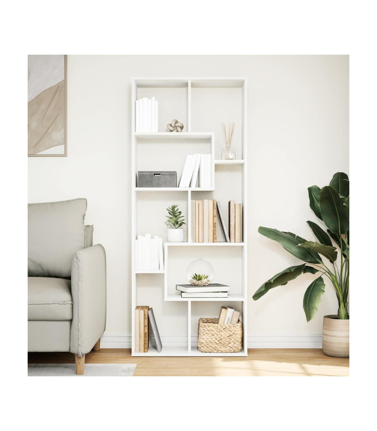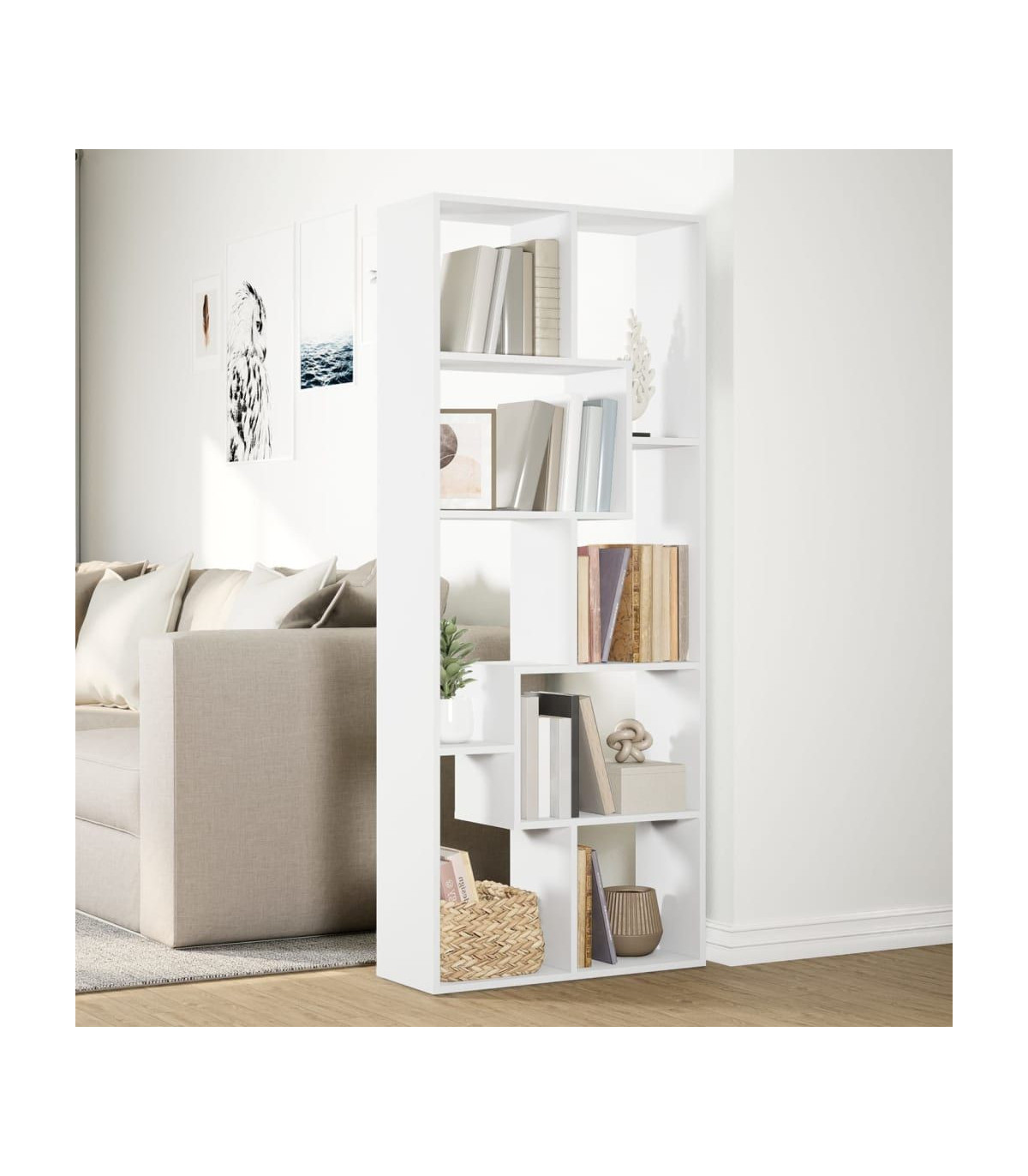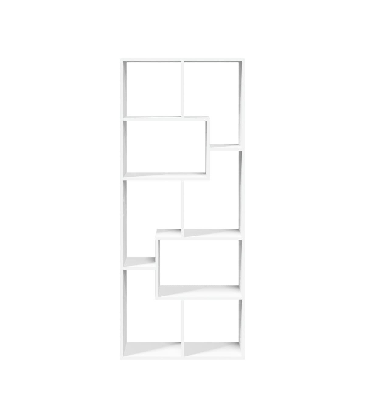 The contemporary room divider bookcase blends a geometric shape design with storage, perfect for organizing your space with style! Stable and durable material: Engineered wood is a durable and stable material with a smooth surface that is resistant to moisture, warping, and splitting, making it a reliable choice for various projects.Ample storage: With compartments of varying sizes, this shelf offers flexible storage options for items of different shapes and sizes.Flexible placement options: The shelving unit can be positioned with either its width or height on the ground, offering versatile room layout options.Versatile applications: The shelving unit can also be used as a room divider, easily fitting into any style of room. You can place it in the living room to display decoration, in the study to store books and documents, in the bedroom to store everyday items, and in the basement to store bits and bobs.Easy maintenance: Thanks to its smooth surface, the storage bookcase is easy to clean with a damp cloth and requires less maintenance. Warning:To prevent it from tipping over, this product must be used with the provided wall attachment device. Good to know:Screws and plugs for inside the wall are not included. We advise to find and use screws and plugs suitable specifically for your walls. If you're not sure, you can consult with a professional. Please read and follow each step of the instructions.