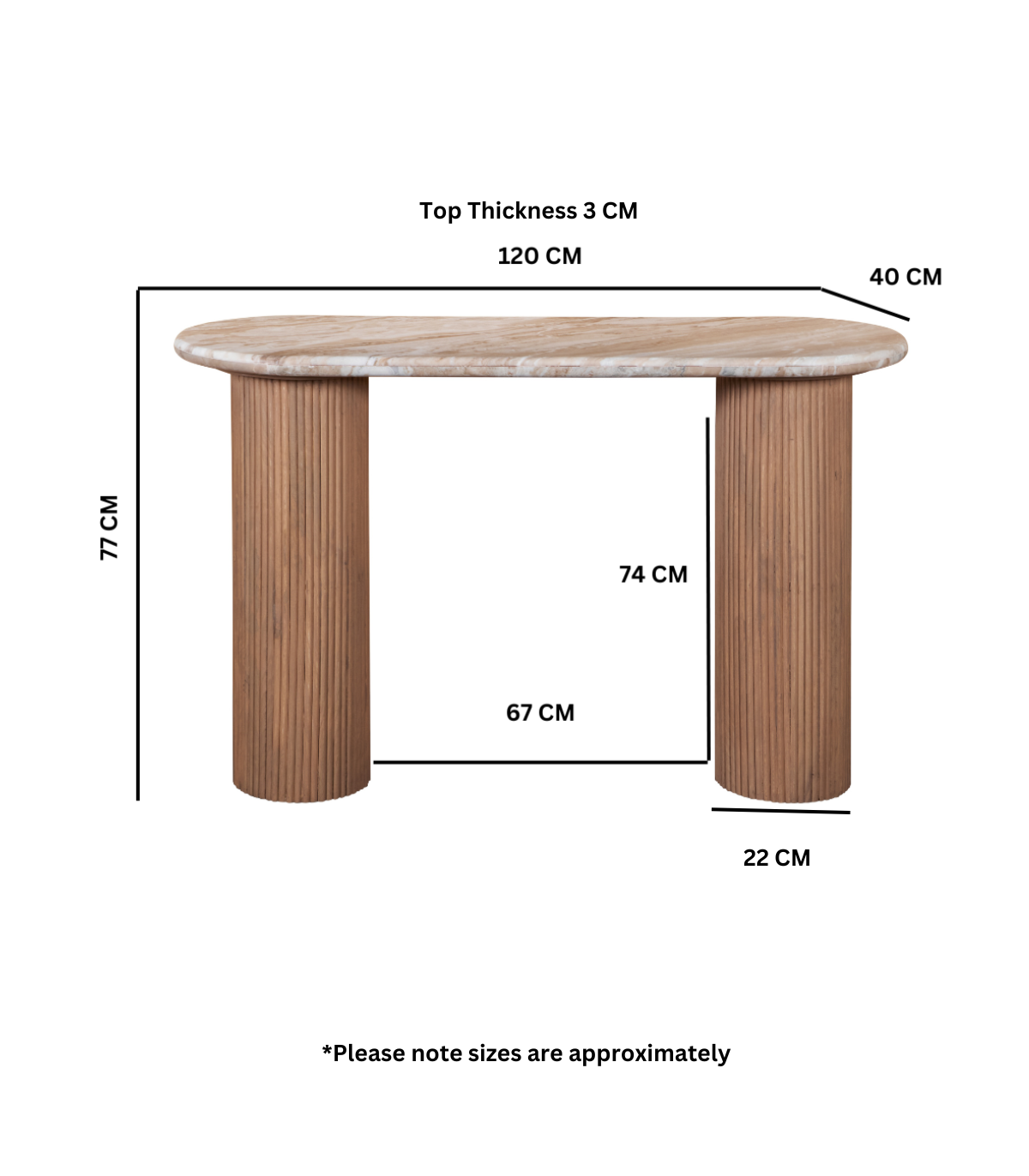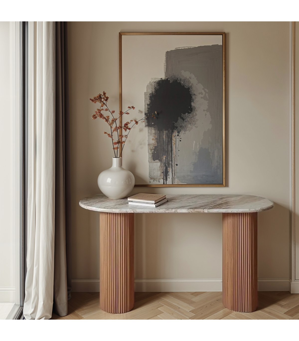 Elevate your interior with this exquisite console table, a perfect blend of natural elegance and modern design. Standing at a height of 77 cm, with a width of 120 cm and a depth of 40 cm, this console table is an ideal addition to your hallway or living space. The table features a luxurious marble top in a sophisticated pale taupe color, complemented by sturdy mango wood legs. The lacquered finish enhances its natural beauty, making it a standout piece in any setting. Partial assembly is required, ensuring a seamless setup. This console table does not include a removable shelf, maintaining its sleek and minimalist design. Material - Marble, Asshmebly - Partial, Collection Name - Ashford
