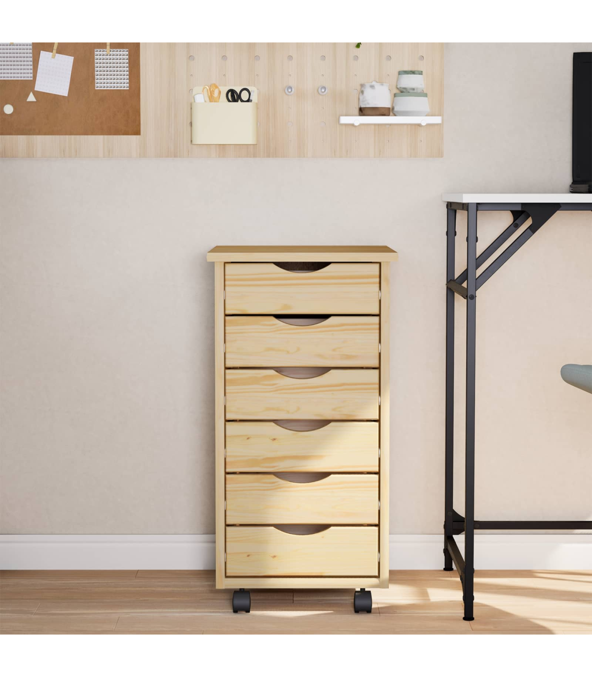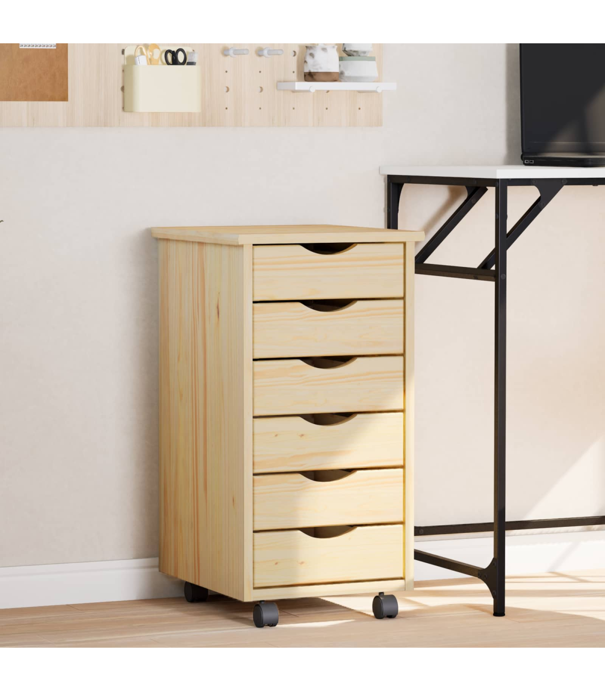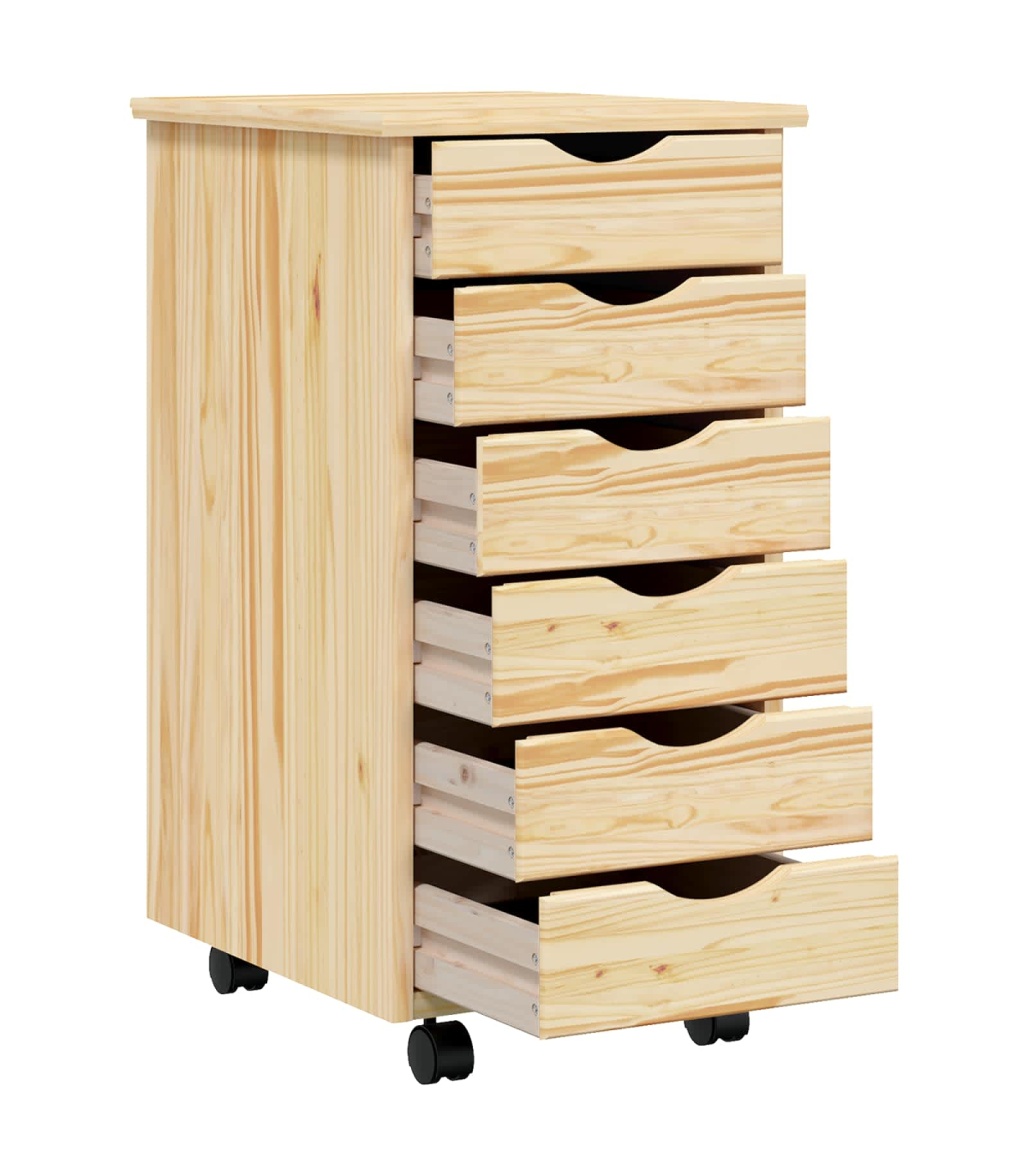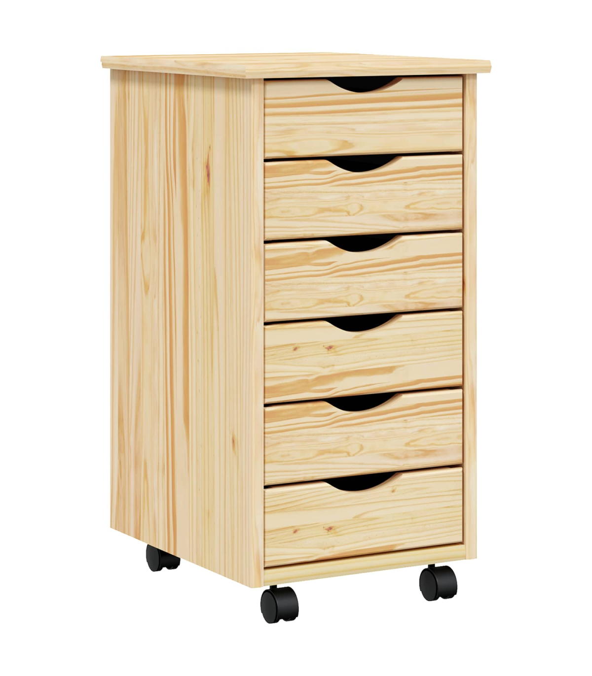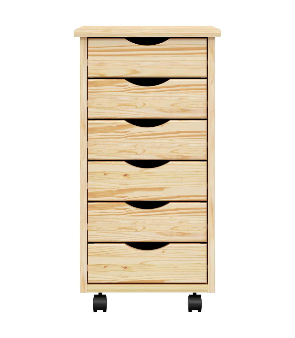 This Modern Rolling Cabinet with Drawers offers a stylish and practical solution for storage needs in any home or office setting. Boasting a contemporary design with clean lines, it seamlessly integrates into a variety of room decors. Whether you're looking to de-clutter your living room, bedroom, or home office, this cabinet provides ample space, making it the perfect essential for keeping your areas tidy and organized. Solid Pine Wood: Crafted from quality solid pine wood, this cabinet ensures long-lasting use, offering both strength and elegance. Its sturdy constitution promises to hold up to daily wear without compromising on aesthetics or integrity. Edge Pulls: Equipped with sleek edge pulls, this cabinet maintains a minimal exterior while ensuring practical functionality. The designed pulls offer a comfortable grip and a streamlined look that aligns perfectly with modern style . Versatile Casters: The lockable wheels provide the convenience of mobility without unwanted movements. This enables easy repositioning whether in a living room, bedroom, or office, further amplifying its functional appeal. Spacious Drawers: Featuring numerous drawers, this rolling cabinet offers sufficient storage capacity for a variety of items, from files and office supplies to clothing or accessories. Its organizational structure helps maintain neatness by offering dedicated spaces for diverse contents. Screwdriver Assembly: Requires assembly using a screwdriver by two individuals. This straightforward assembly process makes it accessible for most users, ensuring a quick setup without professional help.