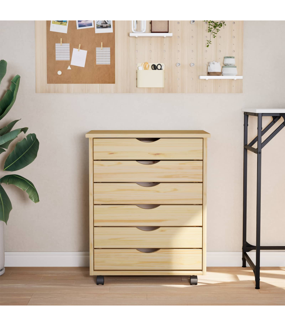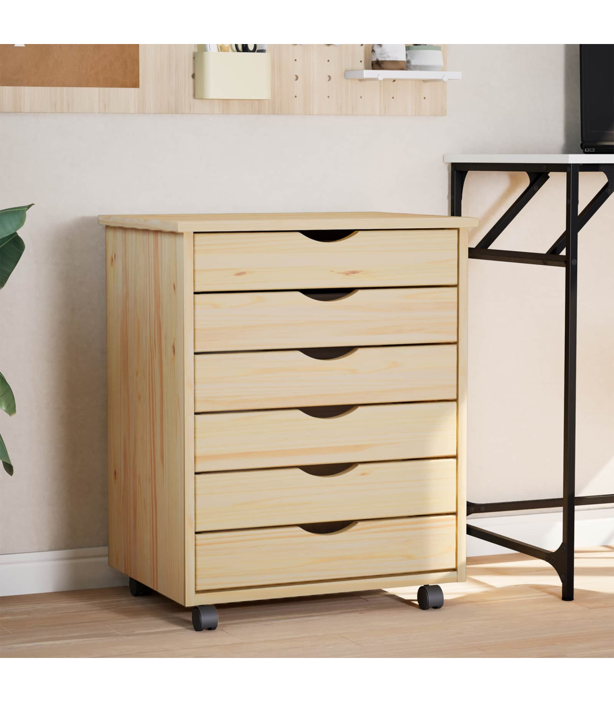 This Modern Rolling Cabinet with Drawers offers a stylish and practical solution for storage needs in any home or office setting. Boasting a contemporary design with clean lines, it seamlessly integrates into a variety of room decors. Whether you're looking to de-clutter your living room, bedroom, or home office, this cabinet provides ample space, making it the perfect essential for keeping your areas tidy and organized. Solid Pine Wood: Crafted from quality solid pine wood, this cabinet ensures long-lasting use, offering both strength and elegance. Its sturdy constitution promises to hold up to daily wear without compromising on aesthetics or integrity. Edge Pulls: Equipped with sleek edge pulls, this cabinet maintains a minimal exterior while ensuring practical functionality. The designed pulls offer a comfortable grip and a streamlined look that aligns perfectly with modern style . Versatile Casters: The lockable wheels provide the convenience of mobility without unwanted movements. This enables easy repositioning whether in a living room, bedroom, or office, further amplifying its functional appeal. Spacious Drawers: Featuring numerous drawers, this rolling cabinet offers sufficient storage capacity for a variety of items, from files and office supplies to clothing or accessories. Its organizational structure helps maintain neatness by offering dedicated spaces for diverse contents. Screwdriver Assembly: Requires assembly using a screwdriver by two individuals. This straightforward assembly process makes it accessible for most users, ensuring a quick setup without professional help.