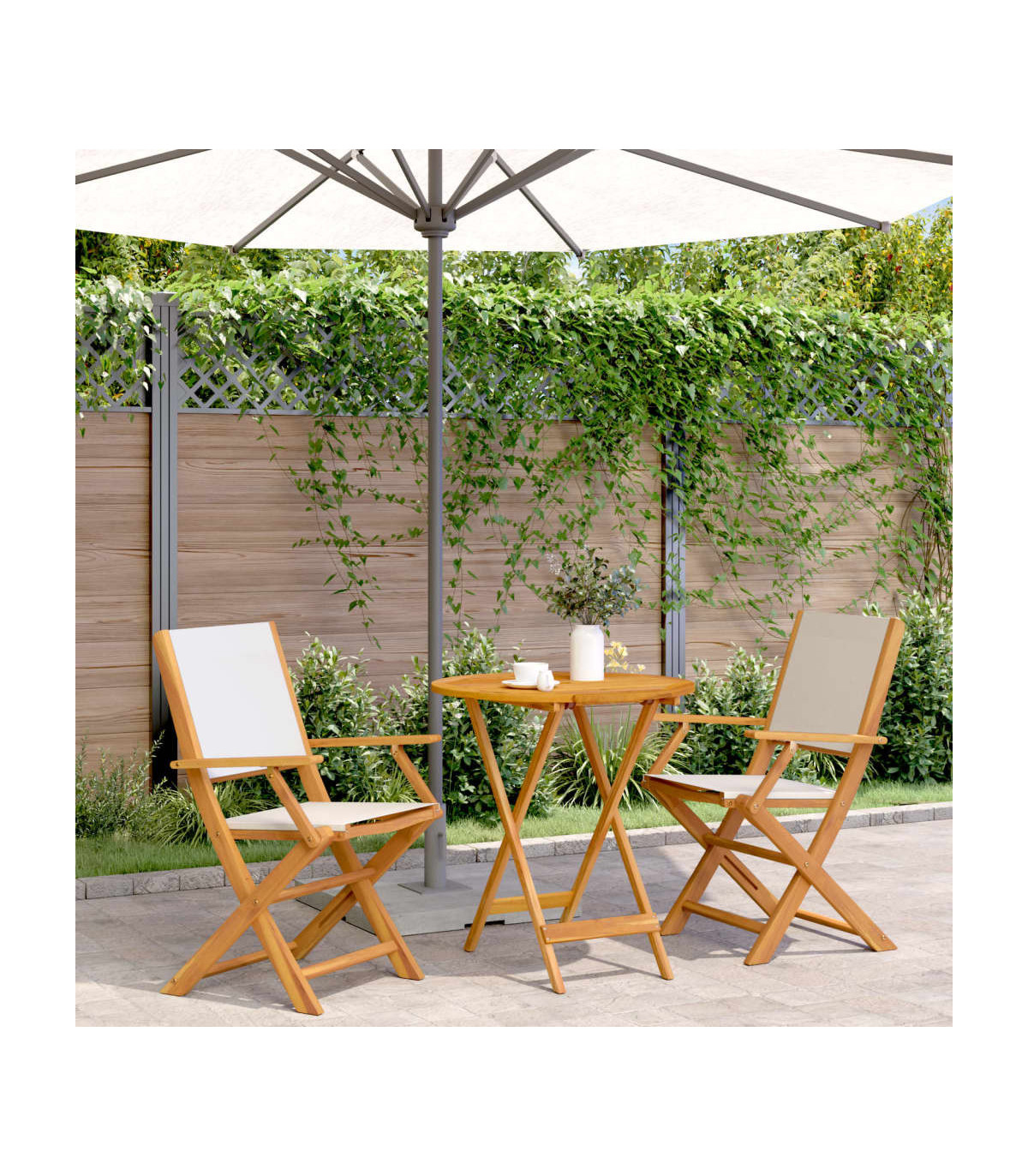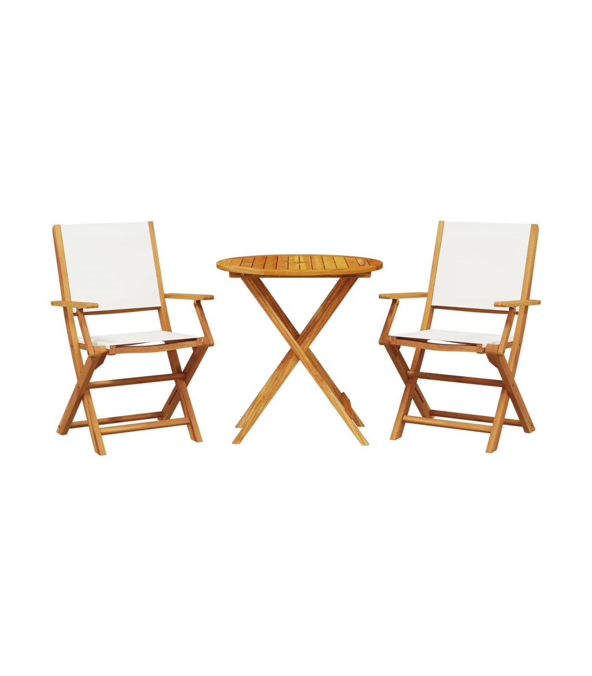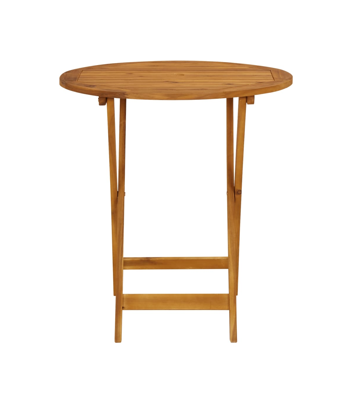 Enjoy a cup of coffee or have a chat with your family and friends in the garden, backyard, or on the balcony with this bistro set! Robust and stable: Solid acacia wood is known for its strength and durability. Its diverse colours and unique grain patterns give it an attractive appearance. With good stability and resistance to weathering, it is ideal for crafting indoor and outdoor furniture.Practical design: The practical and flat wooden handrail allows you to rest your hands on it while enjoying your outdoor time.Sturdy tabletop: The outdoor table offers excellent support for holding your drinks, snacks, fruit baskets, and your favourite decorations.Foldable design: The outdoor dining table and chairs can be easily folded away when not in use, for easy storage and transportation. Good to know:To make sure your outdoor furniture stays beautiful, we recommend protecting it with a waterproof cover.