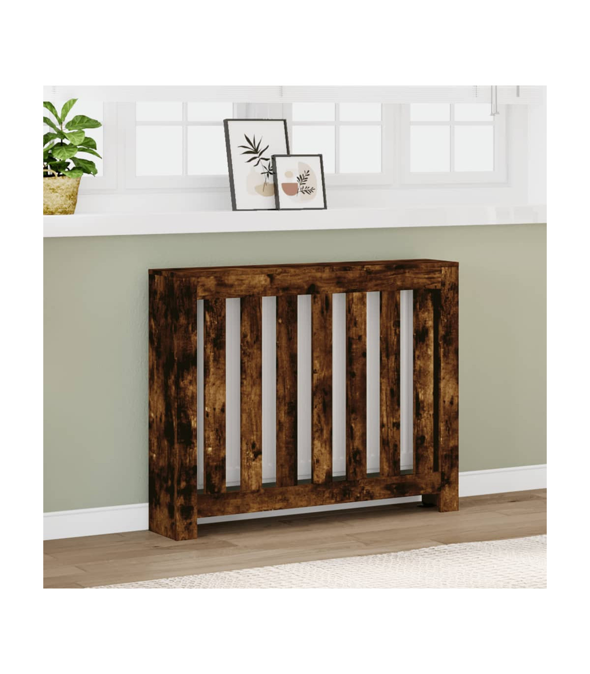 This radiator cover will make a perfect addition to your living room.Long-lasting material: The engineered wood is of exceptional quality with a smooth surface and also features strength, stability, and resistance to moisture.Modern appearance: The radiator cover cabinet has a modern, slatted design that suits any decor. It will make a stylish and practical addition to your living room.Easy to maintain: Thanks to its smooth surface, the cover is easy to clean with a damp cloth and requires less maintenance.Practical shelf: This radiator cover is designed to give your radiator a decorative function and some additional shelf space for photo frames, books, ornaments, etc. Warning:To prevent it from tipping over, this product must be used with the provided wall attachment device.