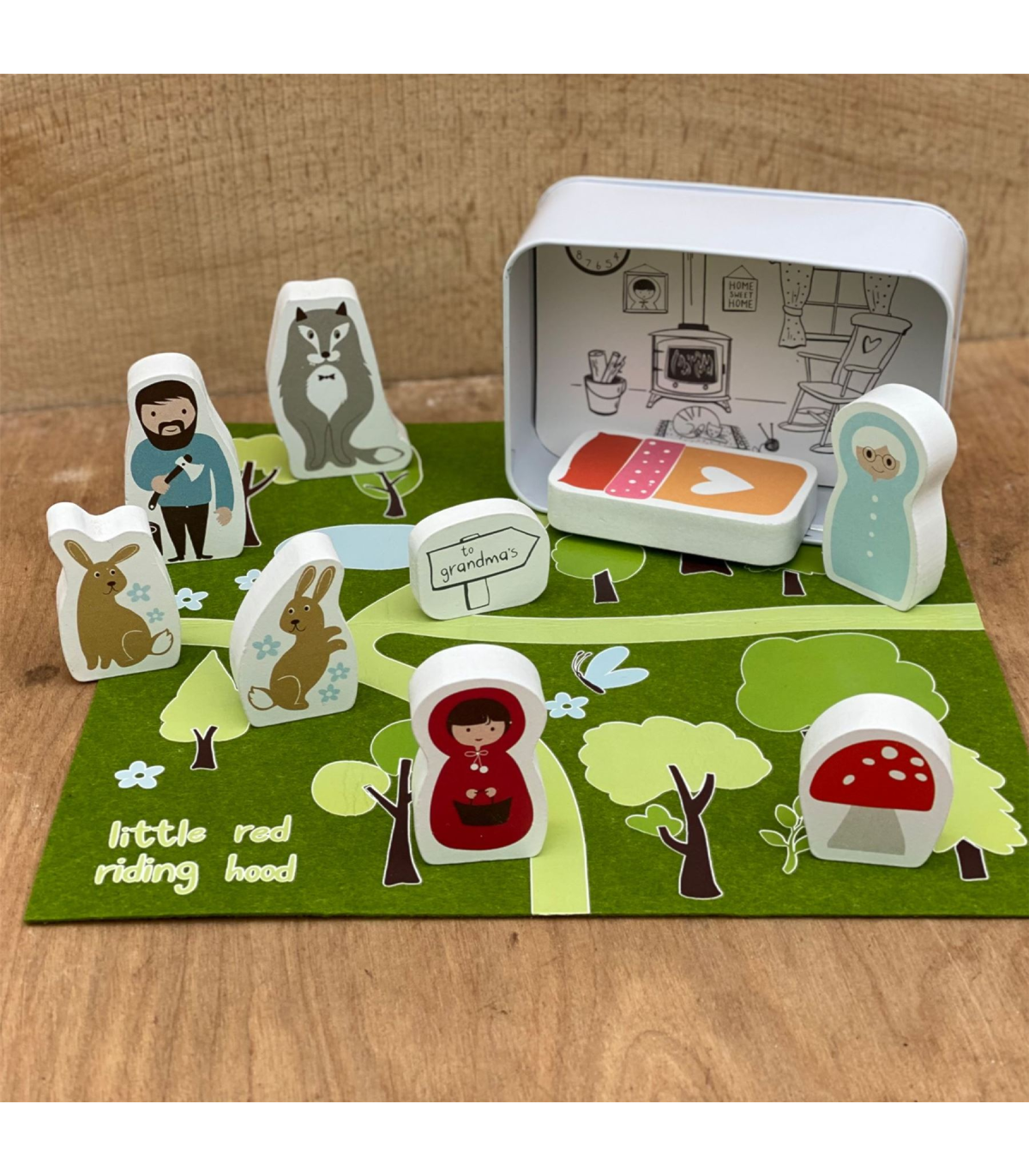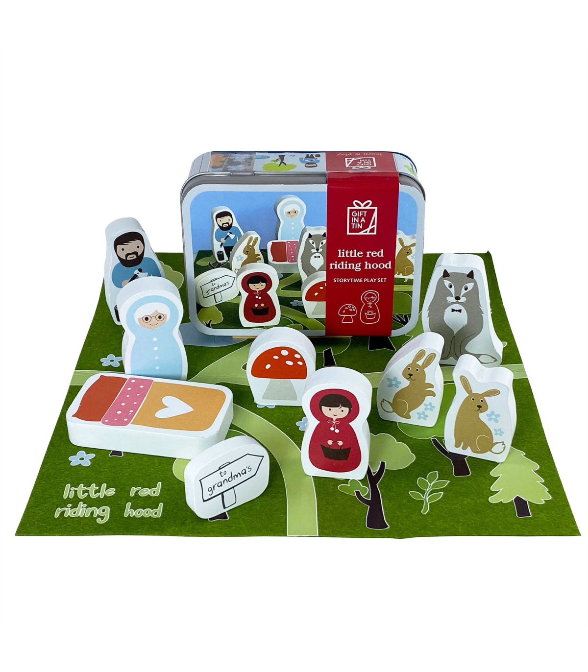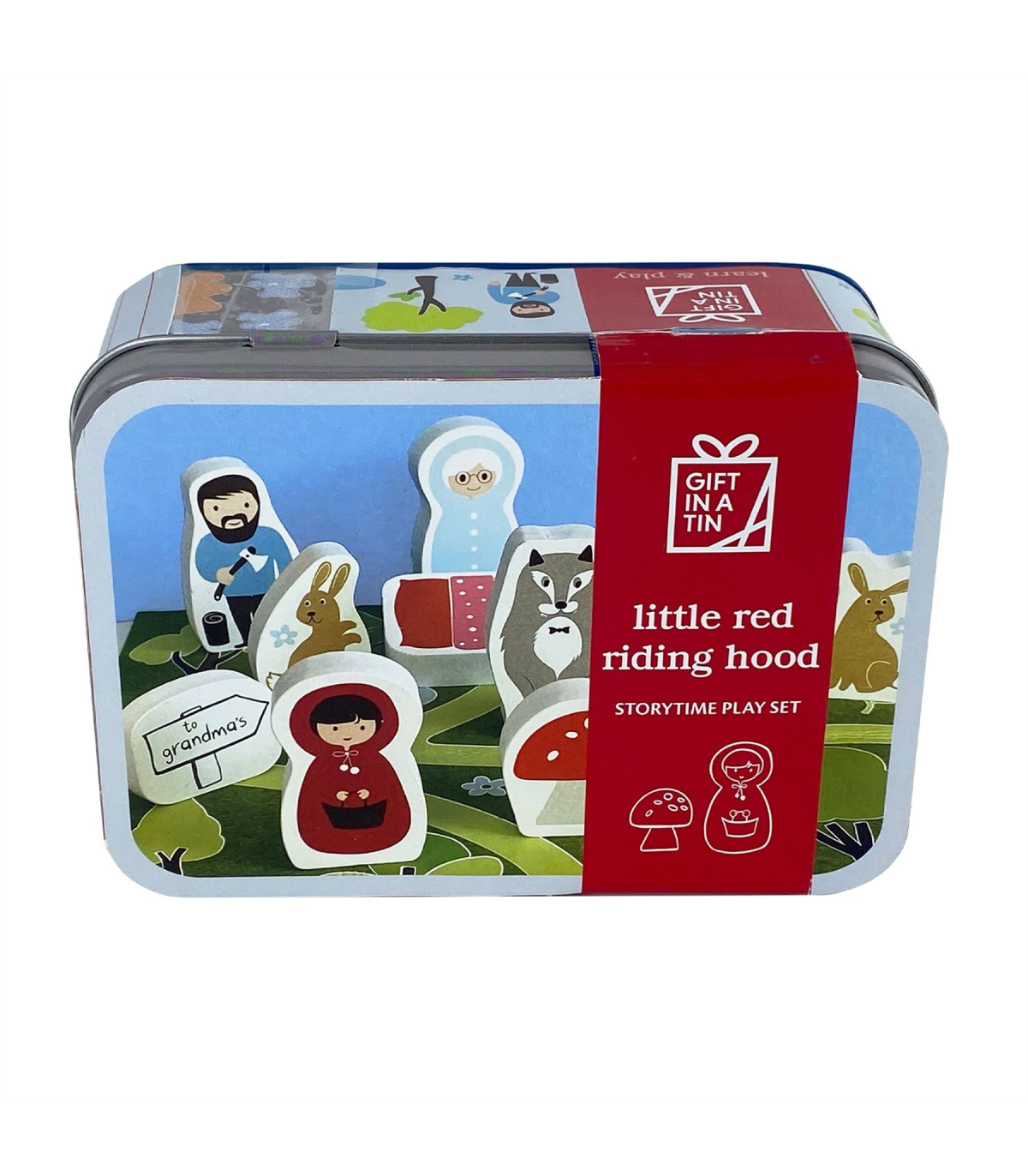 A Storytime Play Set from Gift in a Tin by APPLES TO PEARS�. This adorable set provides hours of storytelling re-enactment for small children with help from Little Red Riding Hood. It includes nine wooden characters and a woodland felt play mat, which can be combined with the other mats within the series for expanded adventures. The play set is safe, durable and stored within its own stylish metal tin which, when combined with the colouring card included, converts into Grandma�s Cottage. The play set is packaged in a tin.