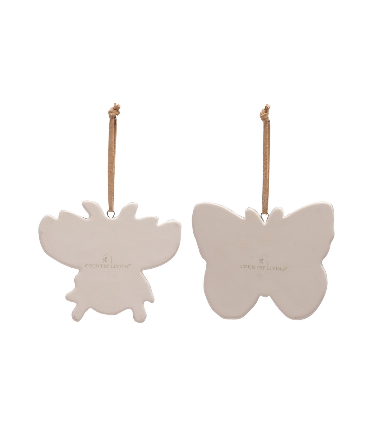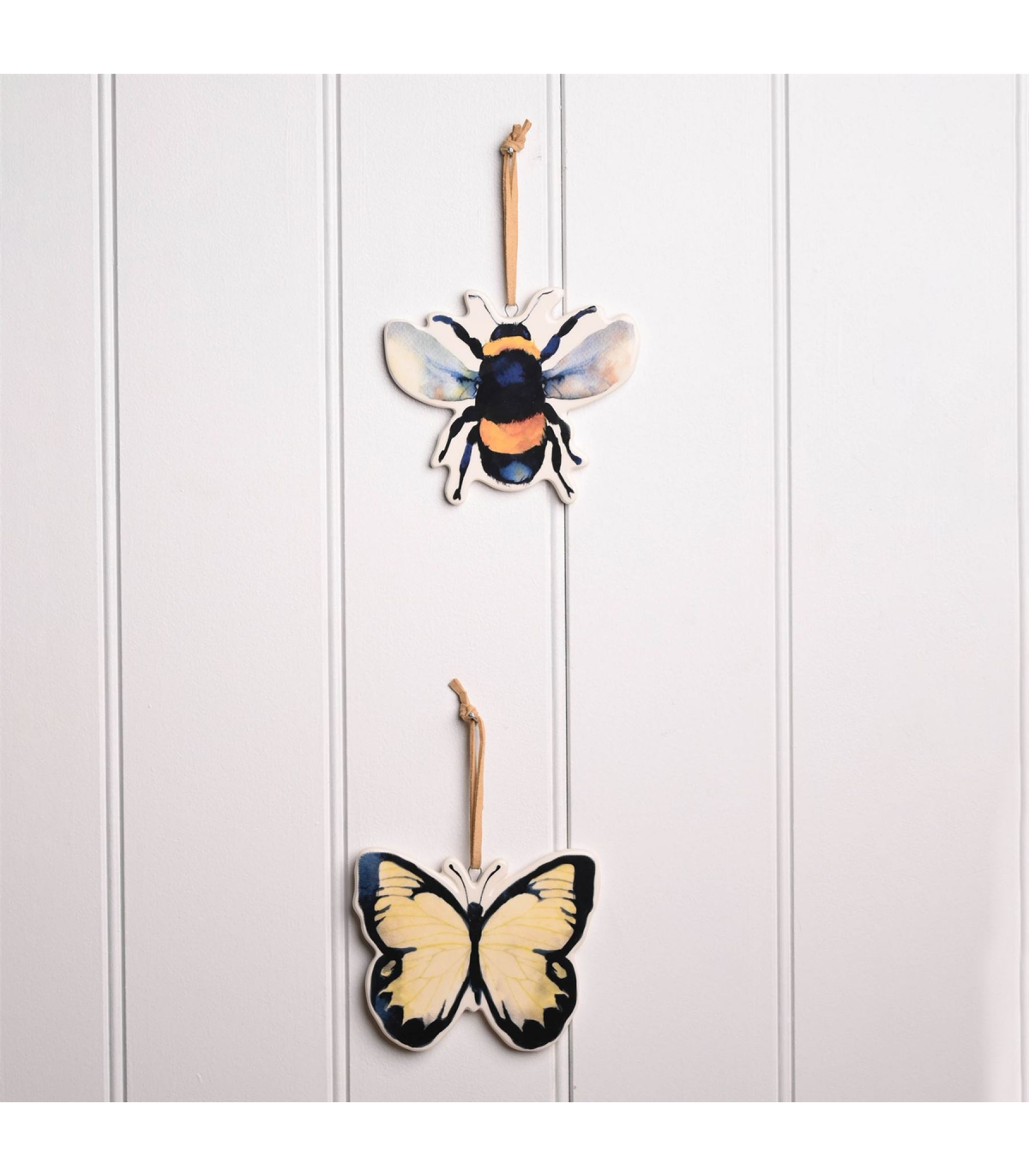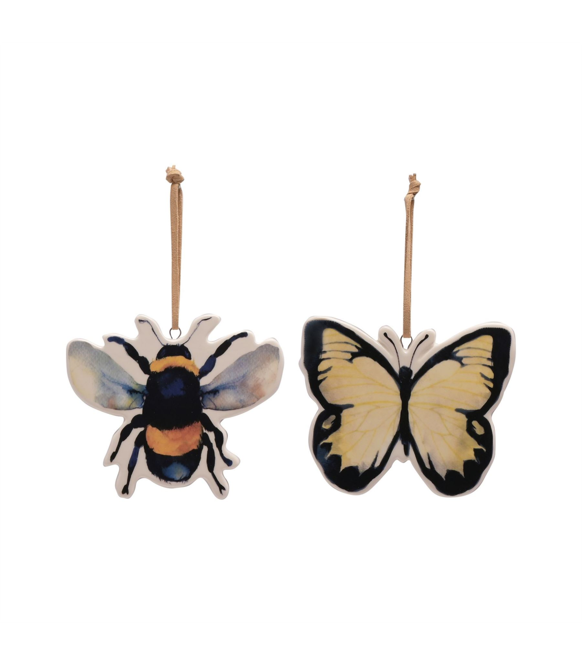 A set of 2 bee and butterfly insect plaques by COUNTRY LIVING�. These gorgeous hanging plaques celebrate wildlife and the wonderful colours of nature. The ceramic plaques showcase a gloss finish, complete with respective insect designs: one bee and one butterfly. They are designed to be displayed using the attached suede hangers. The plaques are packaged in a brown box multi.