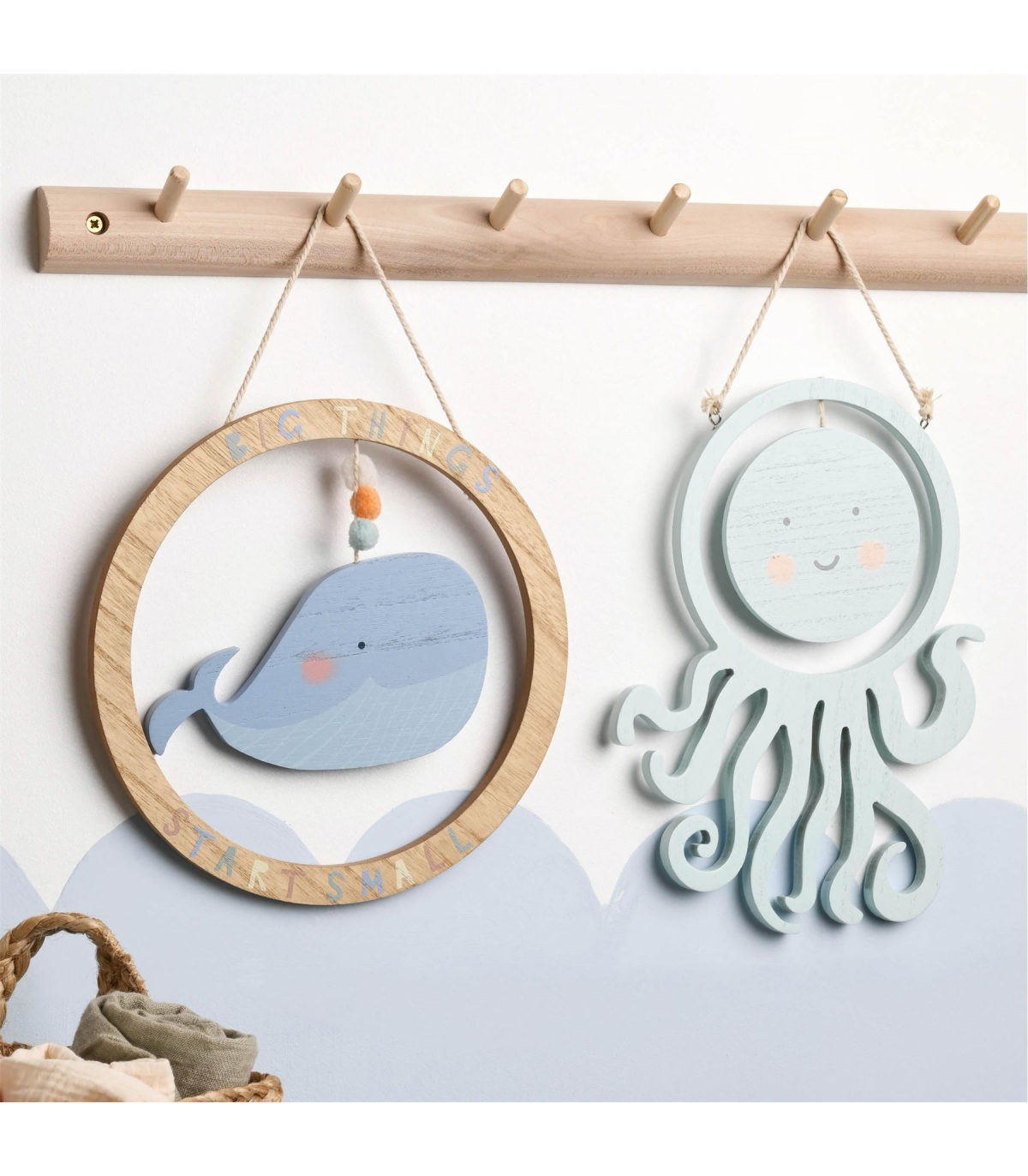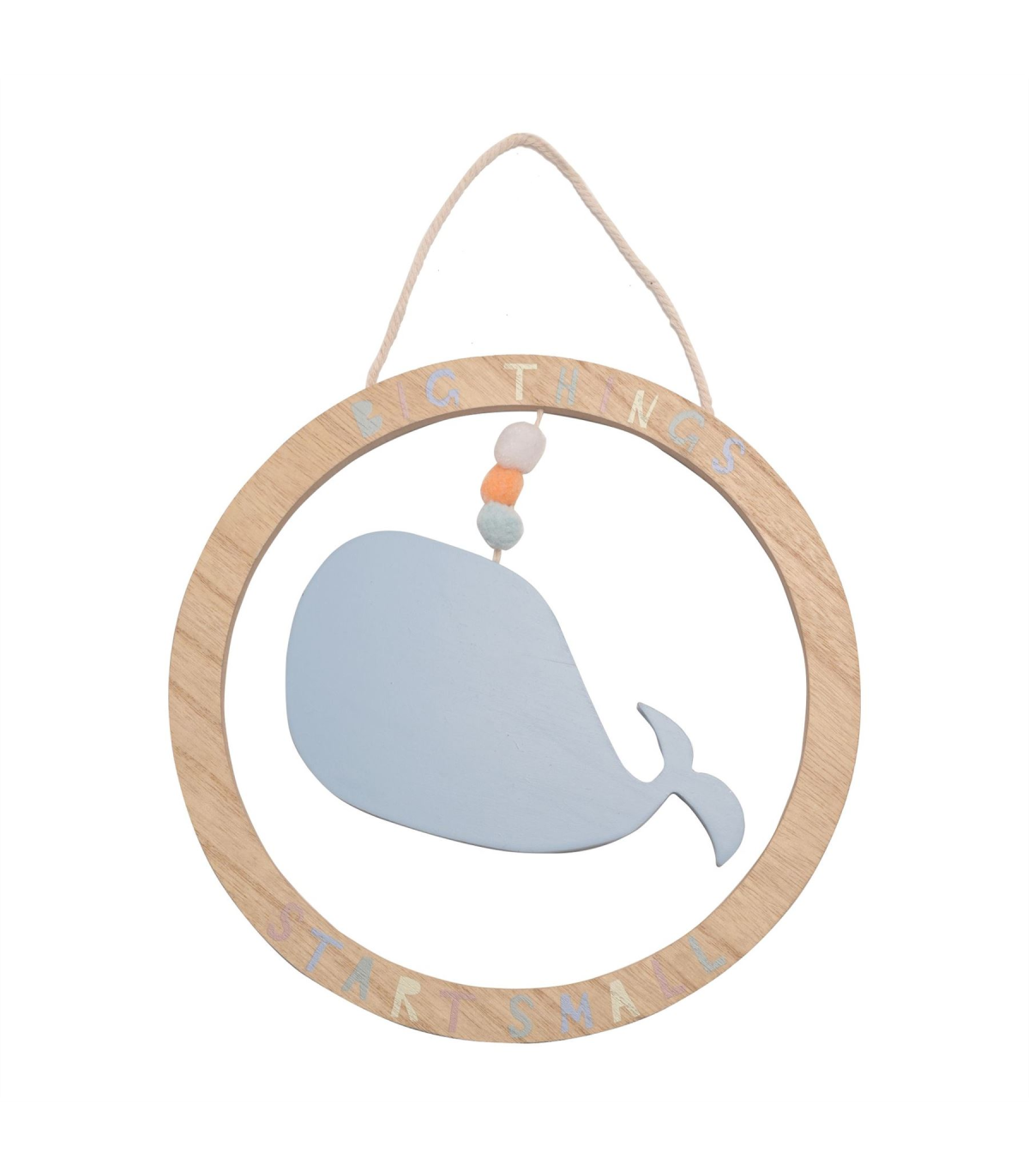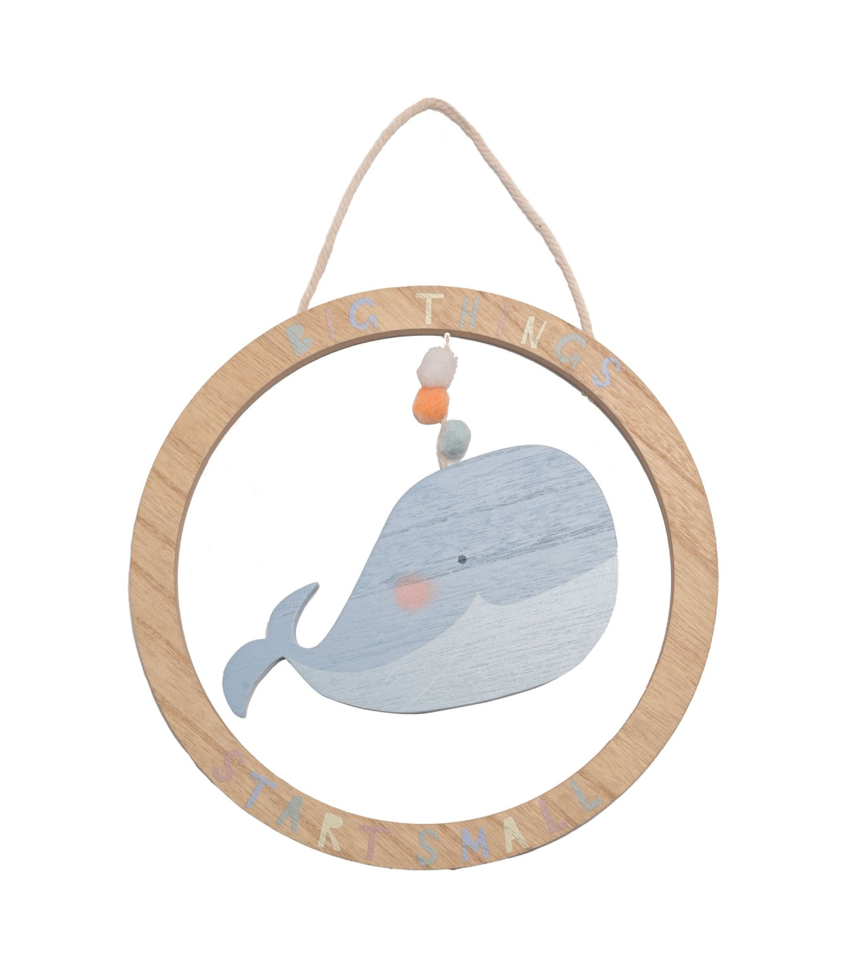 A wooden whale plaque from Petit Cheri by CELEBRATIONS�. This heart-warming plaque provides both inspiration and decoration for children�s bedrooms. The wooden ring plaque showcases a colourful �Big Things Start Small� title. Inside hangs a large, blue wooden whale, complete with pom pom decorations and string hanger. The plaque is packaged in a 4c repeat pattern box.